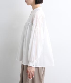 身頃から袖の切り替え部分にたっぷりとギャザーをほどこし、袖口のシャーリングでふんわりとしたシルエットに仕上げました。なじみのいいくるみボタンでクラシカルな印象も。前あきなので汗ばむ季節の冷房対策として羽織っても◎。