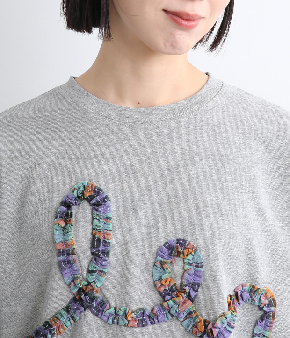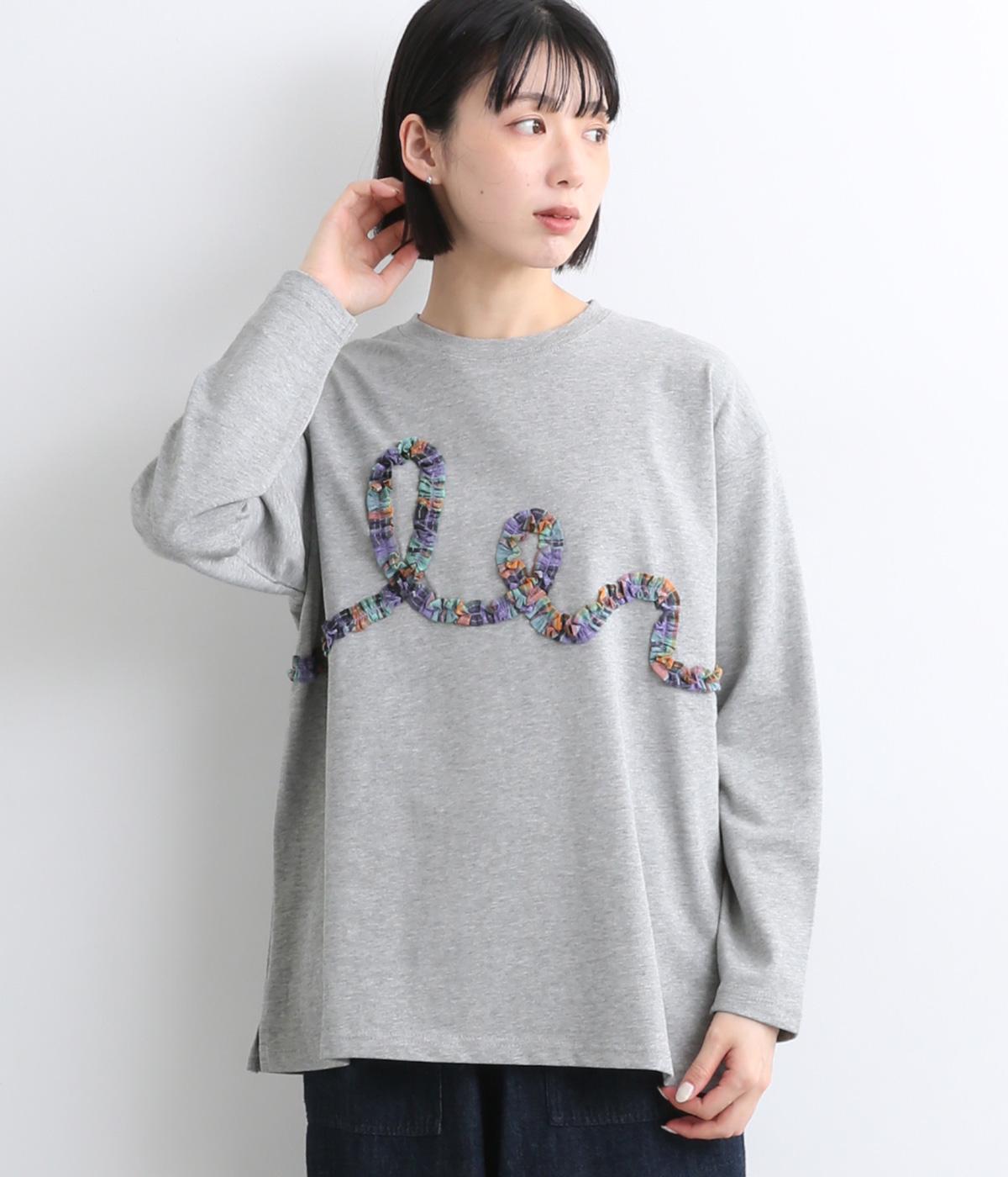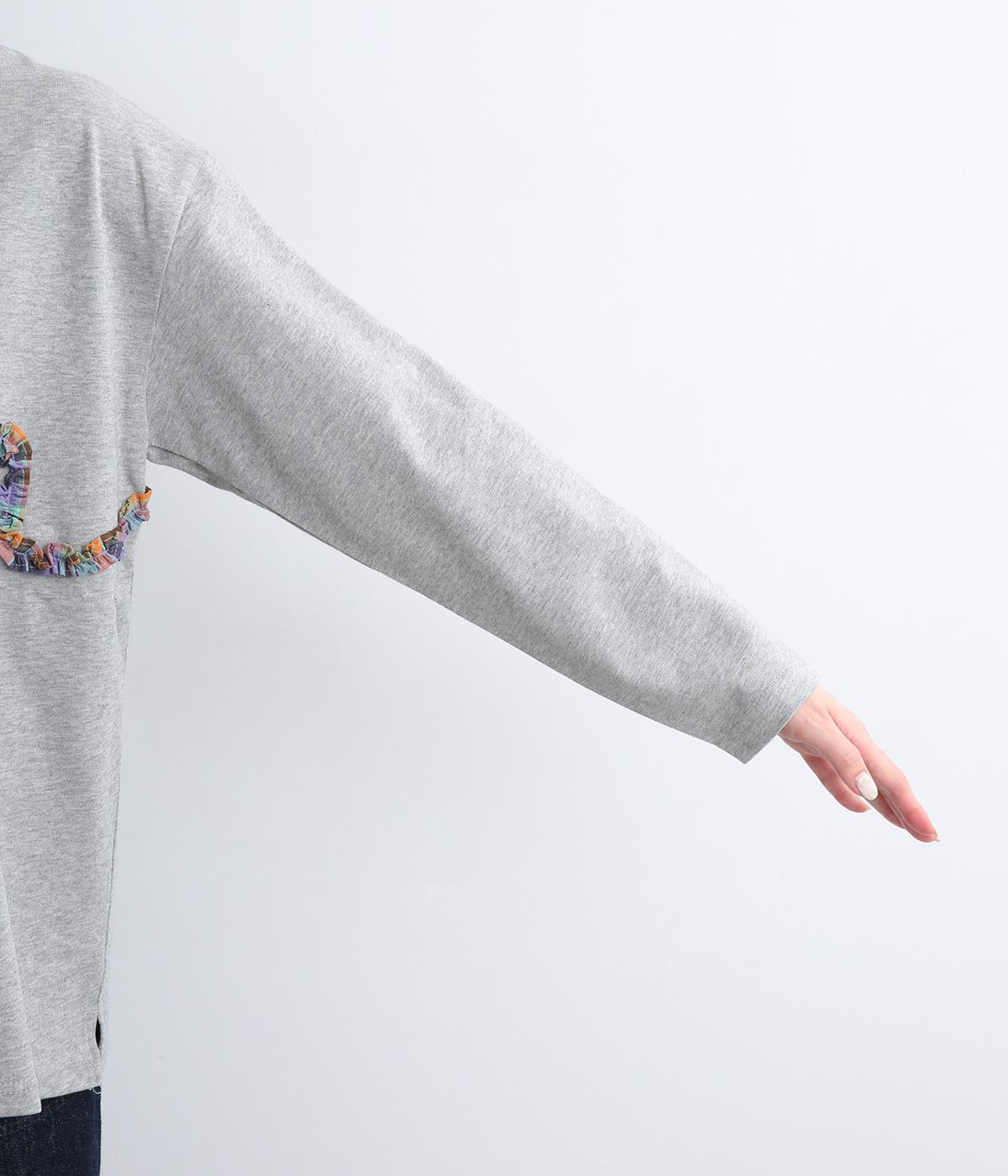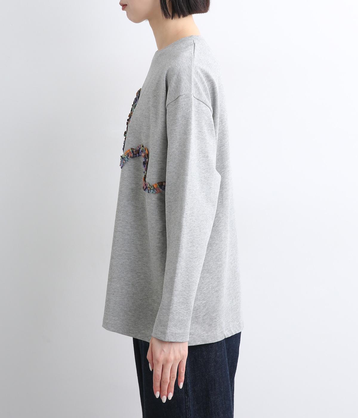チェック柄のフリルを無造作な紐のようにあしらったデザインが印象的で目を惹きます。ややゆったりとしたメンズライクなサイズ感で、特徴のあるデザインもラフに着こなせます。袖口はリブを配さずにあえてすっきりとさせました。