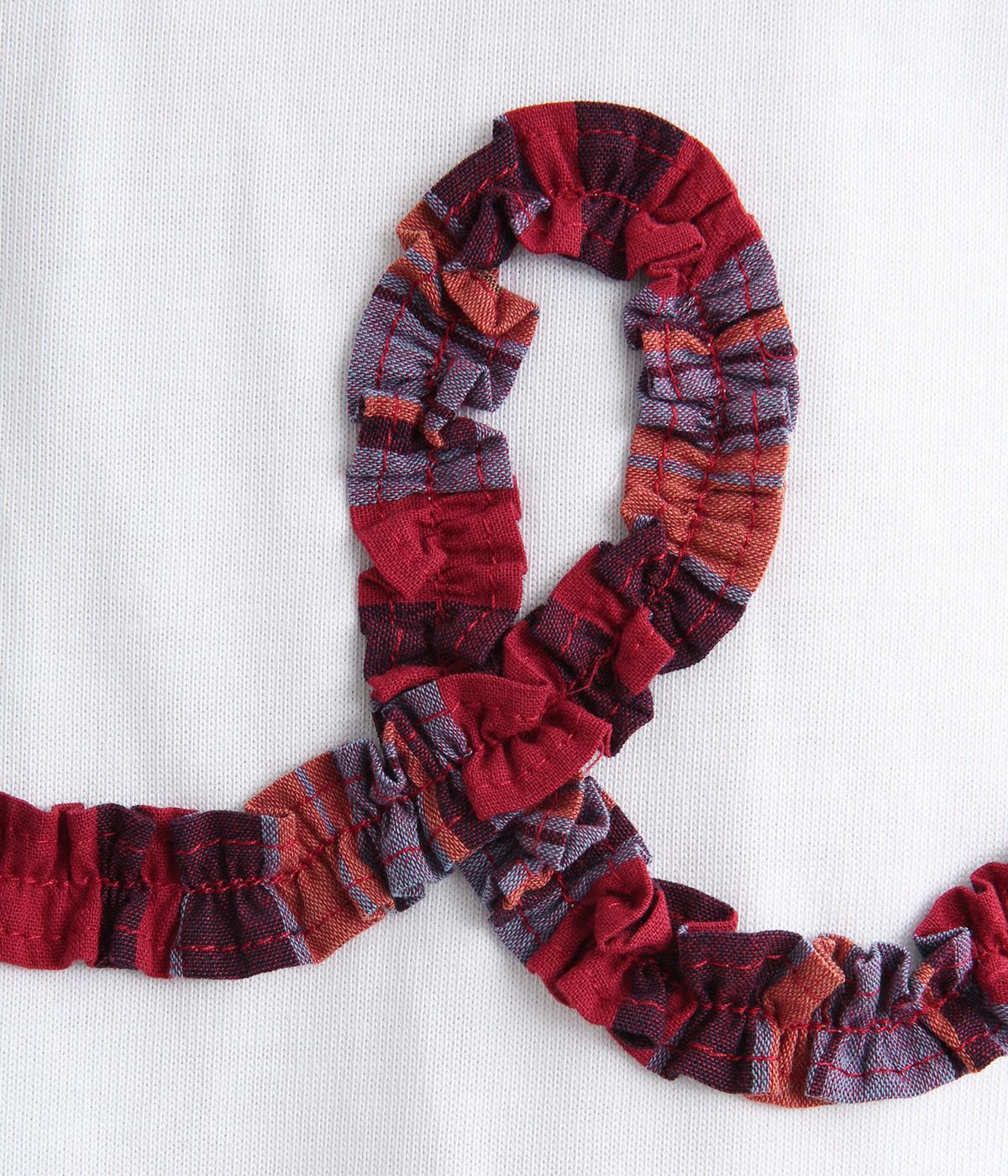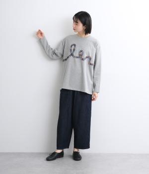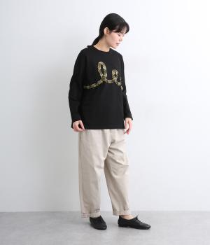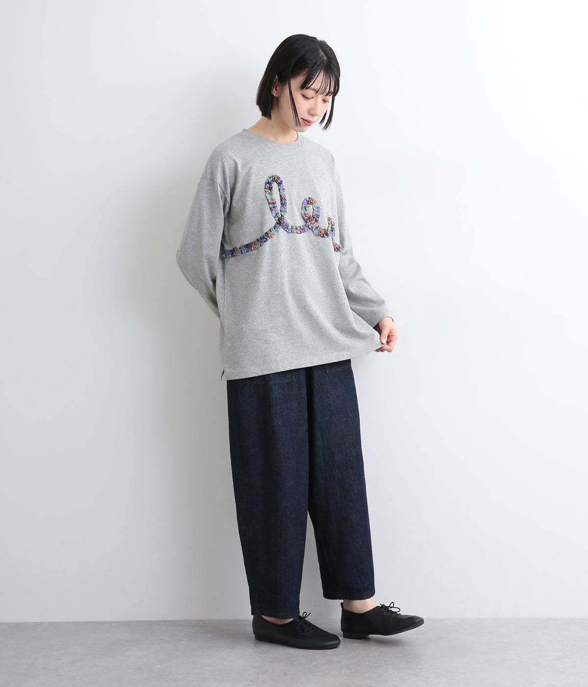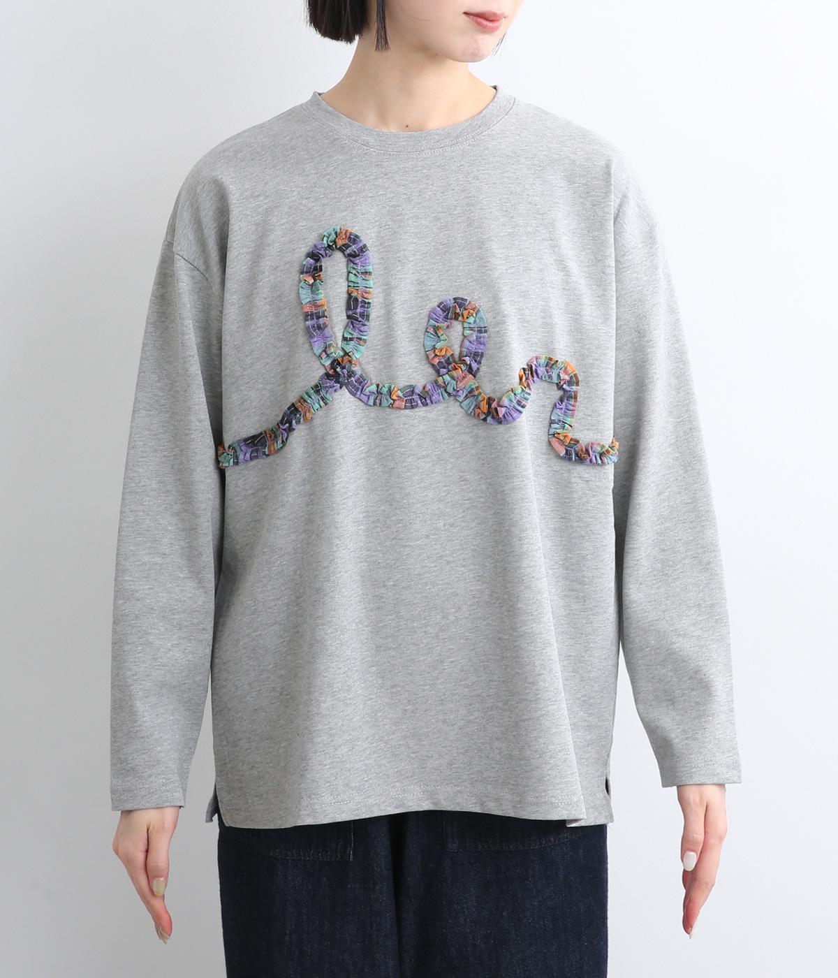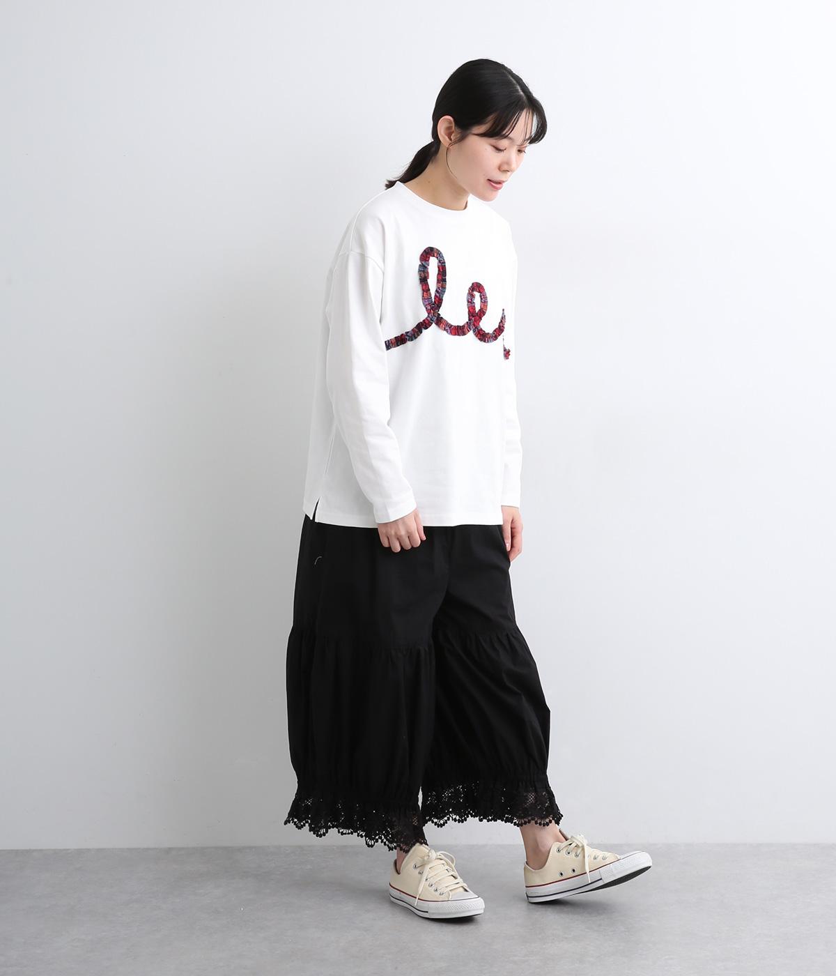 チェック柄のフリルを無造作な紐のようにあしらったデザインが印象的で目を惹きます。ややゆったりとしたメンズライクなサイズ感で、特徴のあるデザインもラフに着こなせます。袖口はリブを配さずにあえてすっきりとさせました。