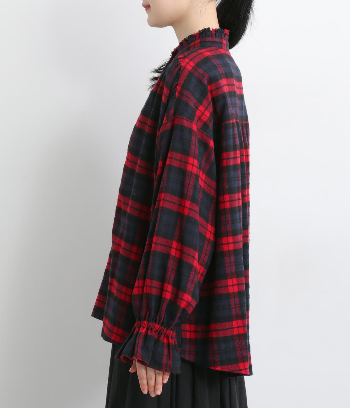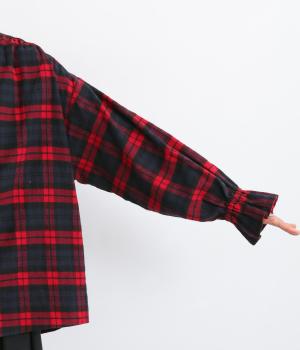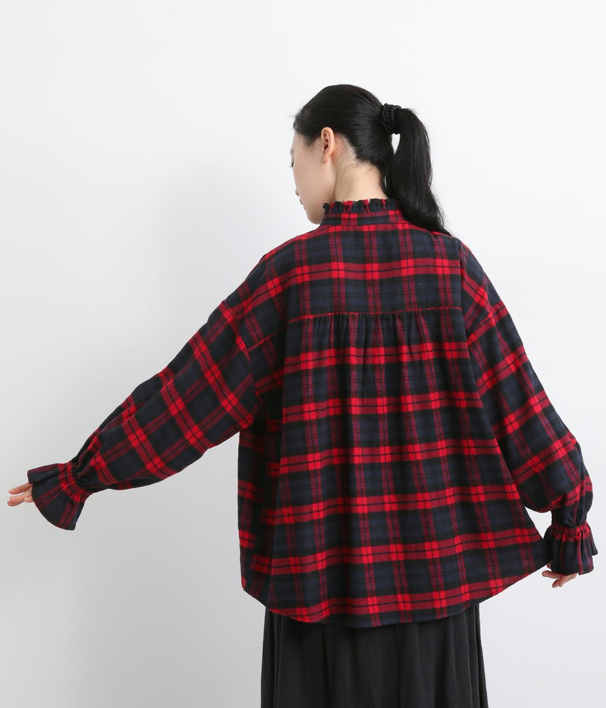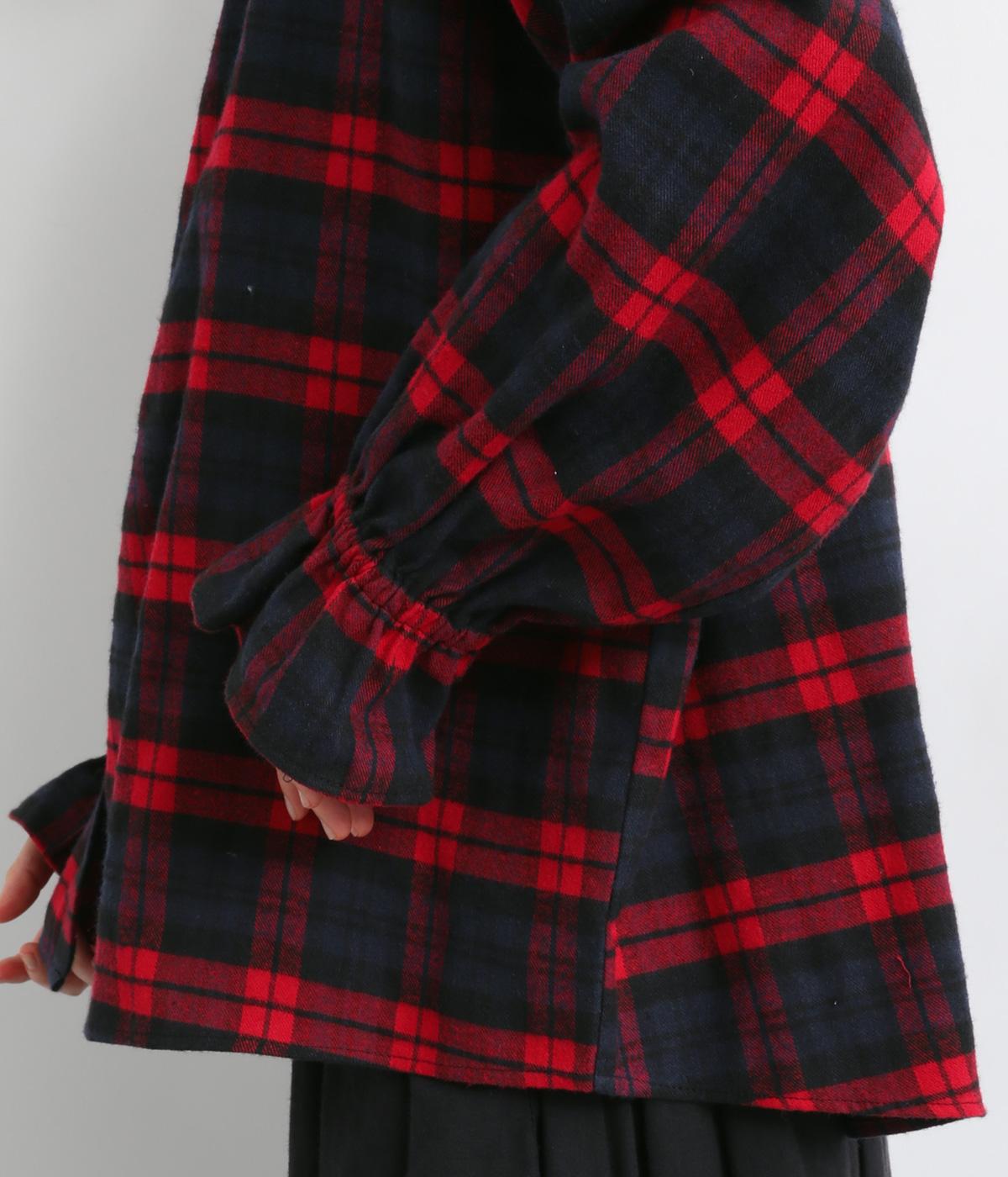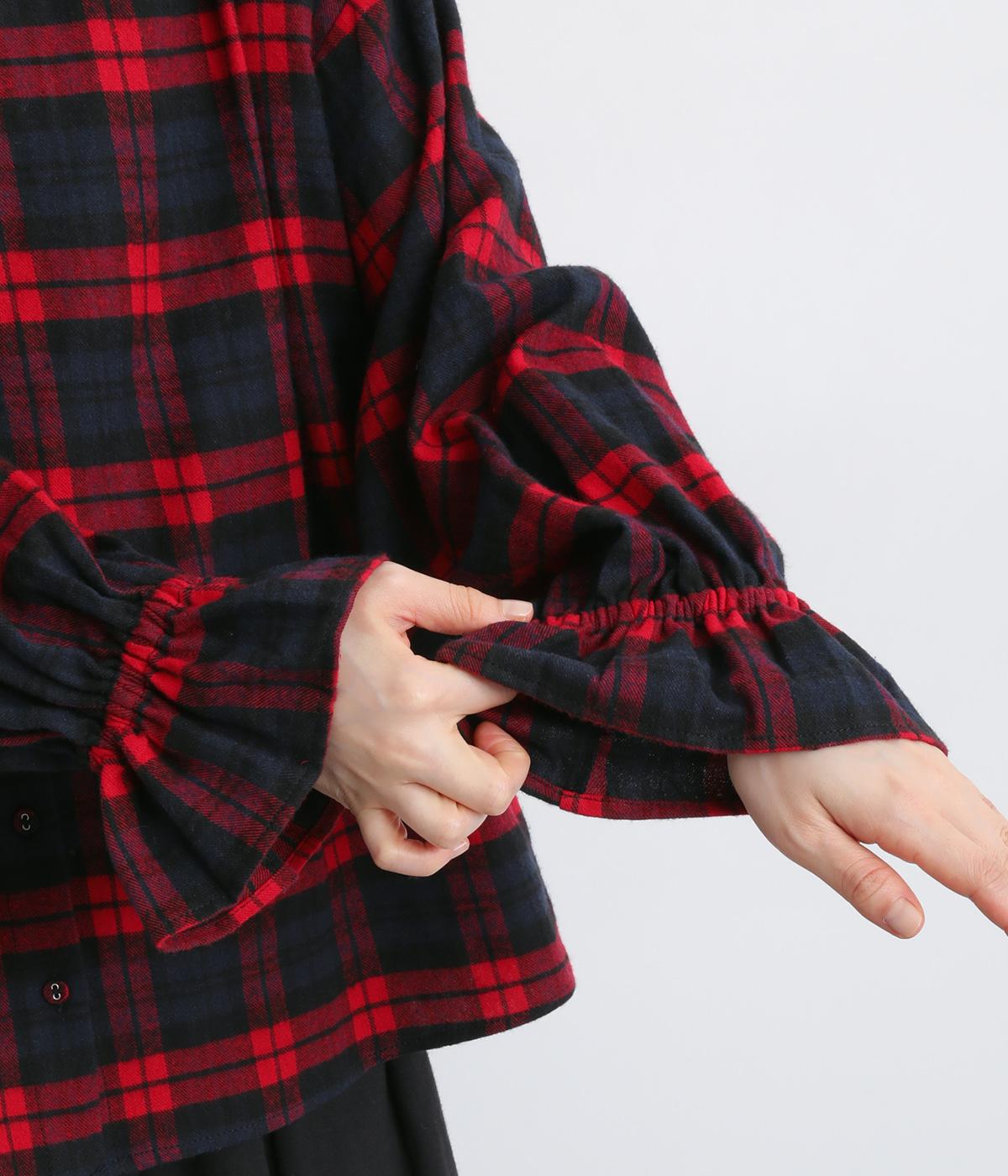 フリルカラーとキャンディスリーブが目をひくブラウスです。背中にはタックをほどこし、ふんわりしたシルエットに仕上がりました。カジュアルなチェック柄に女性らしさを散りばめた一枚。袖口はゴム仕様で、袖丈のアレンジも自在です。