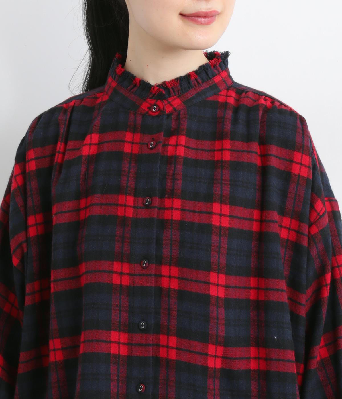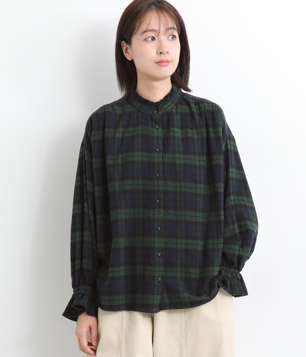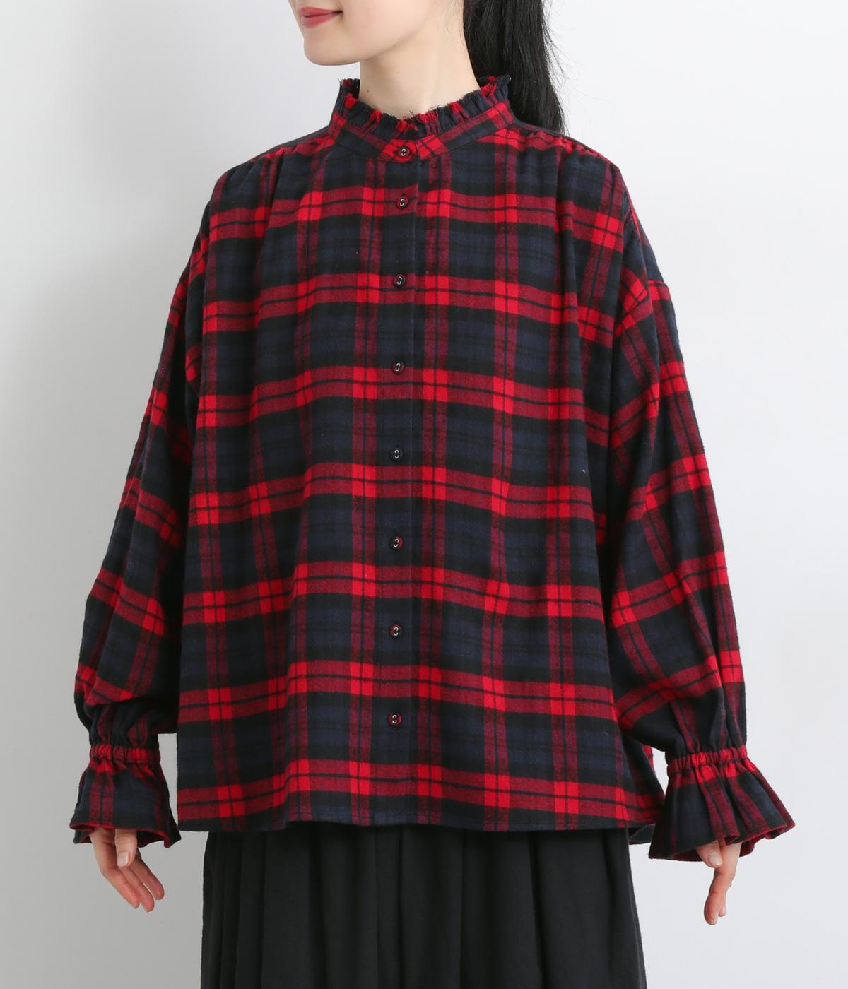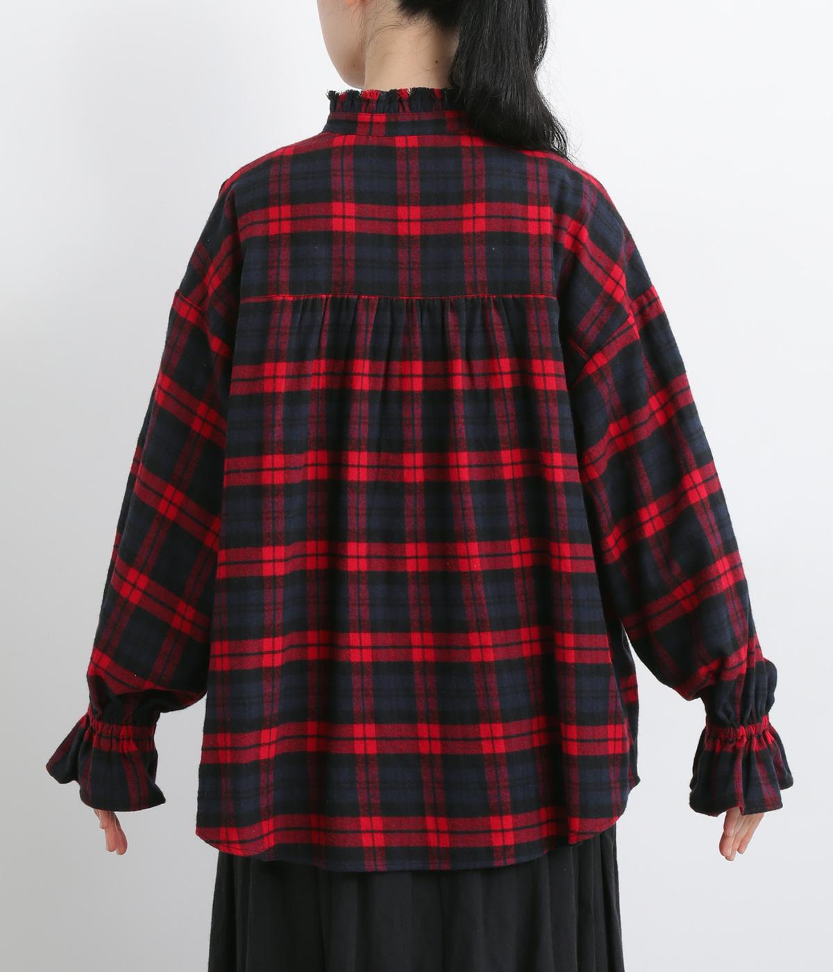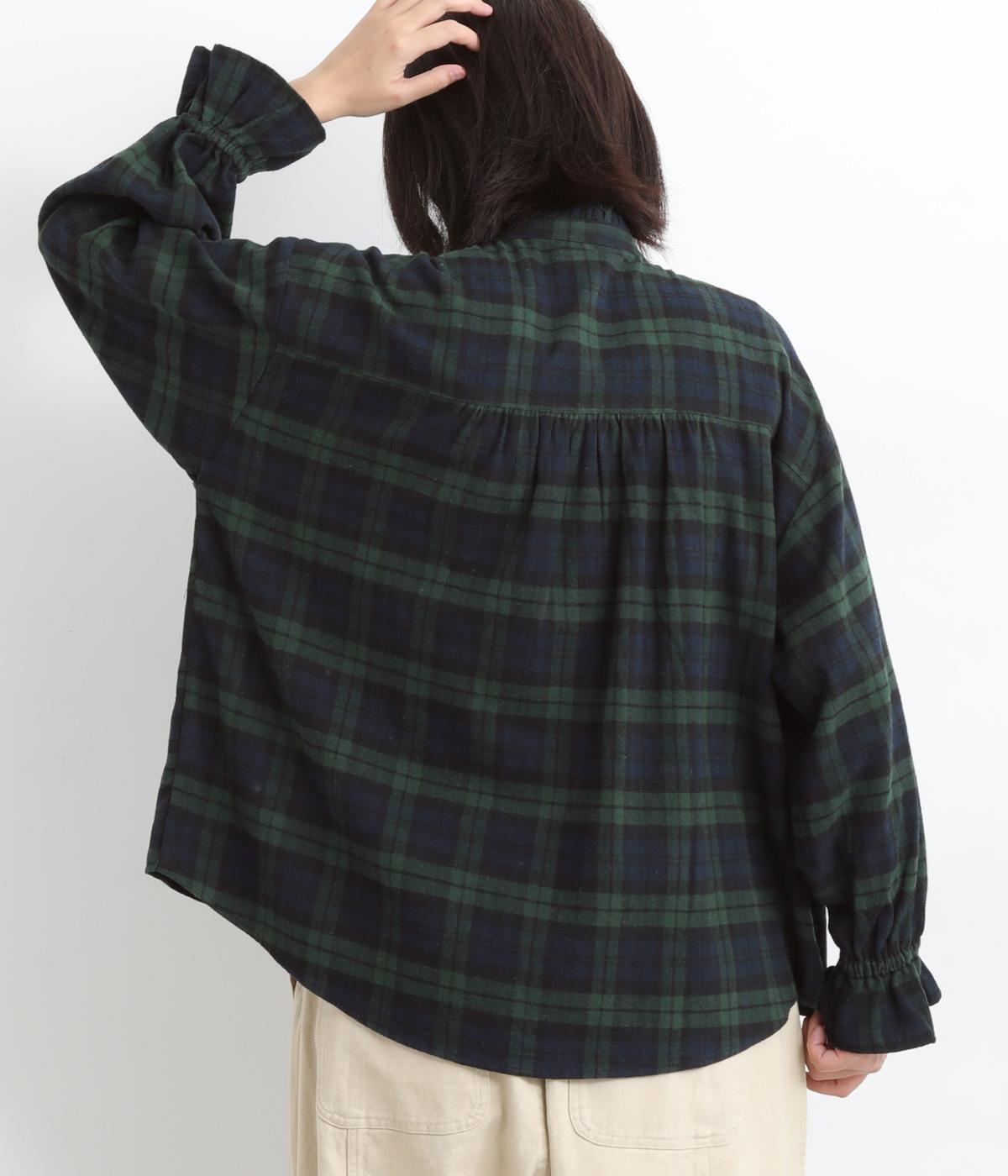 フリルカラーとキャンディスリーブが目をひくブラウスです。背中にはタックをほどこし、ふんわりしたシルエットに仕上がりました。カジュアルなチェック柄に女性らしさを散りばめた一枚。袖口はゴム仕様で、袖丈のアレンジも自在です。