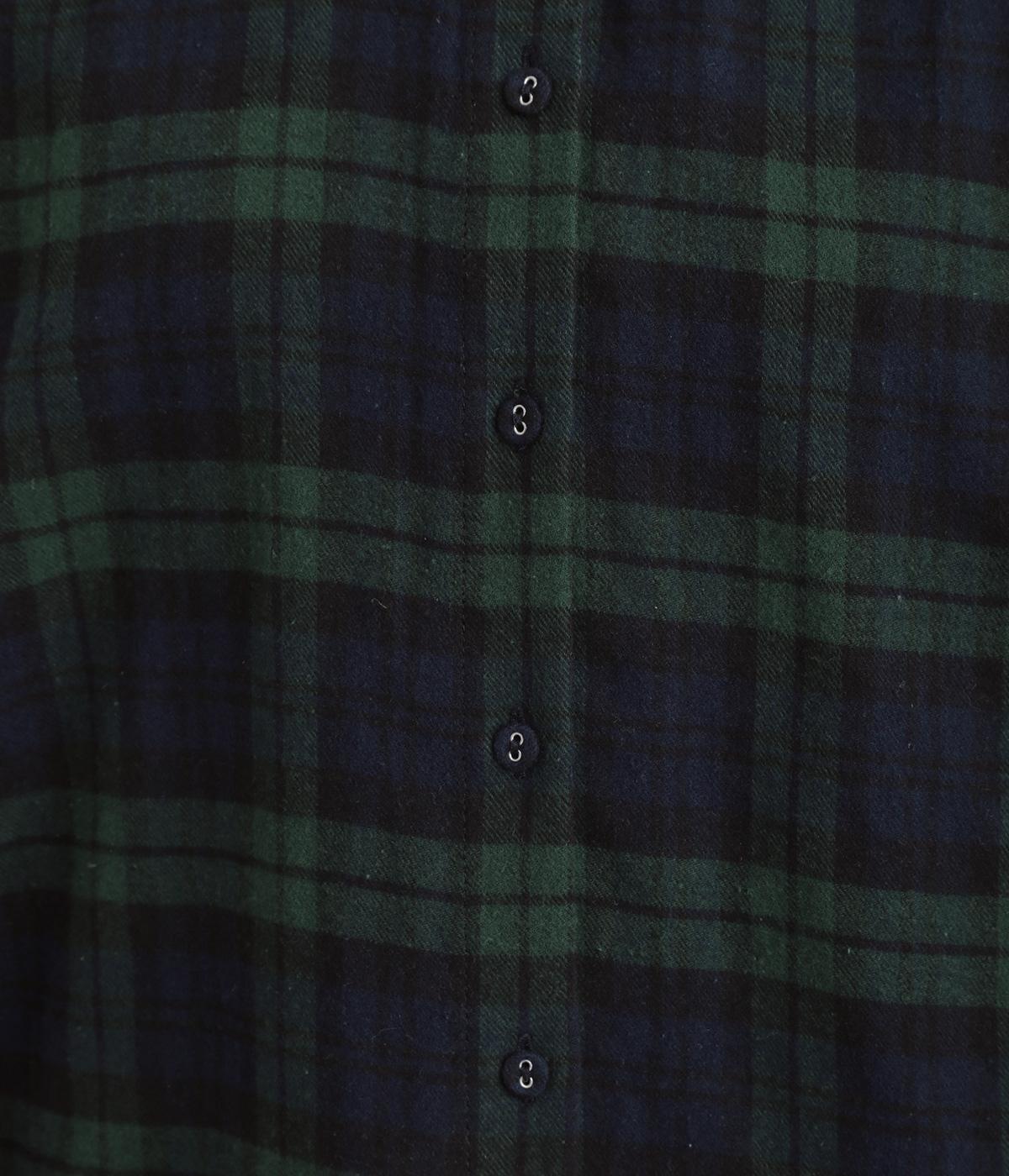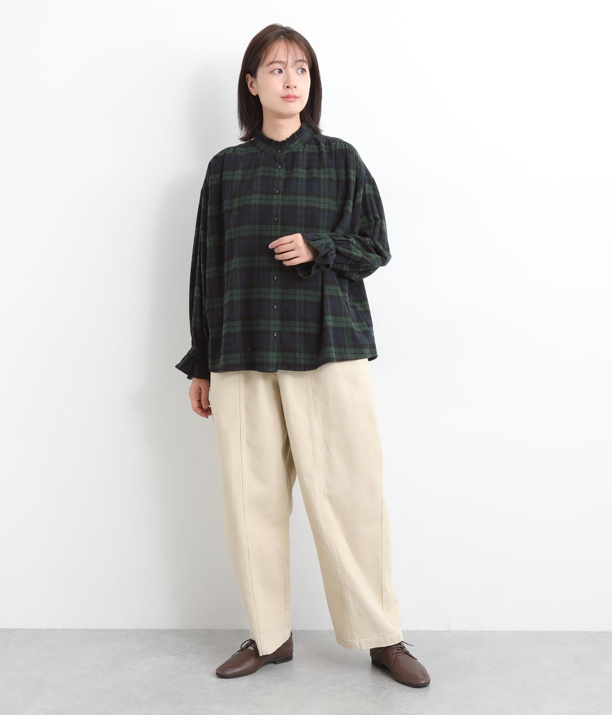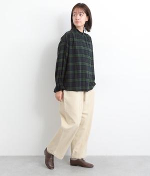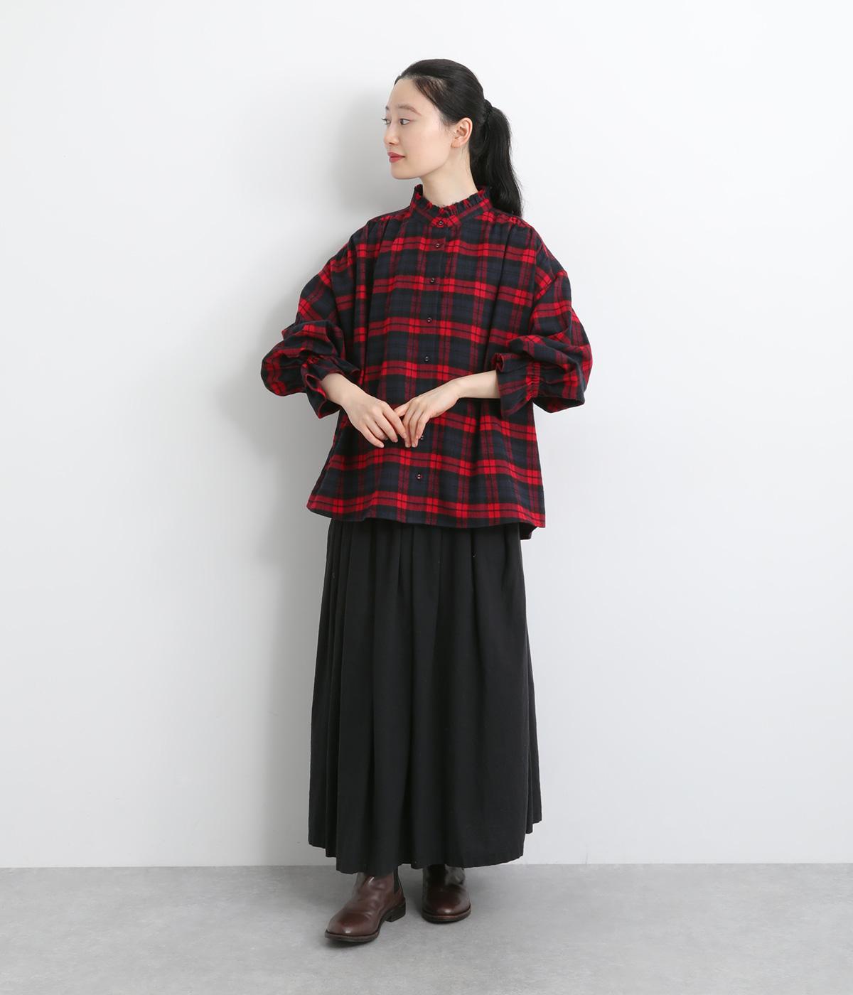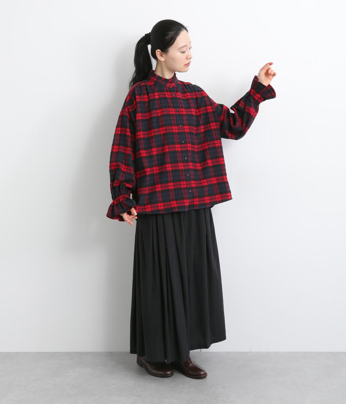 フリルカラーとキャンディスリーブが目をひくブラウスです。背中にはタックをほどこし、ふんわりしたシルエットに仕上がりました。カジュアルなチェック柄に女性らしさを散りばめた一枚。袖口はゴム仕様で、袖丈のアレンジも自在です。