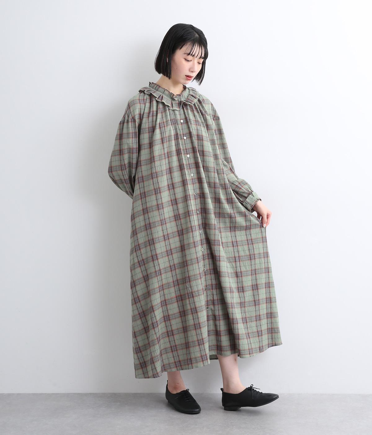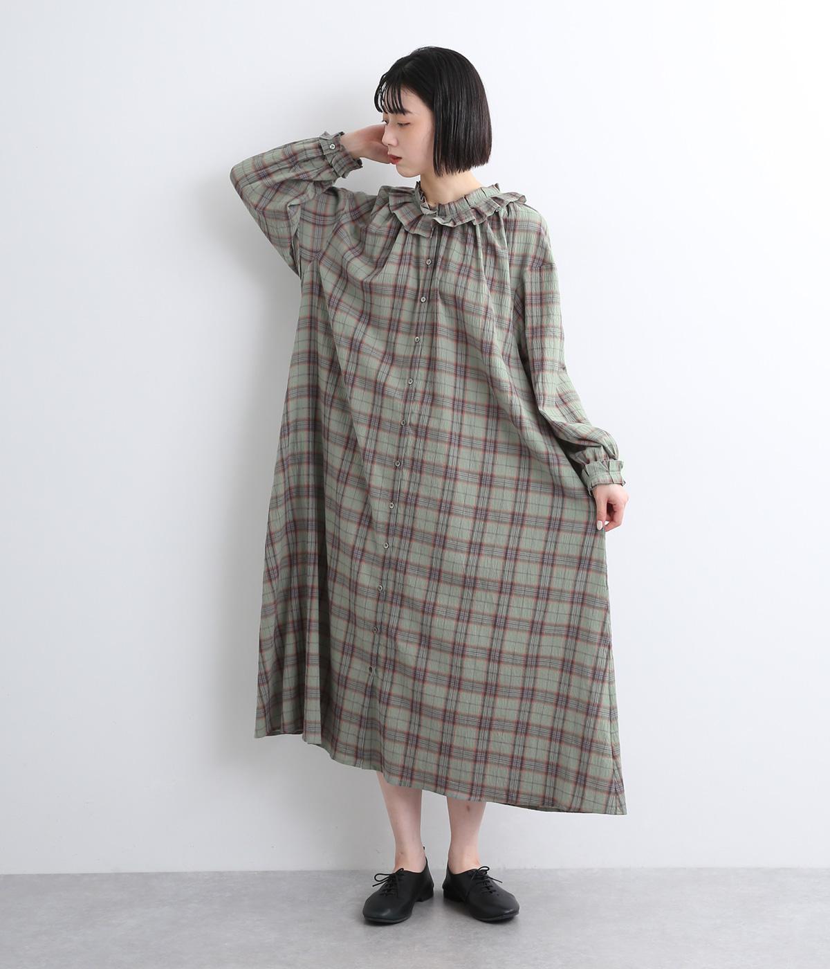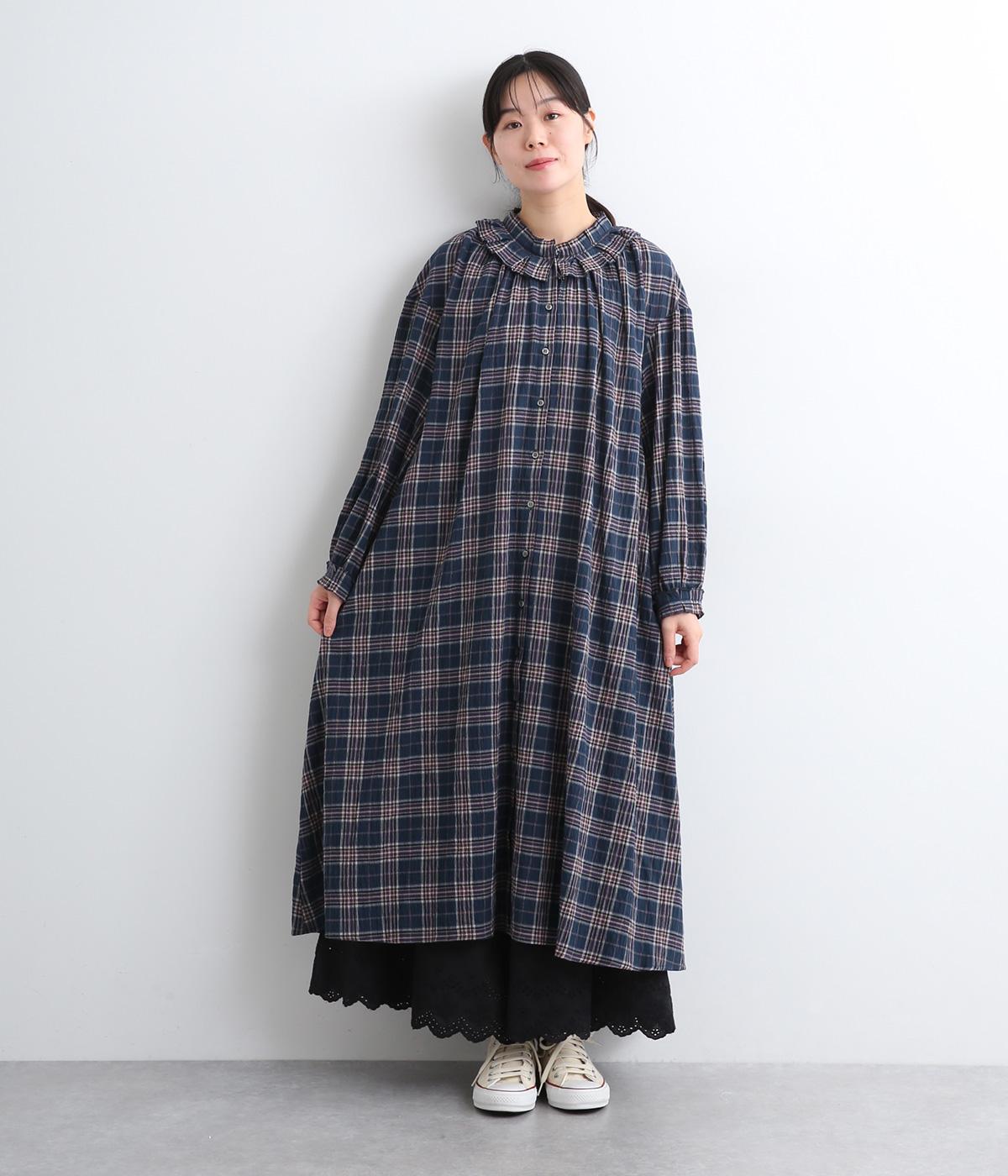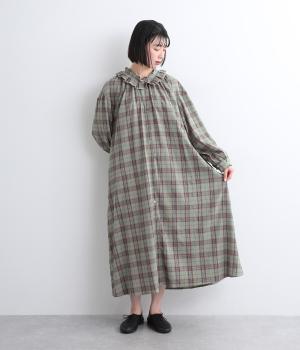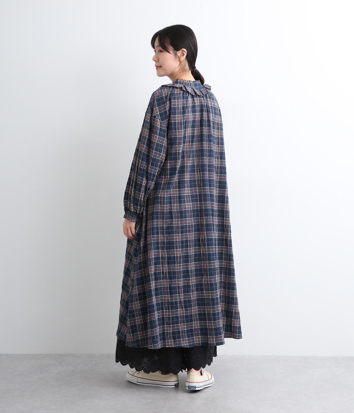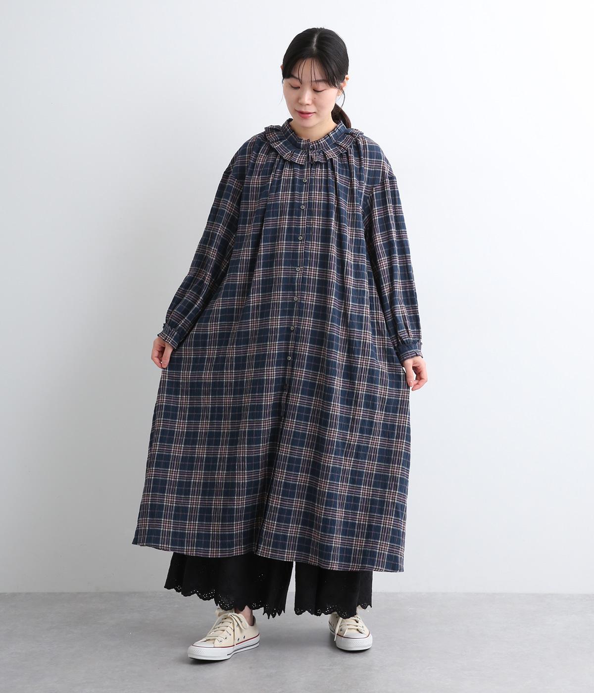 着こなしを印象的に見せてくれるチェック柄ワンピースは、襟元と袖口のタックフリルでロマンティックに仕上げました。が特徴。ライトガウンのように羽織りとしても着用できるマルチなアイテムで、両サイドポケットつきでデイリー使いにも最適。