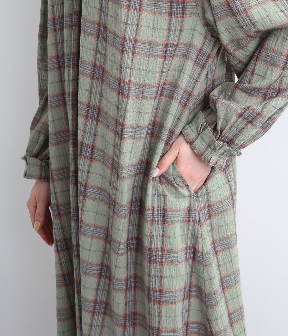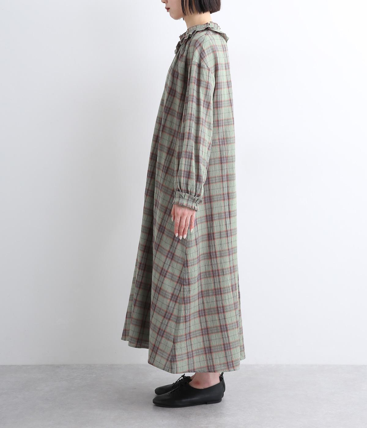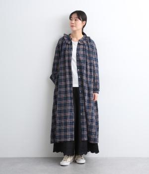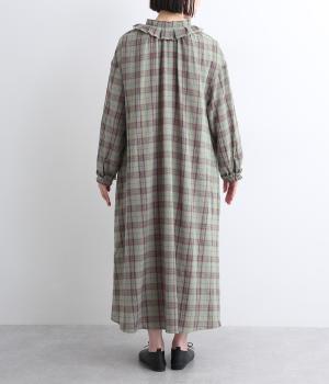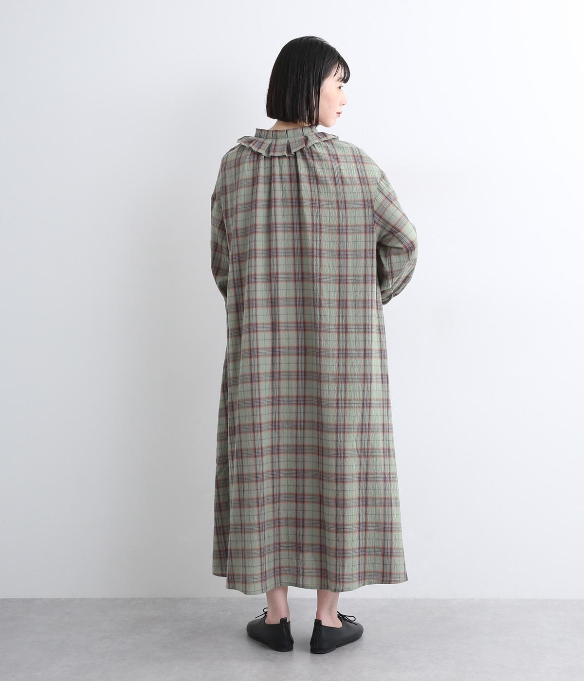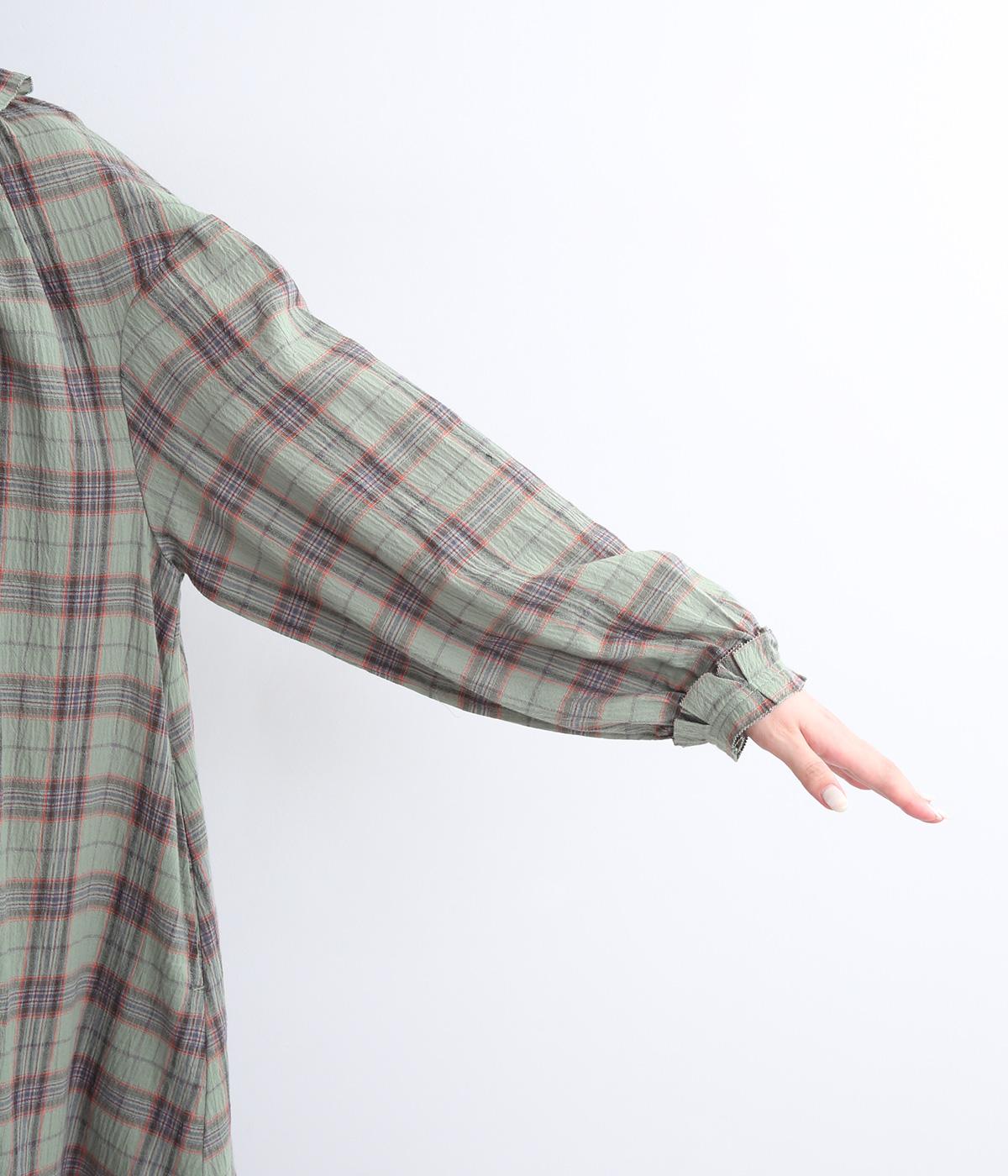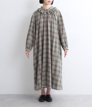 着こなしを印象的に見せてくれるチェック柄ワンピースは、襟元と袖口のタックフリルでロマンティックに仕上げました。が特徴。ライトガウンのように羽織りとしても着用できるマルチなアイテムで、両サイドポケットつきでデイリー使いにも最適。