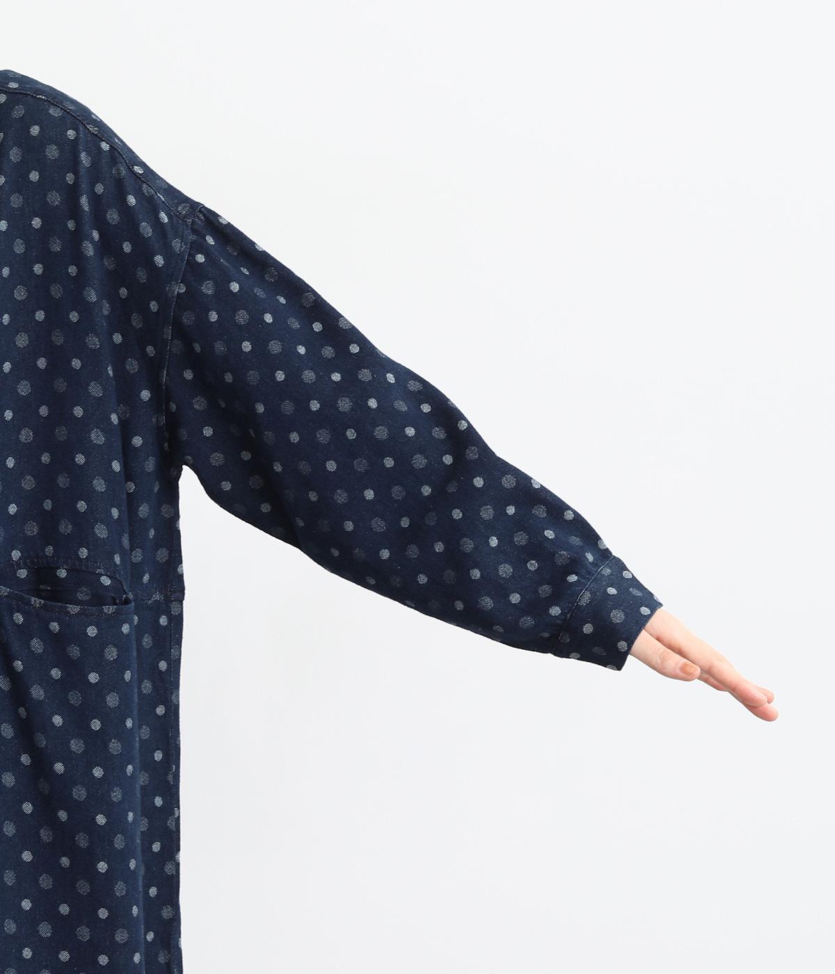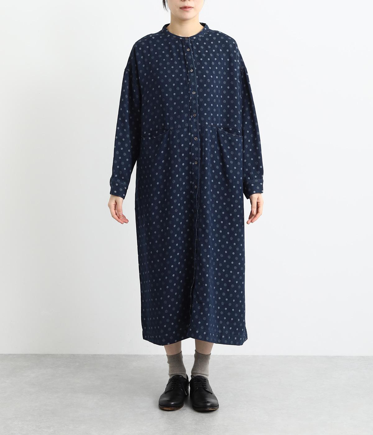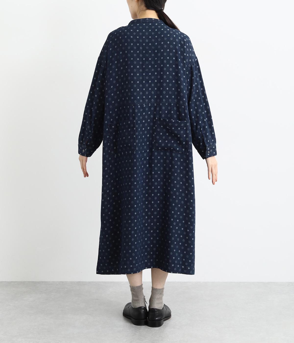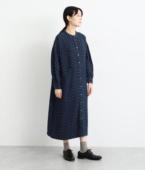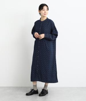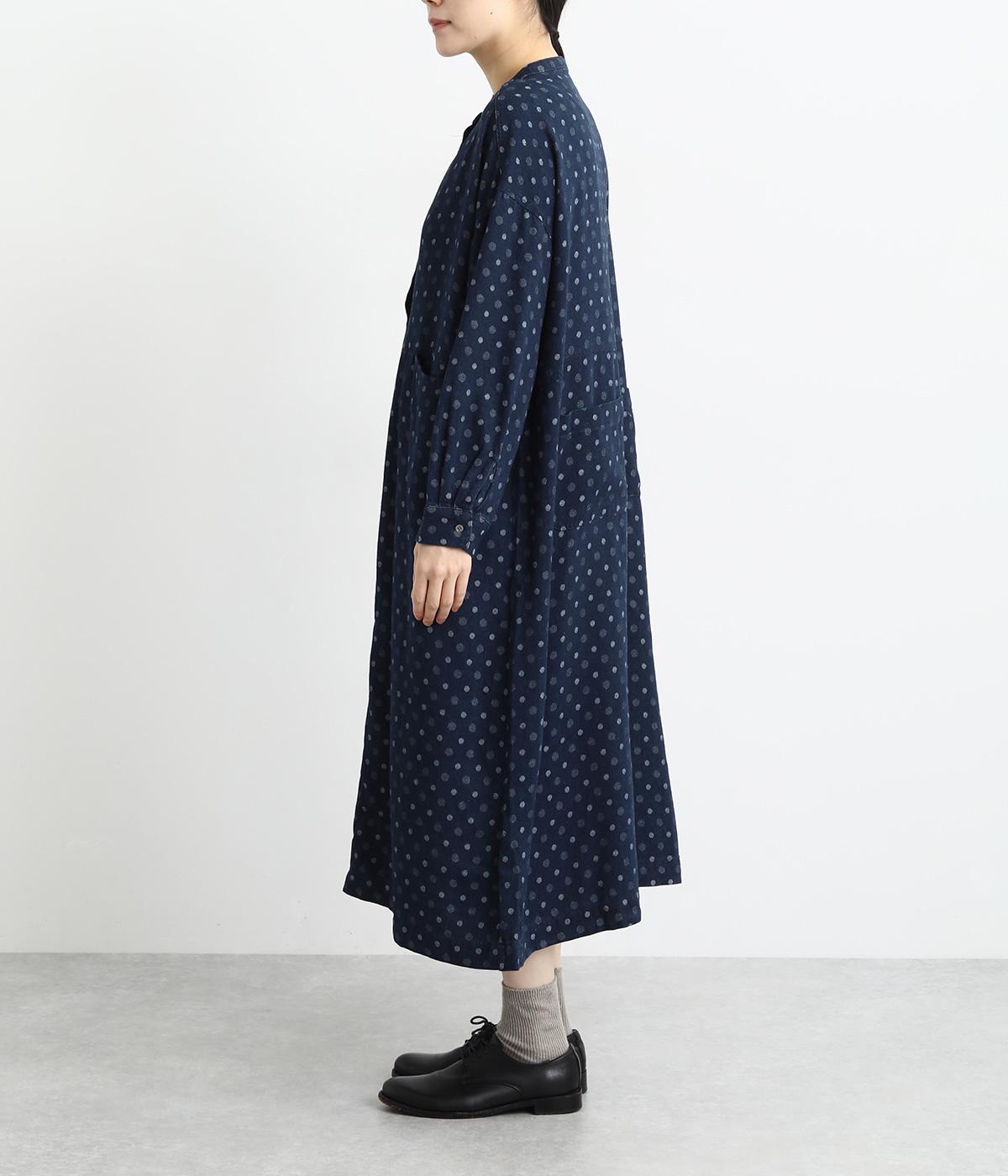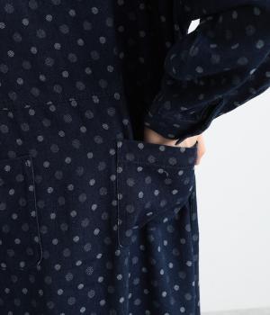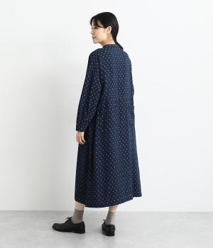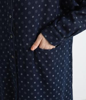 ドットの総柄が印象的な装いをつくるワンピース。ゆったりワイドなシルエットを、小さめのバンドカラーが引きしめます。フロントの切り替え部分に施したポケットもアクセント。ボタンをあけて、パンツスタイルや無地のワンピースに羽織るのもおすすめです。