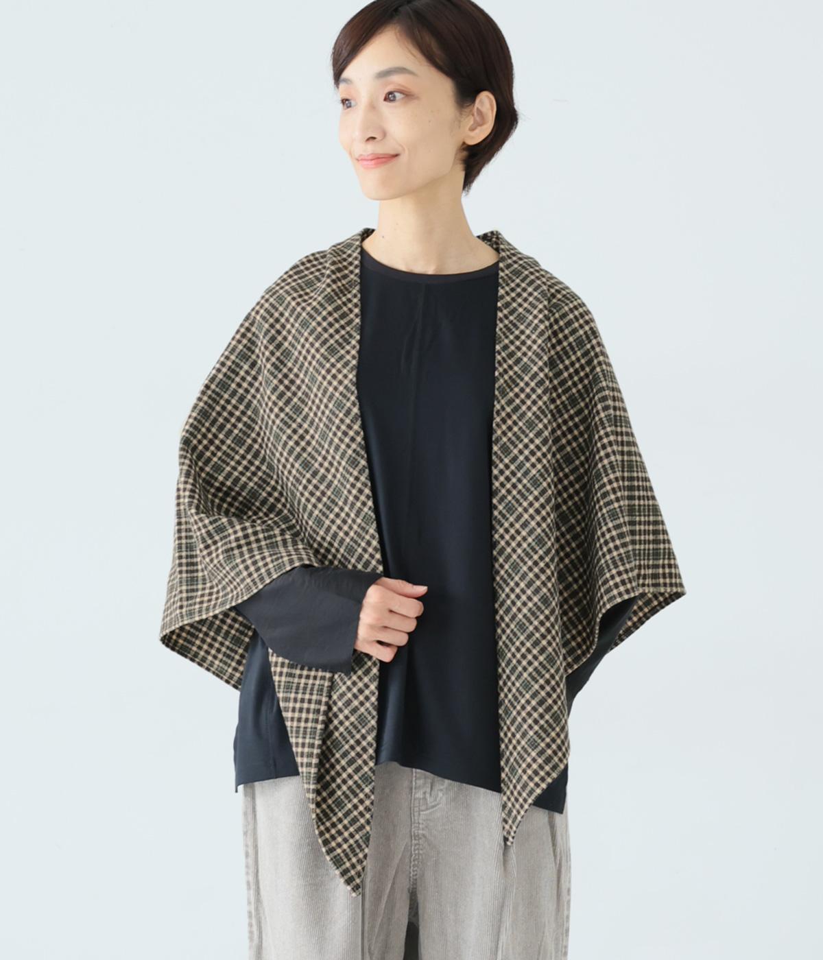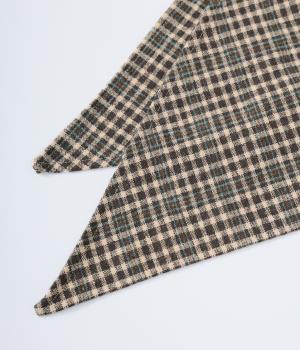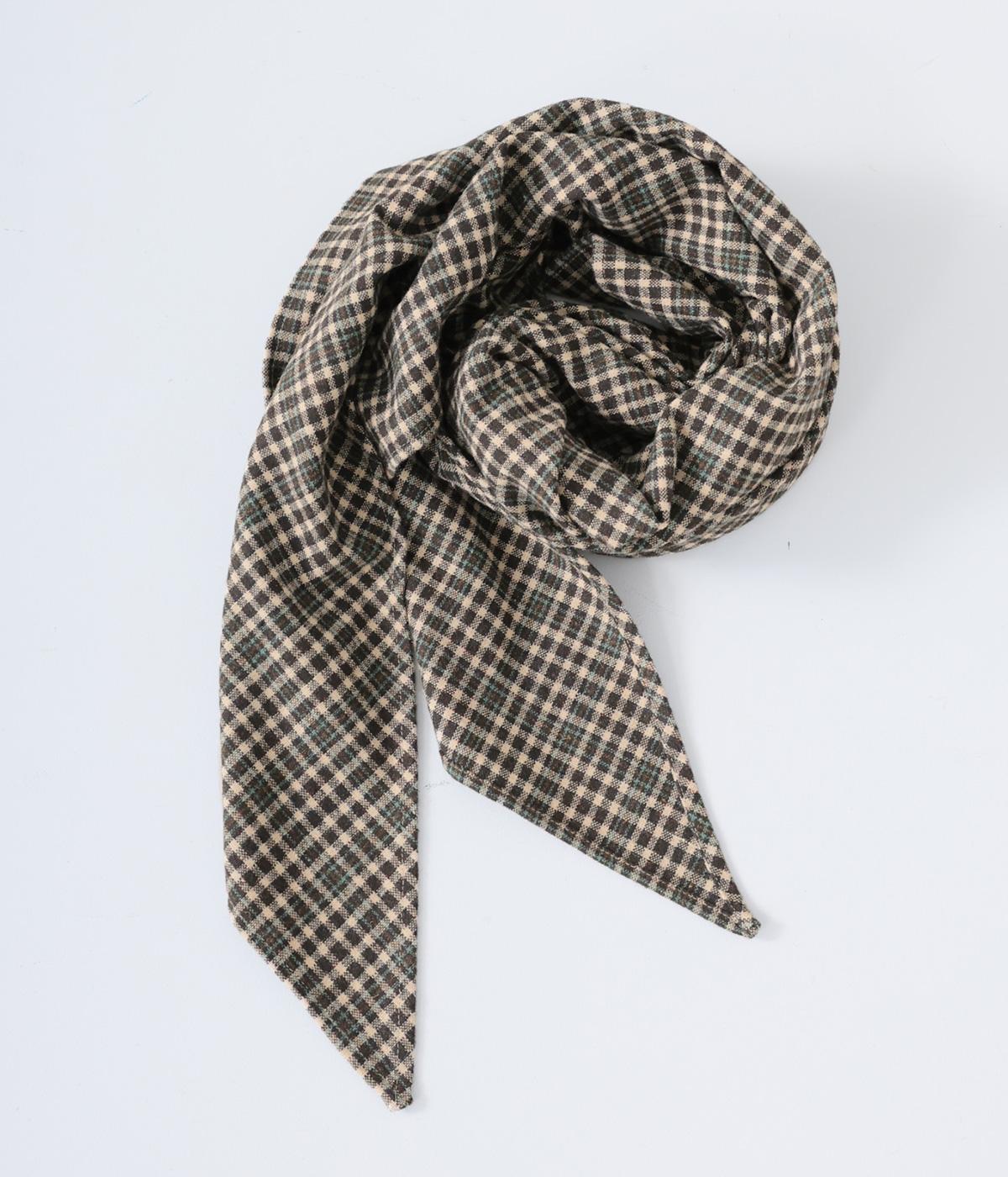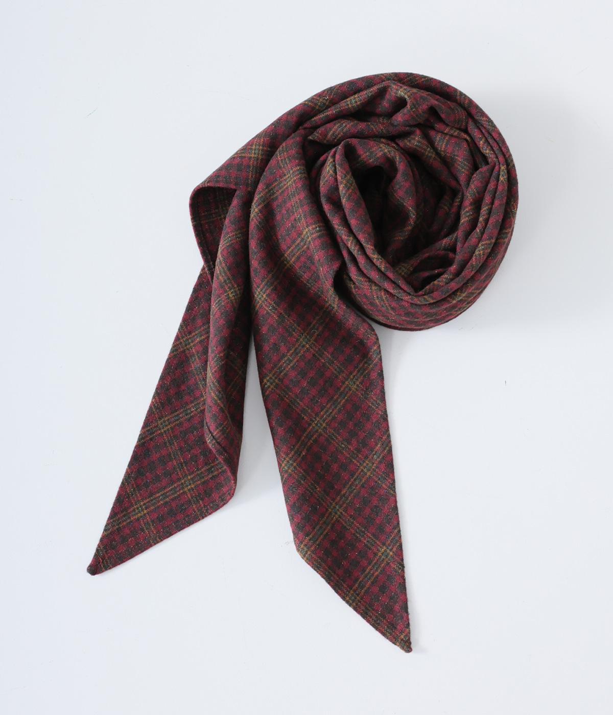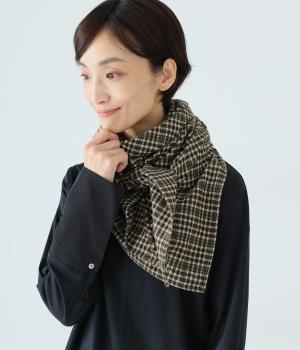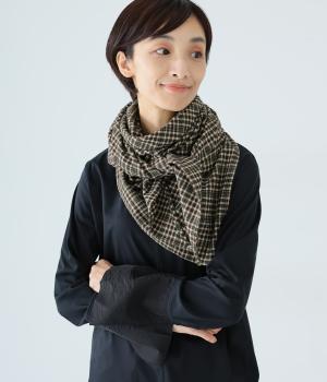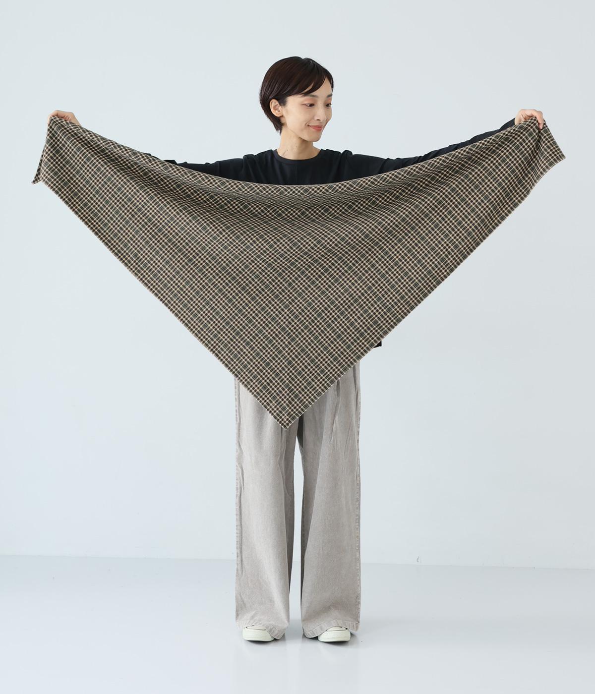 大判の三角形ストールです。ラフに肩にかけたり、首元に巻いたり、テクニック要らずでスタイリングのワンポイントが叶います。落ち着いたチェック柄も好印象で、暗くなりがちな秋冬シーズンに活躍する一枚です。