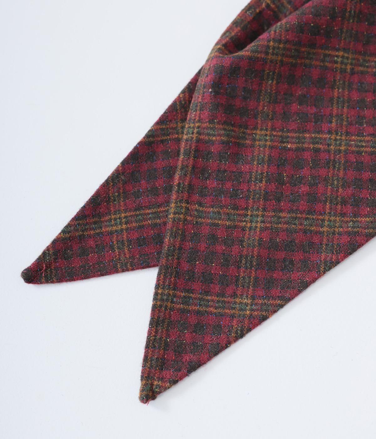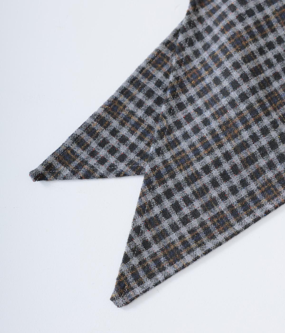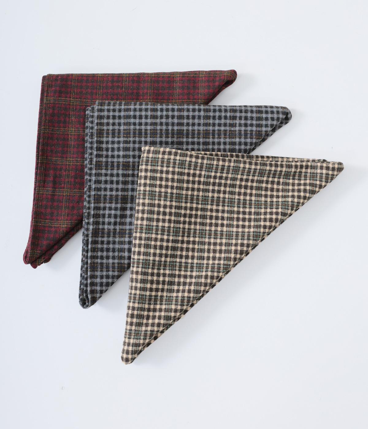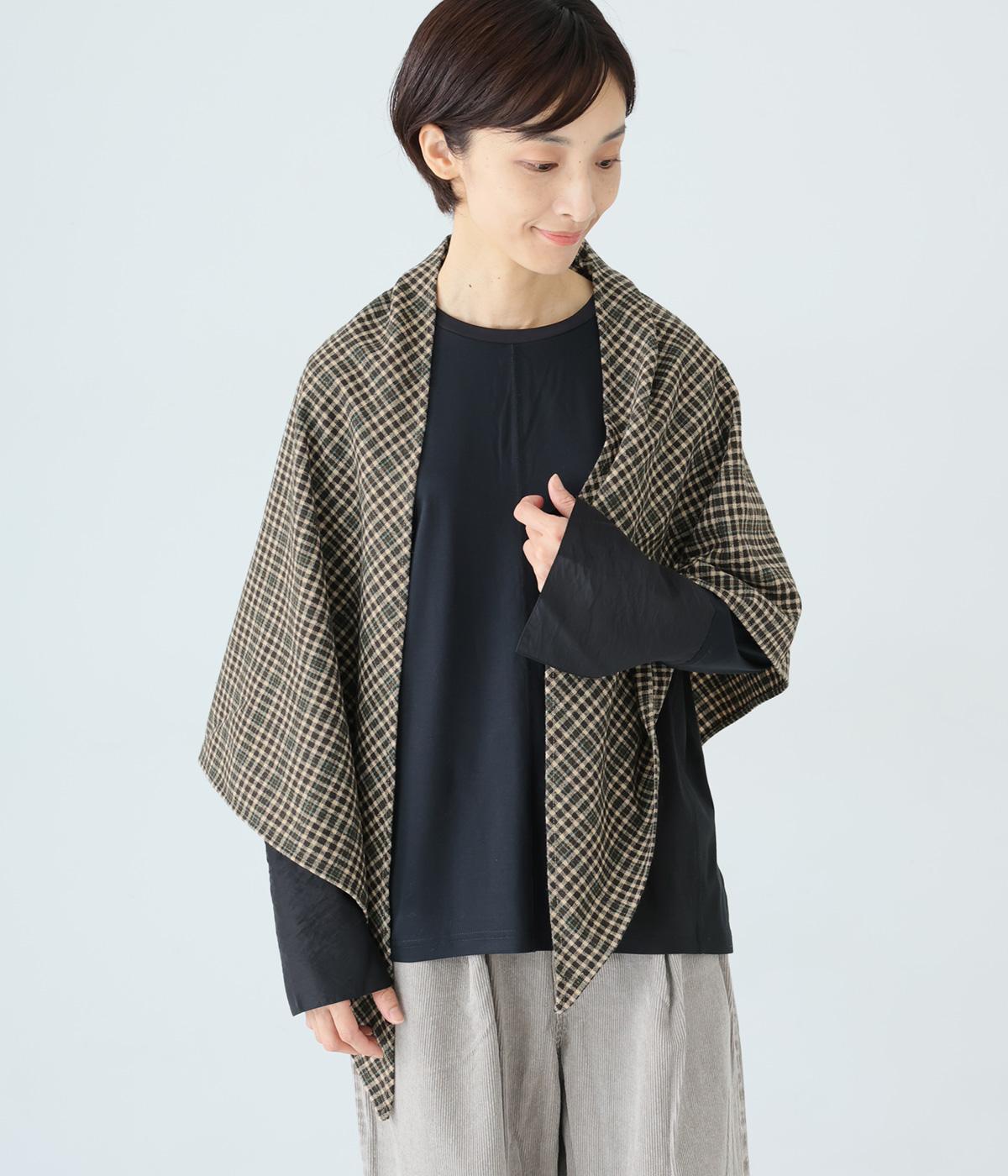 大判の三角形ストールです。ラフに肩にかけたり、首元に巻いたり、テクニック要らずでスタイリングのワンポイントが叶います。落ち着いたチェック柄も好印象で、暗くなりがちな秋冬シーズンに活躍する一枚です。