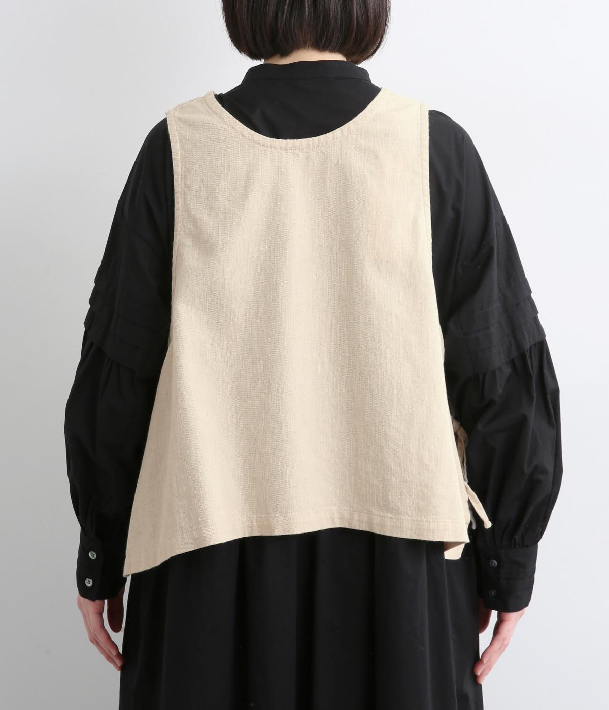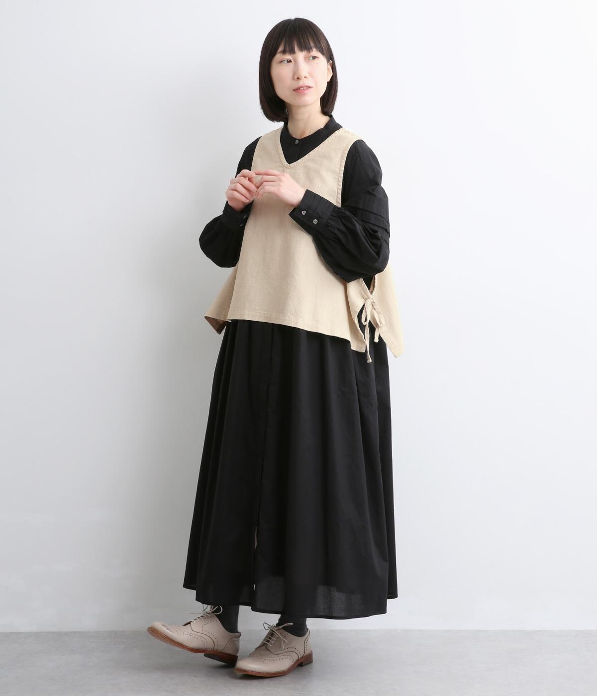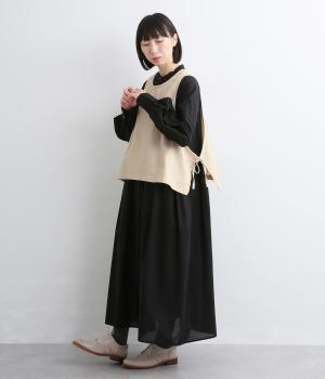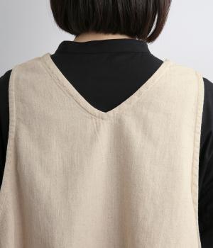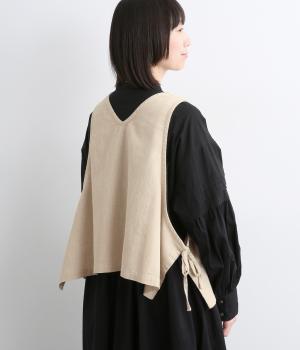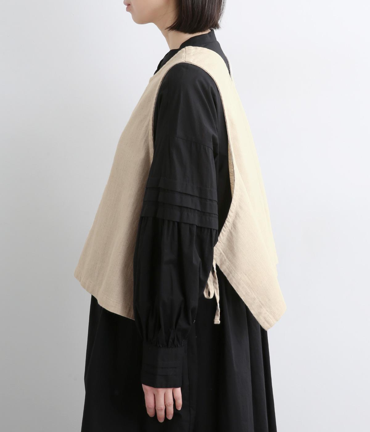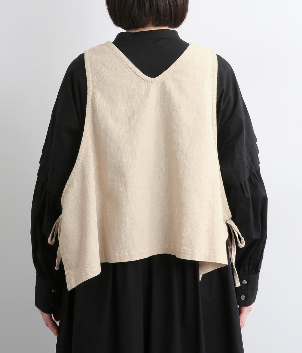 サイドリボンで留めるベストは、前後のネックをラウンドとVで変化をつけた2wayデザインに仕上げました。身幅にゆとりがあるのでワンピースなどにも合わせやすく、手持ちのアイテムを新鮮にコーディネートできます。
