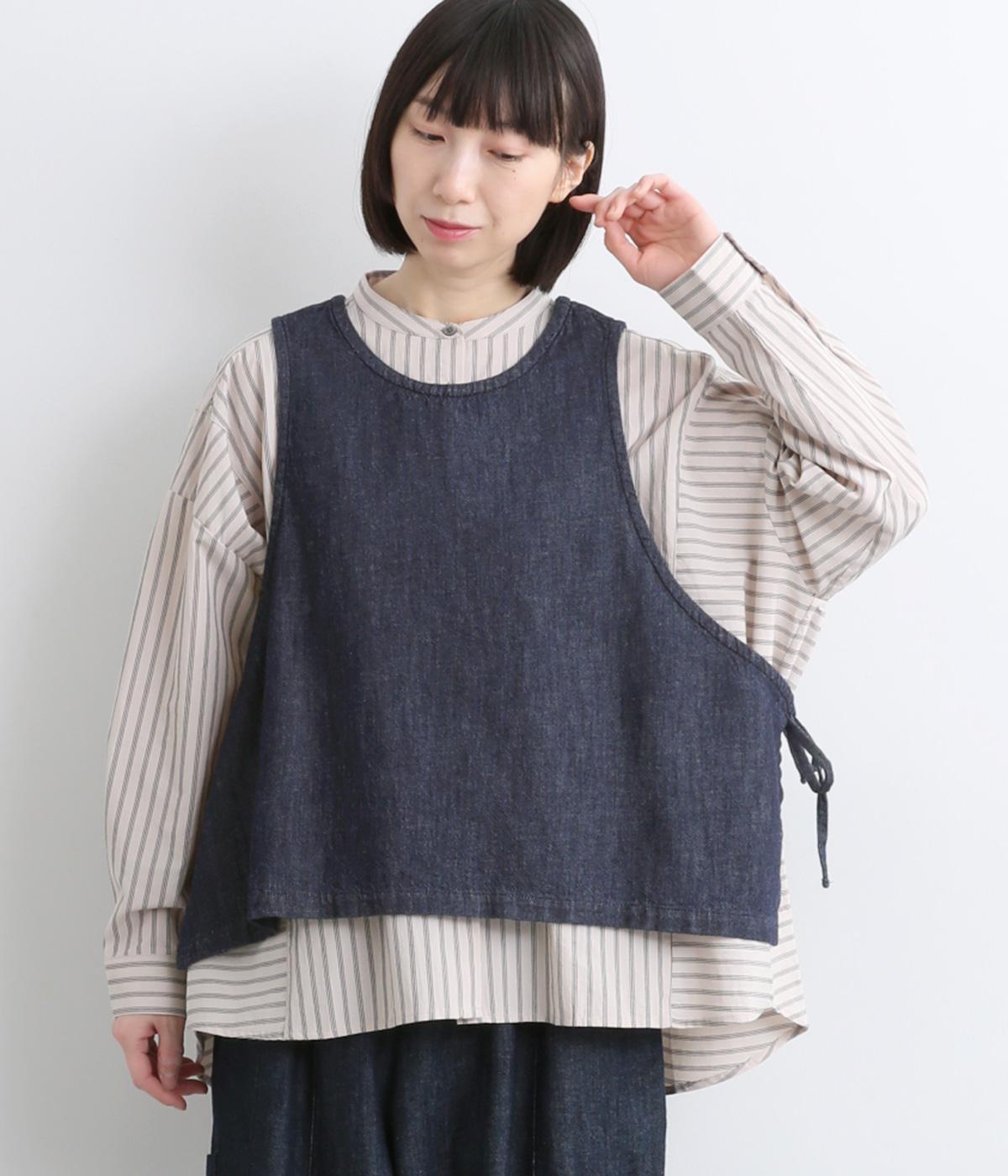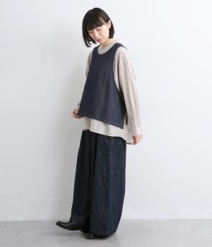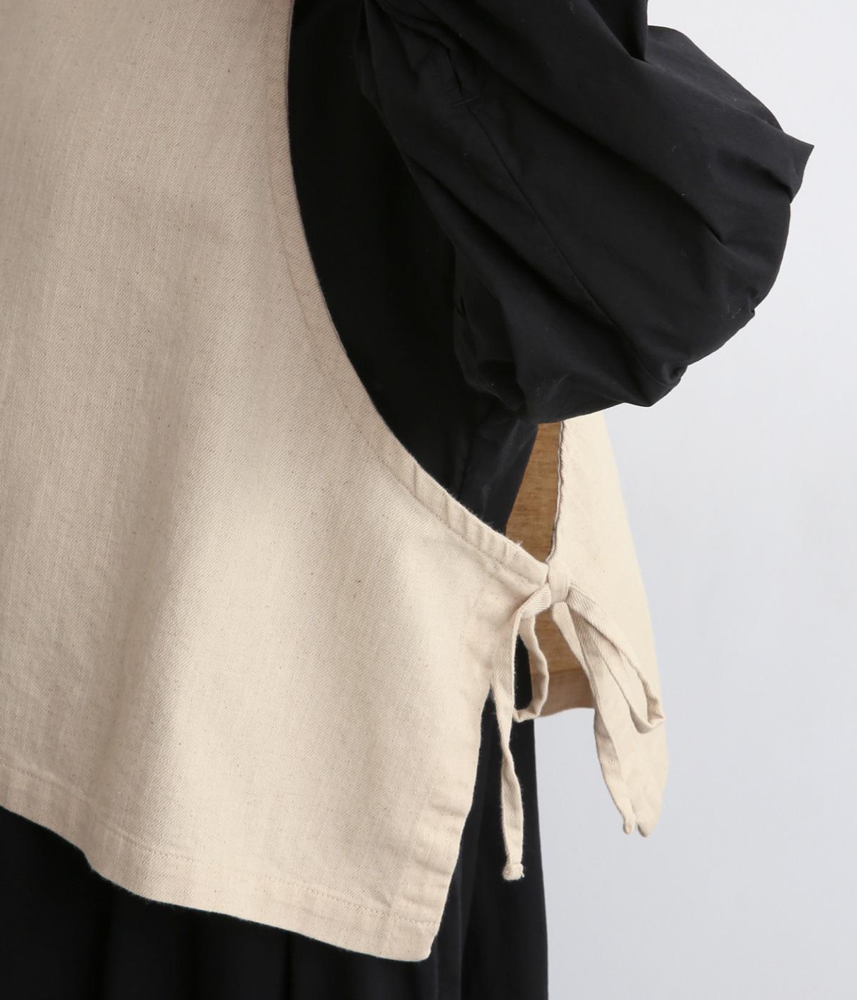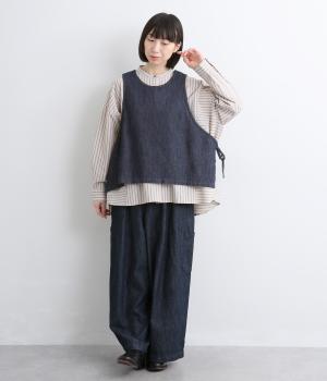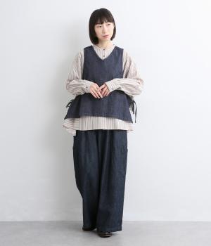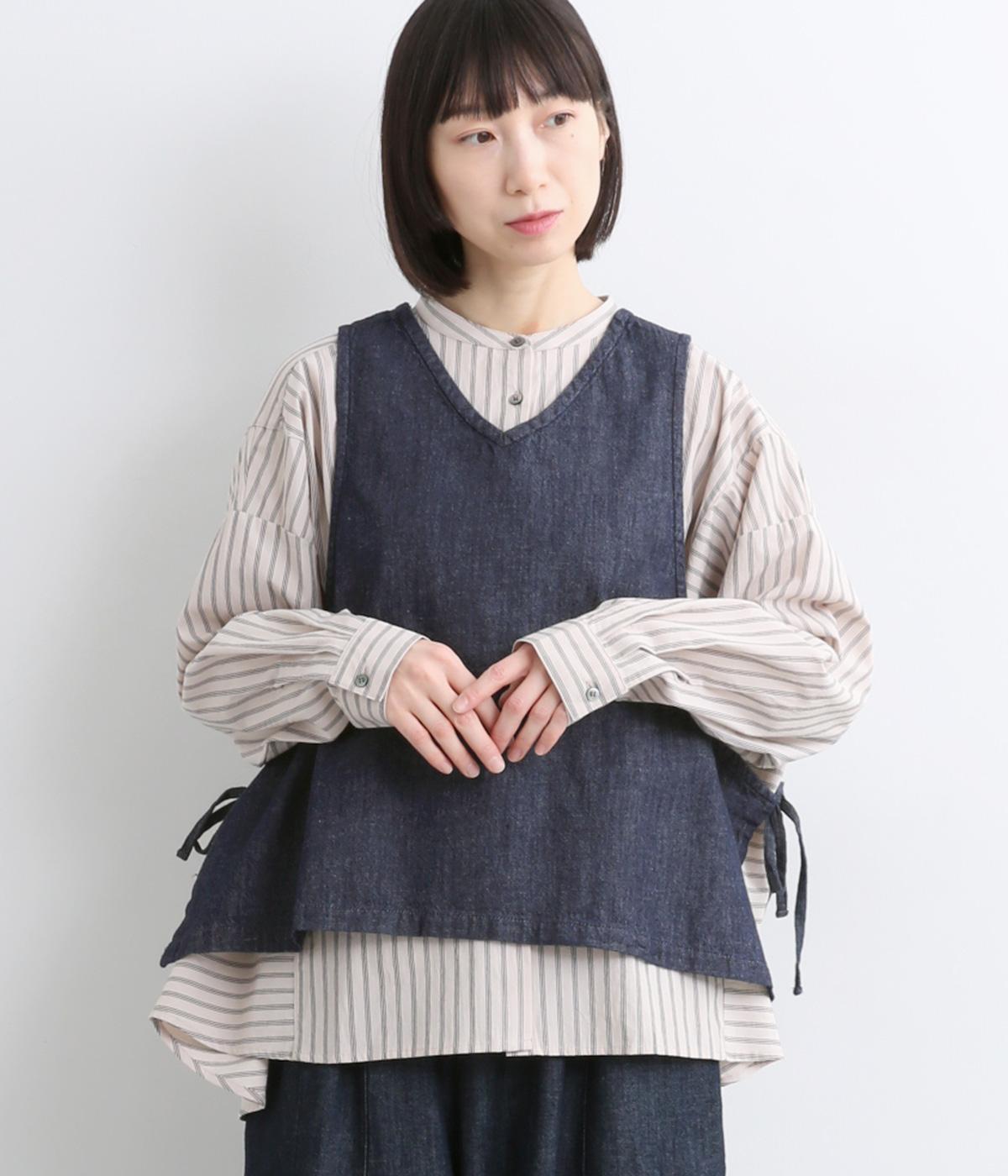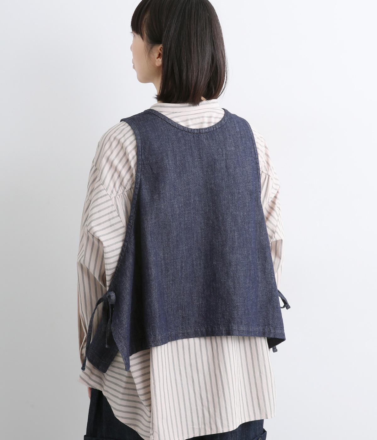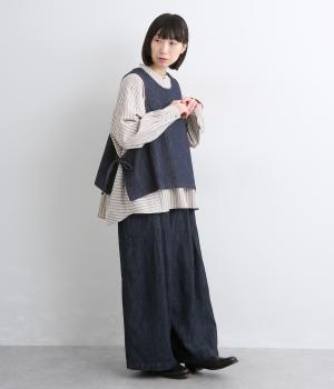 サイドリボンで留めるベストは、前後のネックをラウンドとVで変化をつけた2wayデザインに仕上げました。身幅にゆとりがあるのでワンピースなどにも合わせやすく、手持ちのアイテムを新鮮にコーディネートできます。