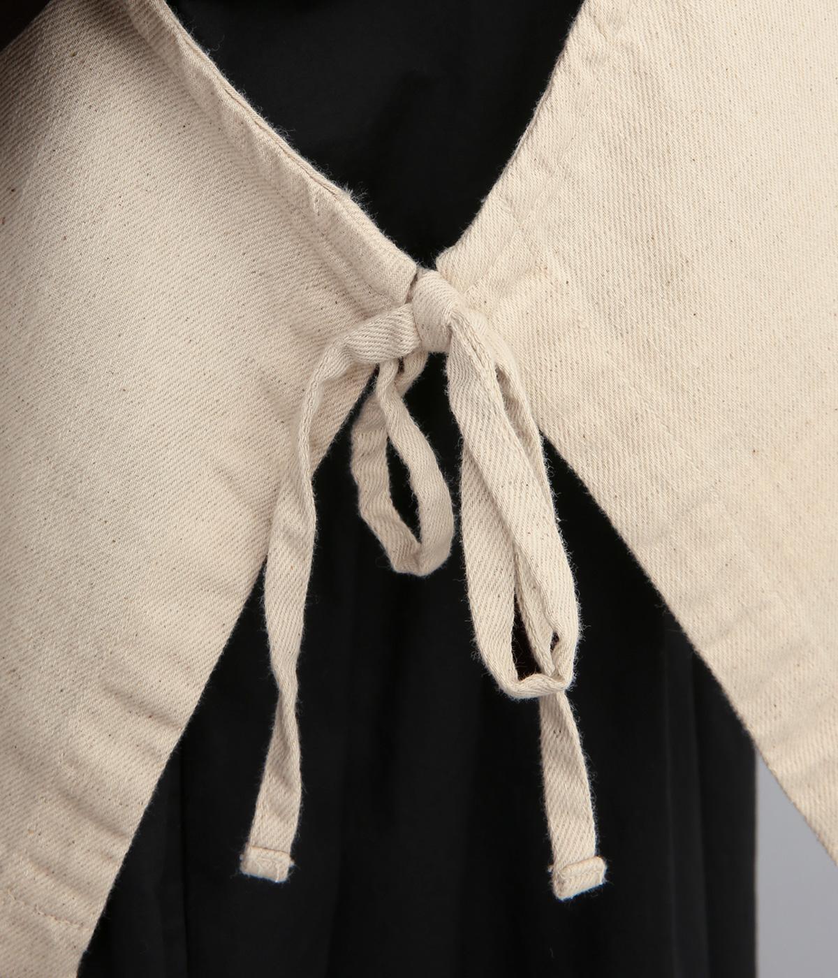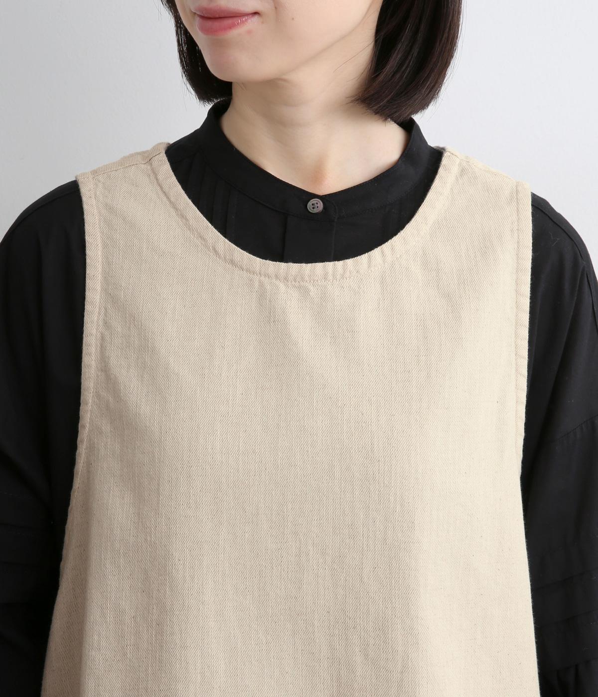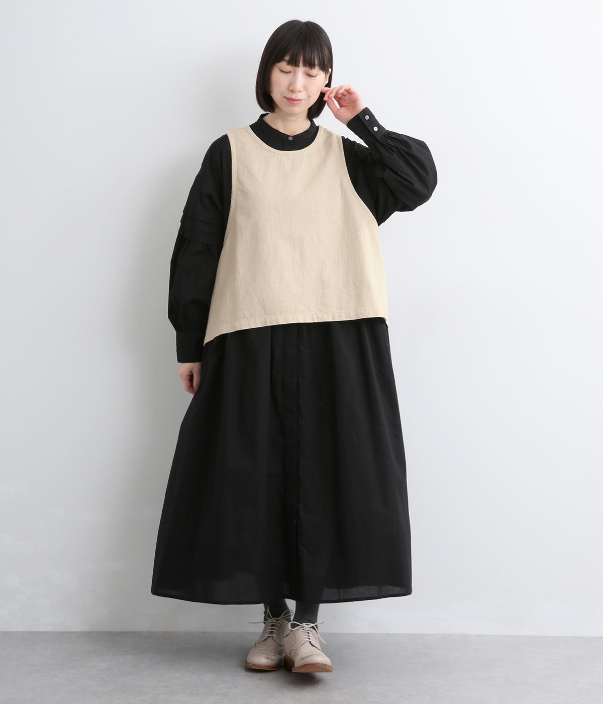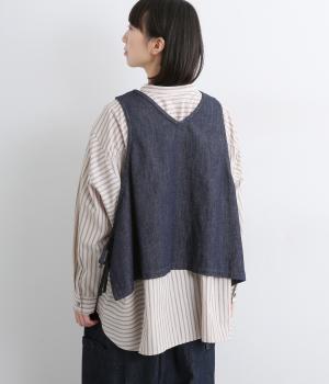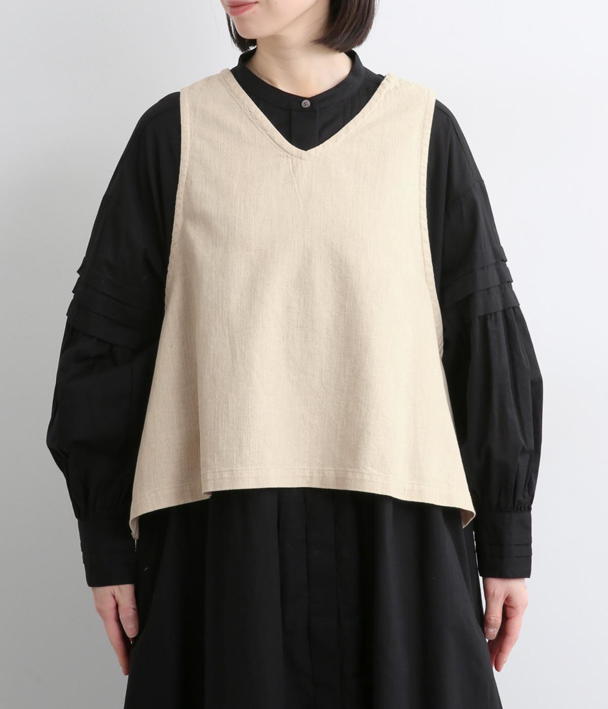 サイドリボンで留めるベストは、前後のネックをラウンドとVで変化をつけた2wayデザインに仕上げました。身幅にゆとりがあるのでワンピースなどにも合わせやすく、手持ちのアイテムを新鮮にコーディネートできます。