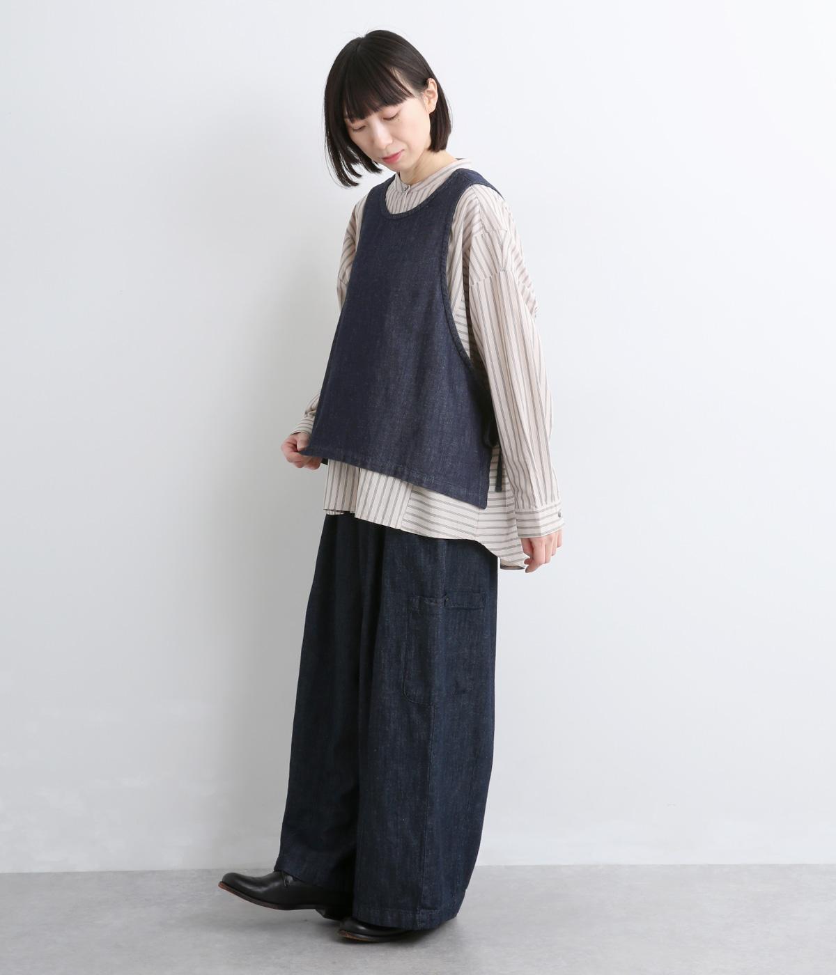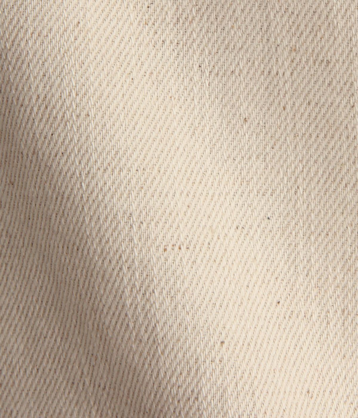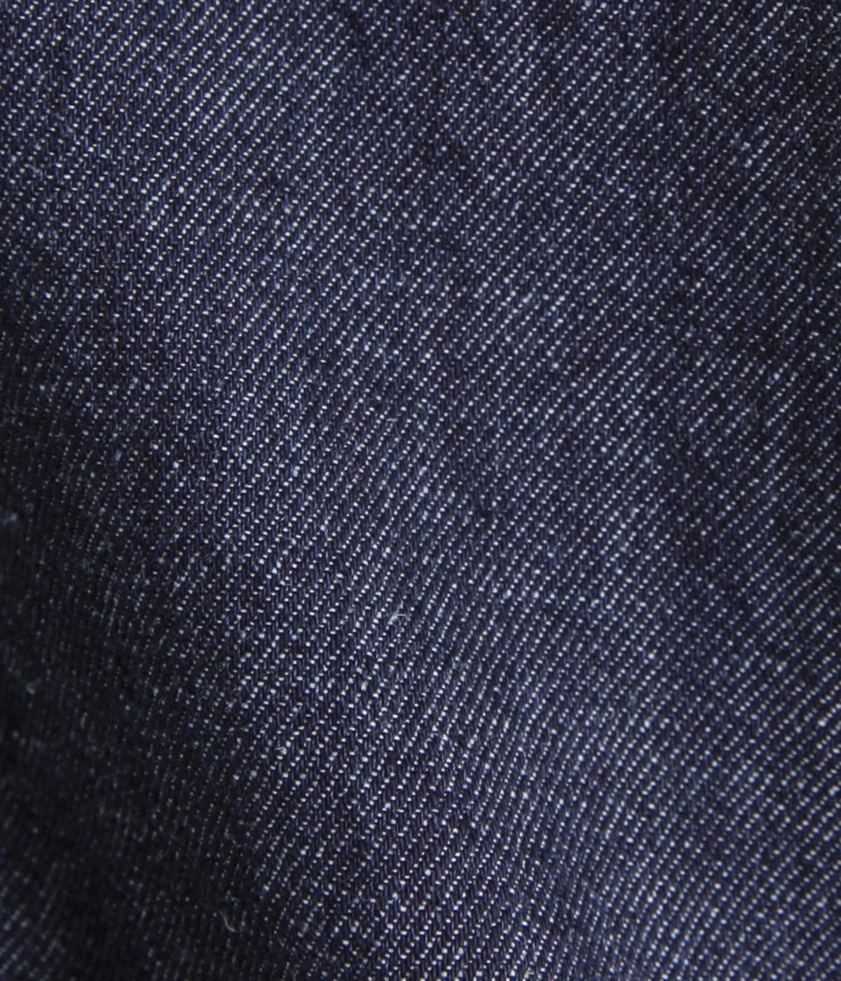 糸の撚りを弱くすることによりふくらみができた糸を、甘くゆっくりと織り上げたソフトデニム生地です。コットンリネンのナチュラルな風合いとタフさのバランスが絶妙でデイリーに活躍。