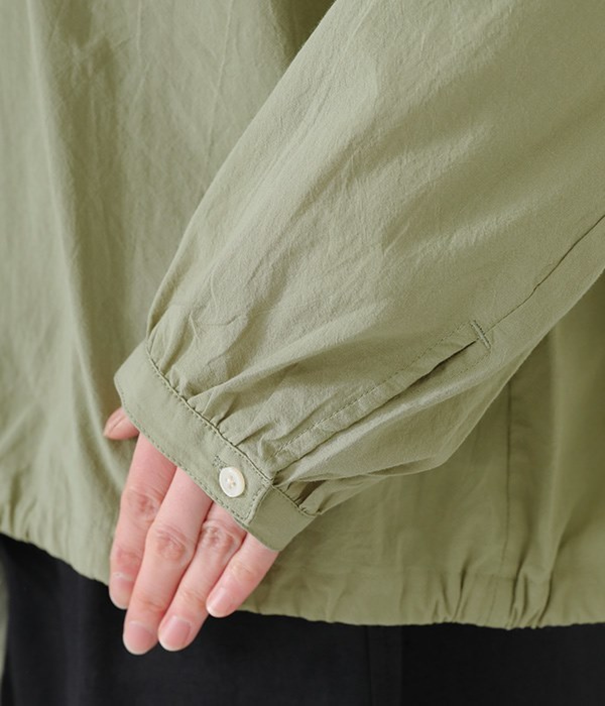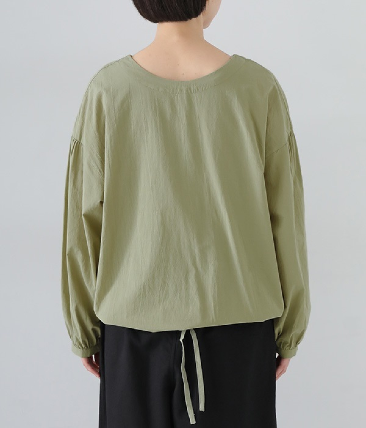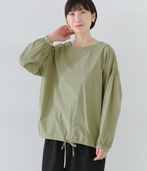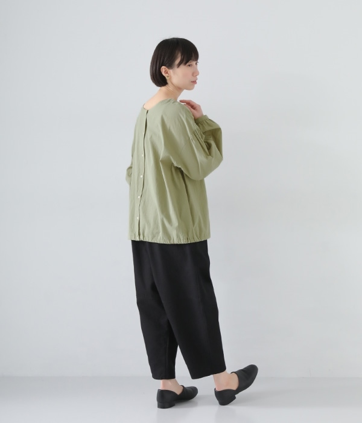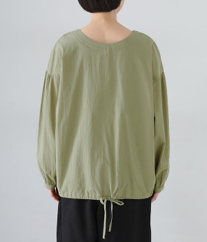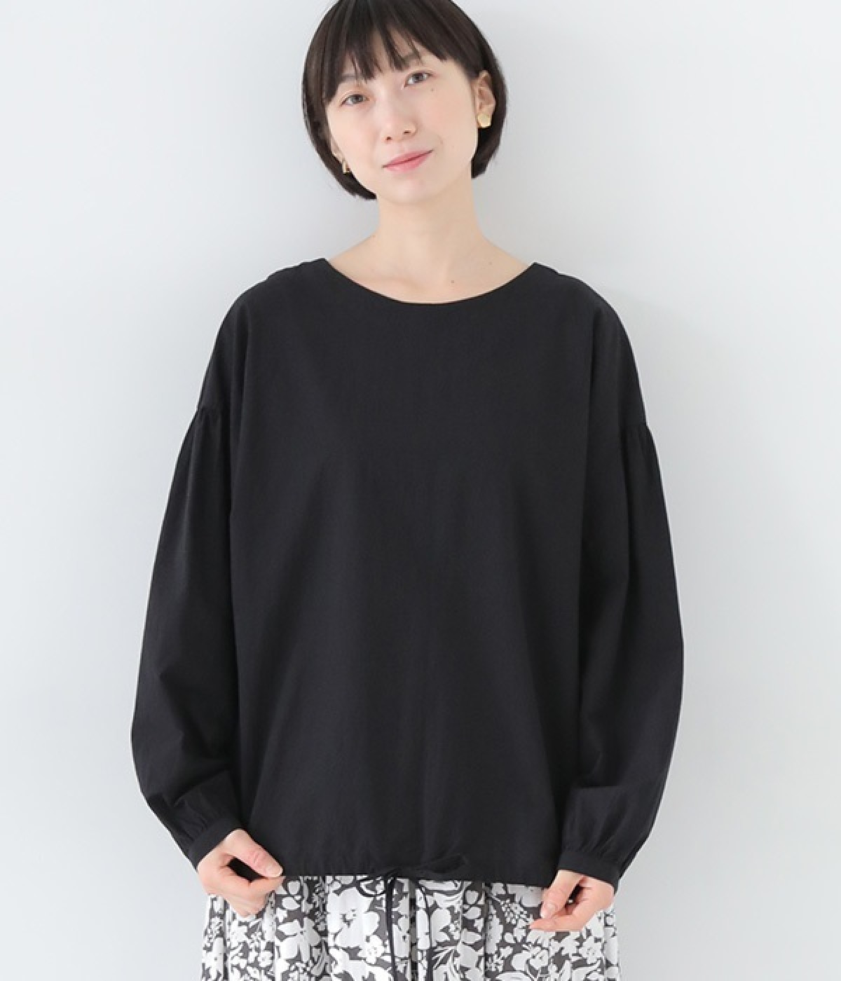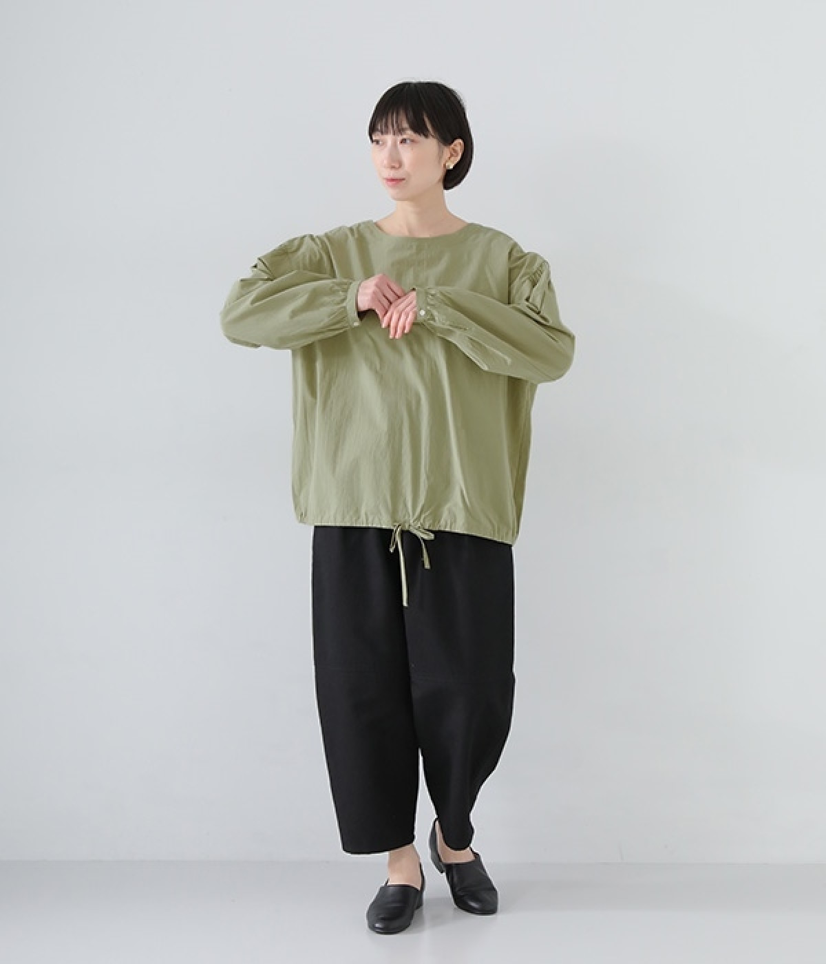 さらっとしたシャリ味を感じる、サンドウォッシュ加工をほどこしたプルオーバー。裾のドローストリングを絞ると、シルエットに丸みが出る自由なデザインで飽きが来ません。さらに前後でも着られるため、羽織りとして着たいときにはボタン側を前にすることも可能。ギャザーを入れたぽわん袖は、着るだけで二の腕をカバーするのも◎。気分に応じて印象の変化が狙える、アレンジ力の高さが自慢の一枚です。
