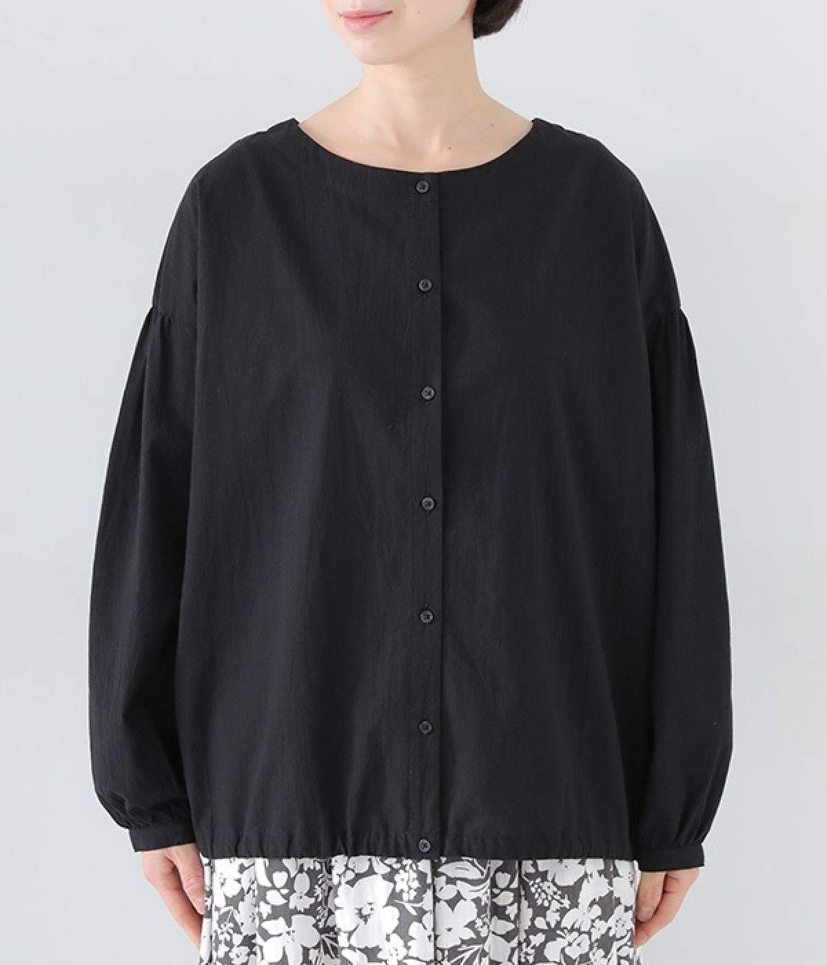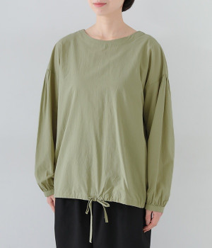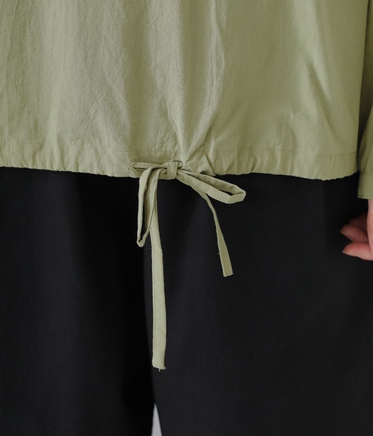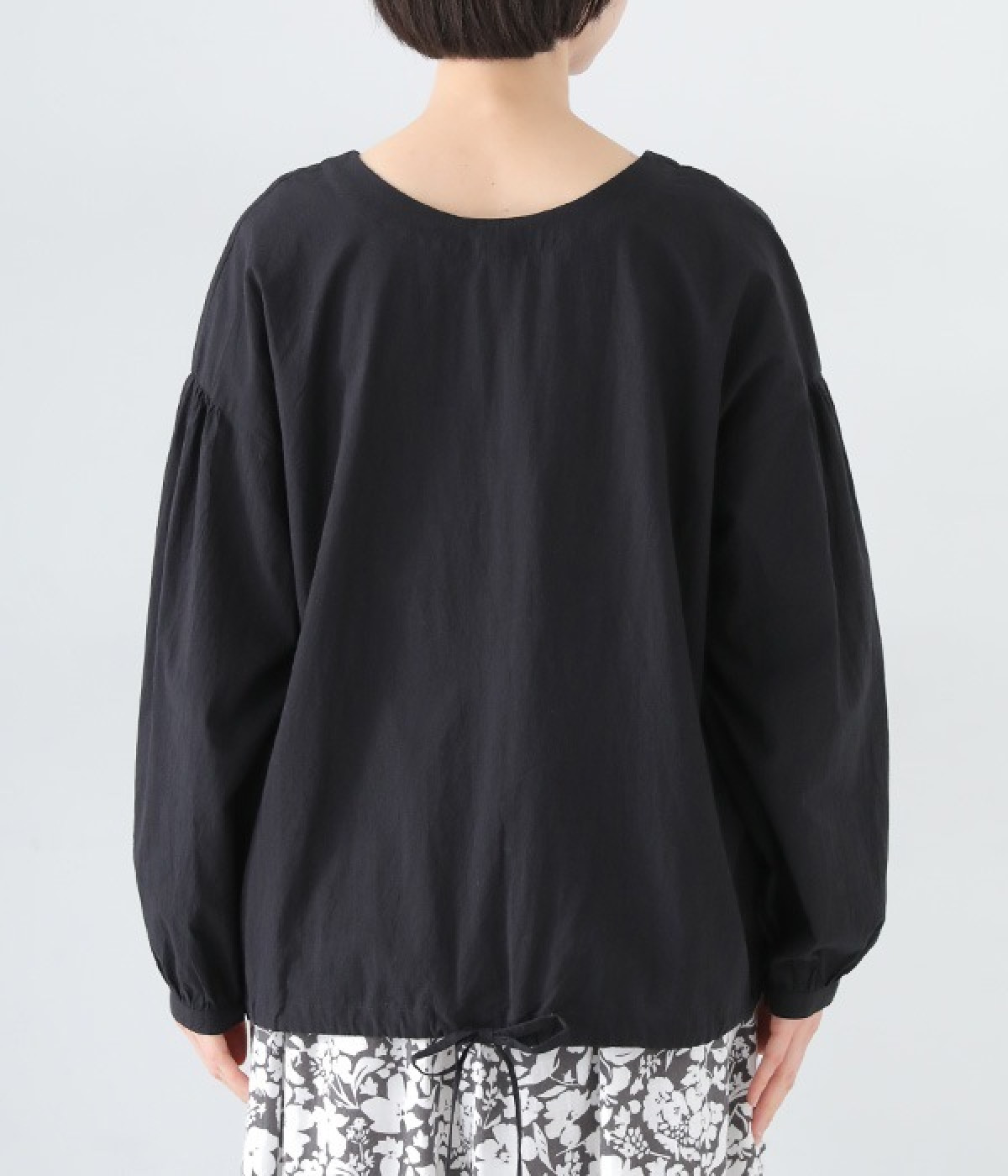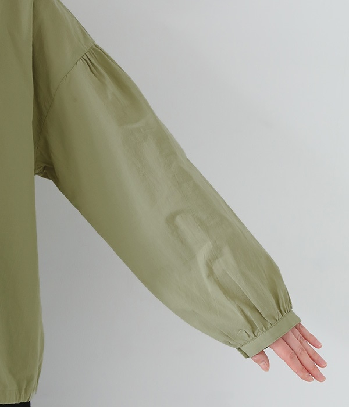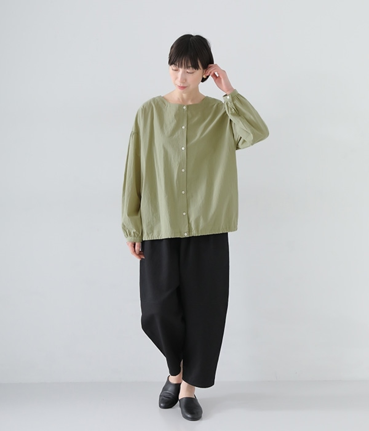 さらっとしたシャリ味を感じる、サンドウォッシュ加工をほどこしたプルオーバー。裾のドローストリングを絞ると、シルエットに丸みが出る自由なデザインで飽きが来ません。さらに前後でも着られるため、羽織りとして着たいときにはボタン側を前にすることも可能。ギャザーを入れたぽわん袖は、着るだけで二の腕をカバーするのも◎。気分に応じて印象の変化が狙える、アレンジ力の高さが自慢の一枚です。