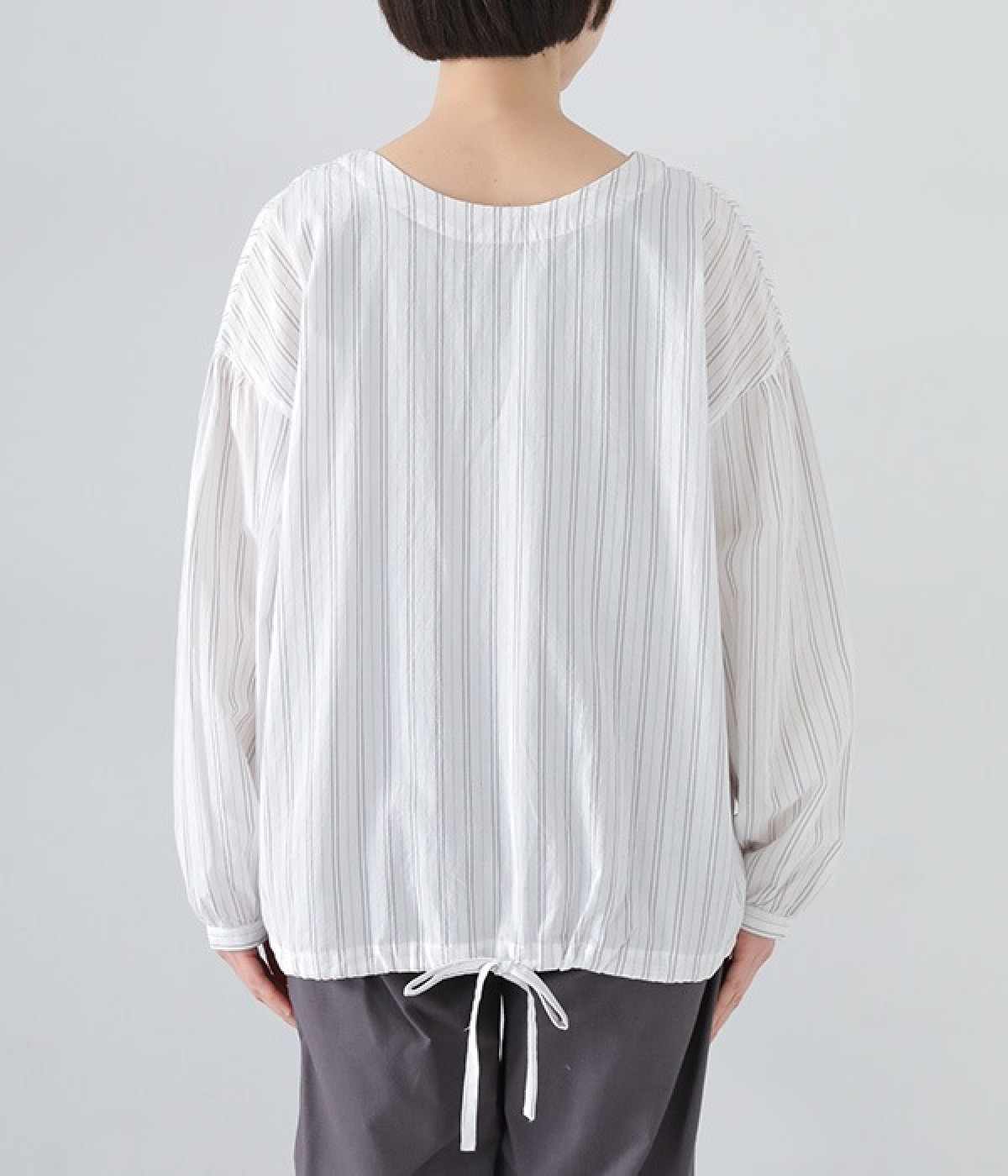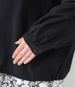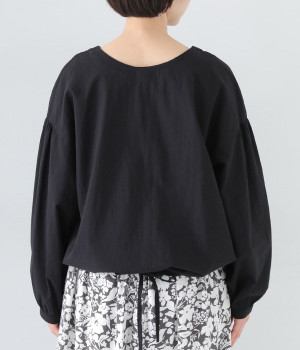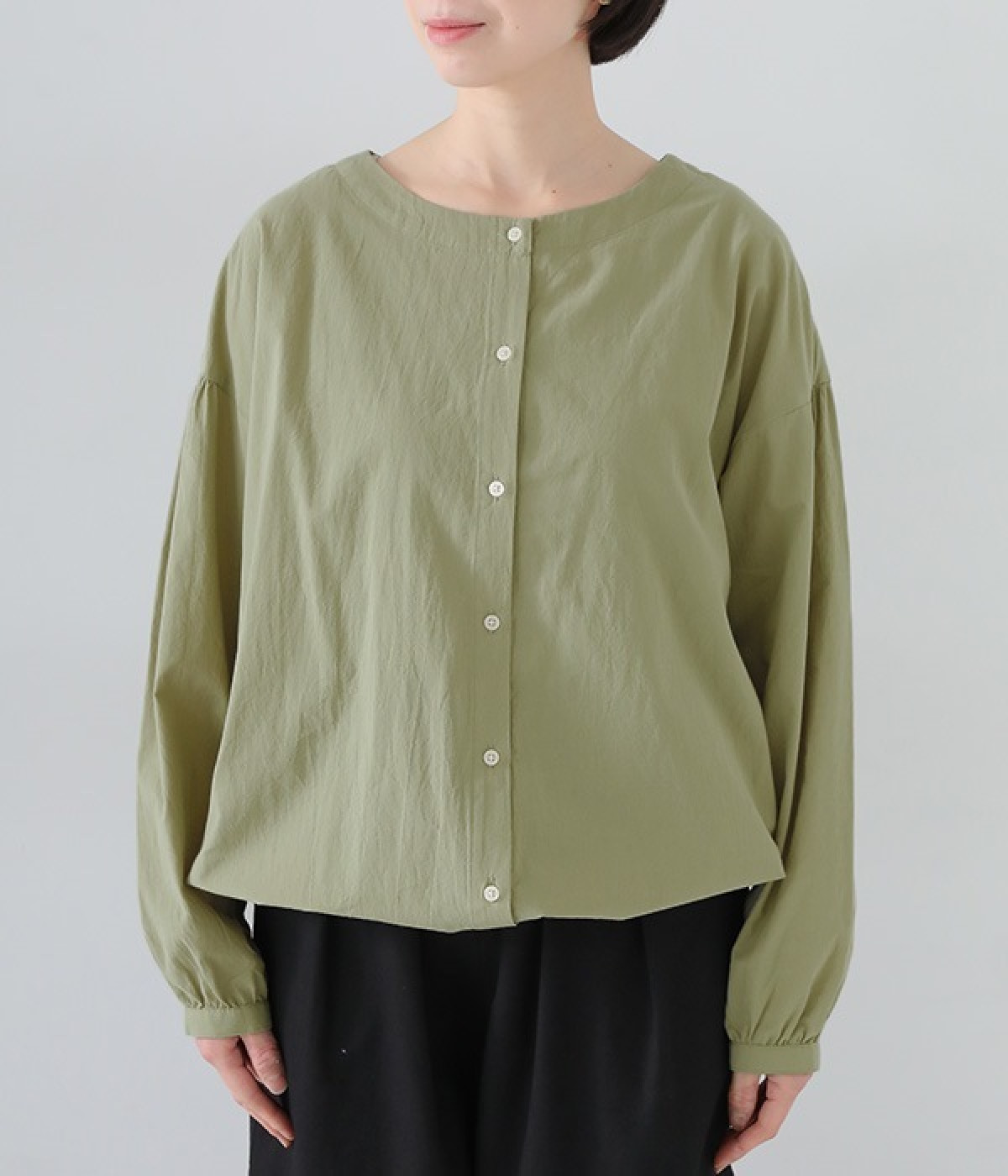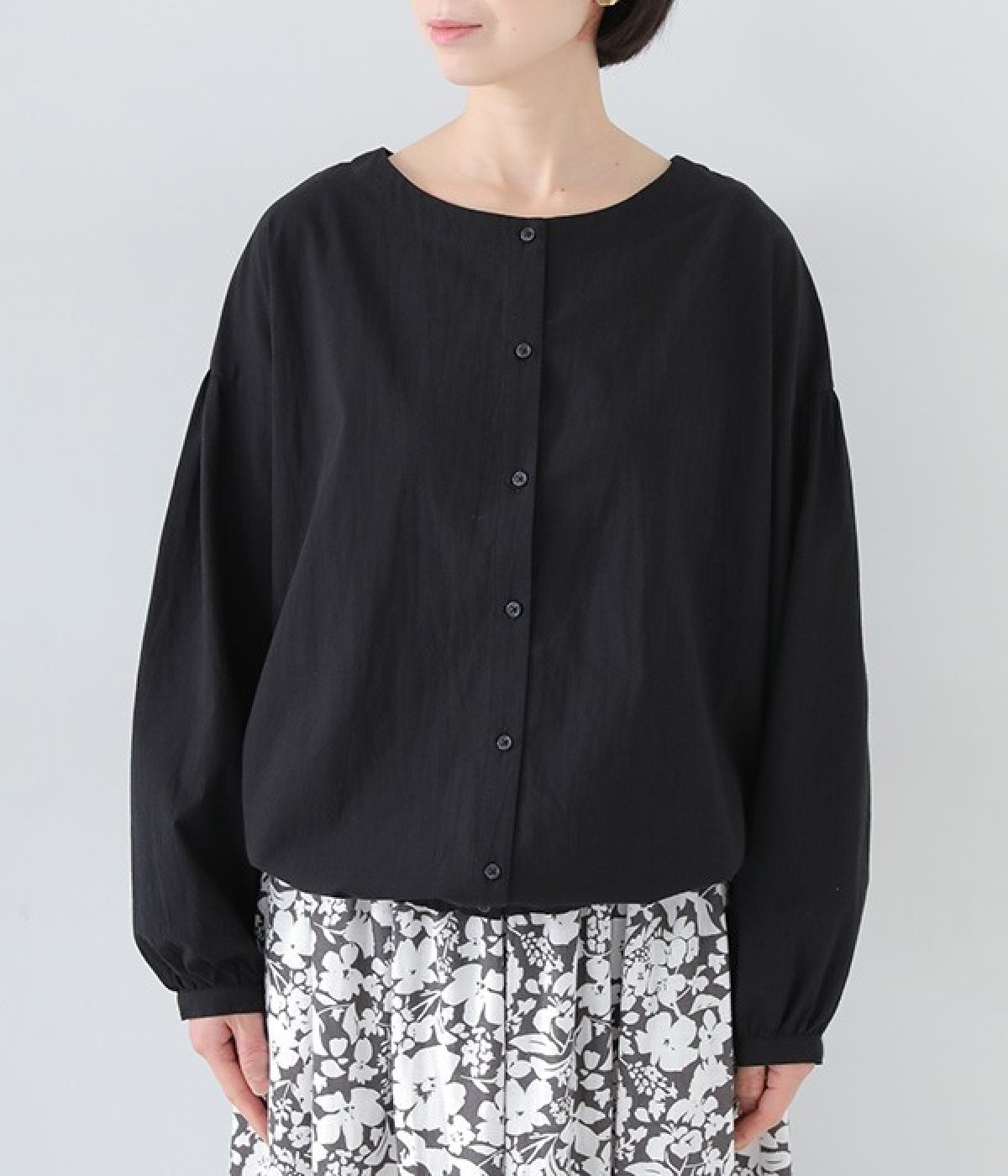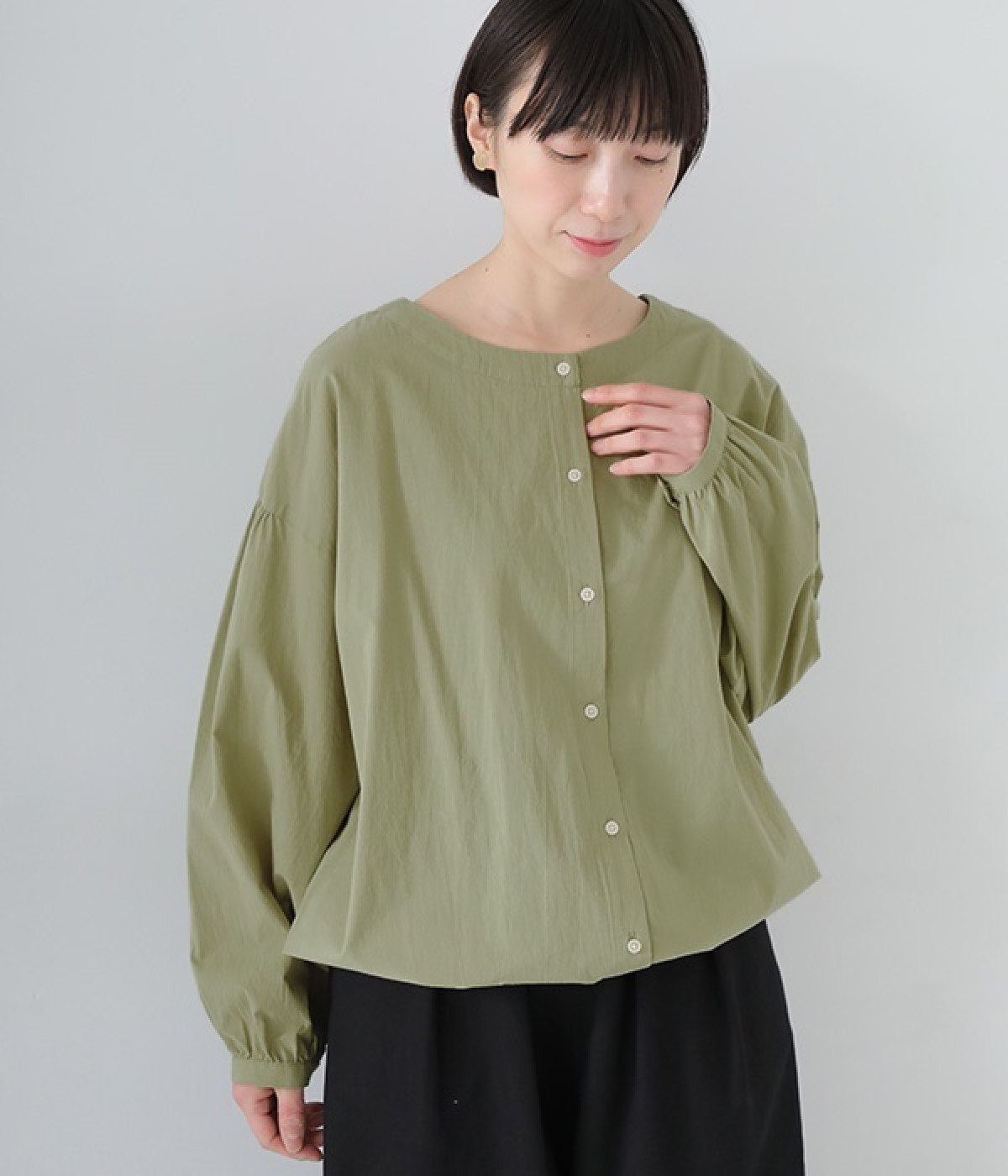 さらっとしたシャリ味を感じる、サンドウォッシュ加工をほどこしたプルオーバー。裾のドローストリングを絞ると、シルエットに丸みが出る自由なデザインで飽きが来ません。さらに前後でも着られるため、羽織りとして着たいときにはボタン側を前にすることも可能。ギャザーを入れたぽわん袖は、着るだけで二の腕をカバーするのも◎。気分に応じて印象の変化が狙える、アレンジ力の高さが自慢の一枚です。