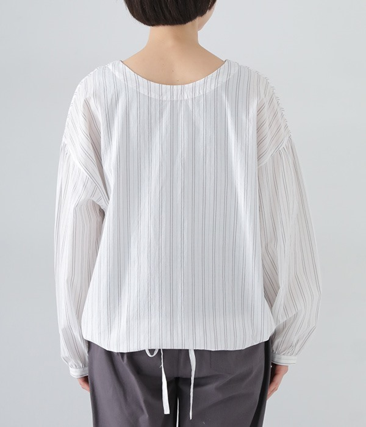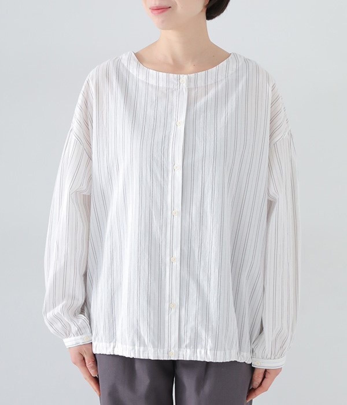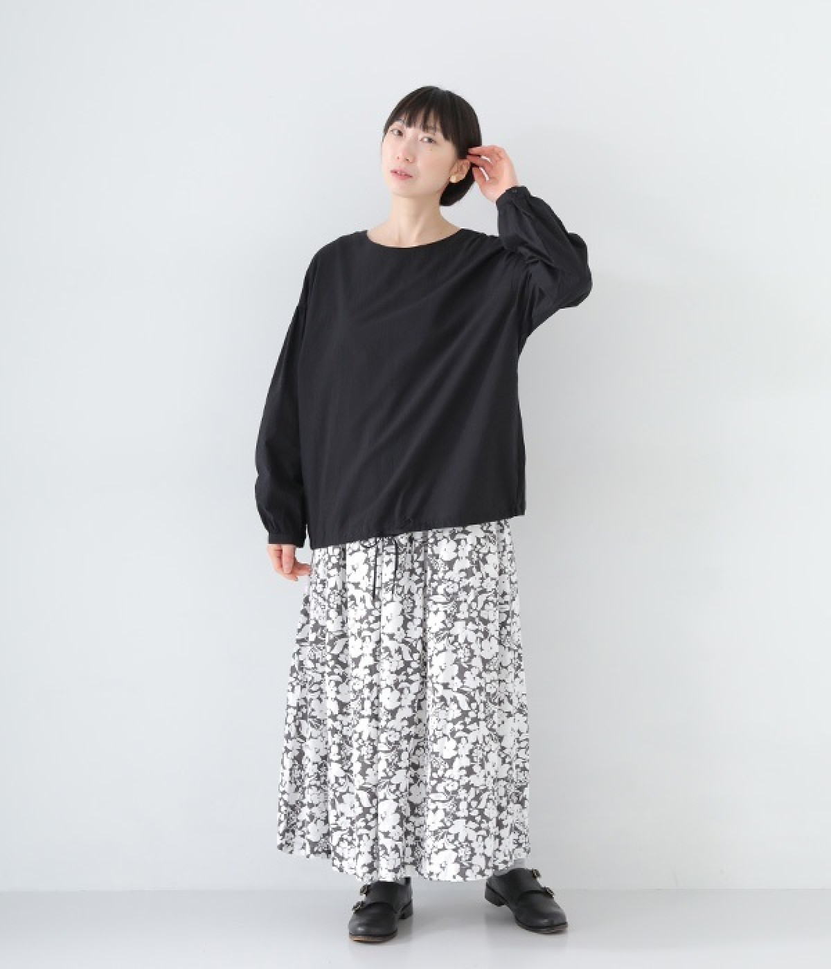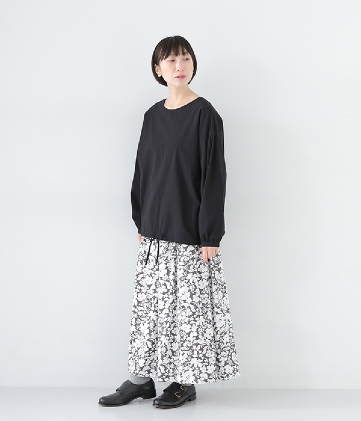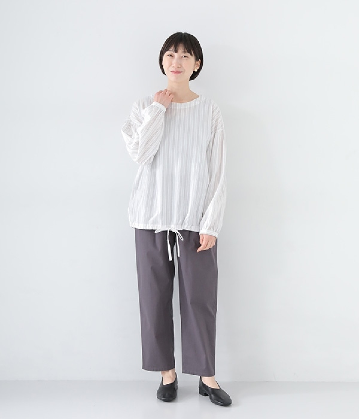 さらっとしたシャリ味を感じる、サンドウォッシュ加工をほどこしたプルオーバー。裾のドローストリングを絞ると、シルエットに丸みが出る自由なデザインで飽きが来ません。さらに前後でも着られるため、羽織りとして着たいときにはボタン側を前にすることも可能。ギャザーを入れたぽわん袖は、着るだけで二の腕をカバーするのも◎。気分に応じて印象の変化が狙える、アレンジ力の高さが自慢の一枚です。