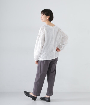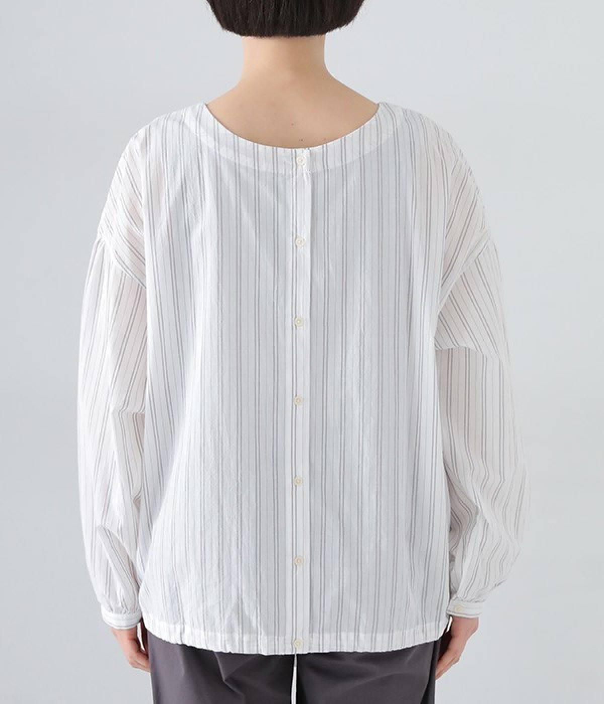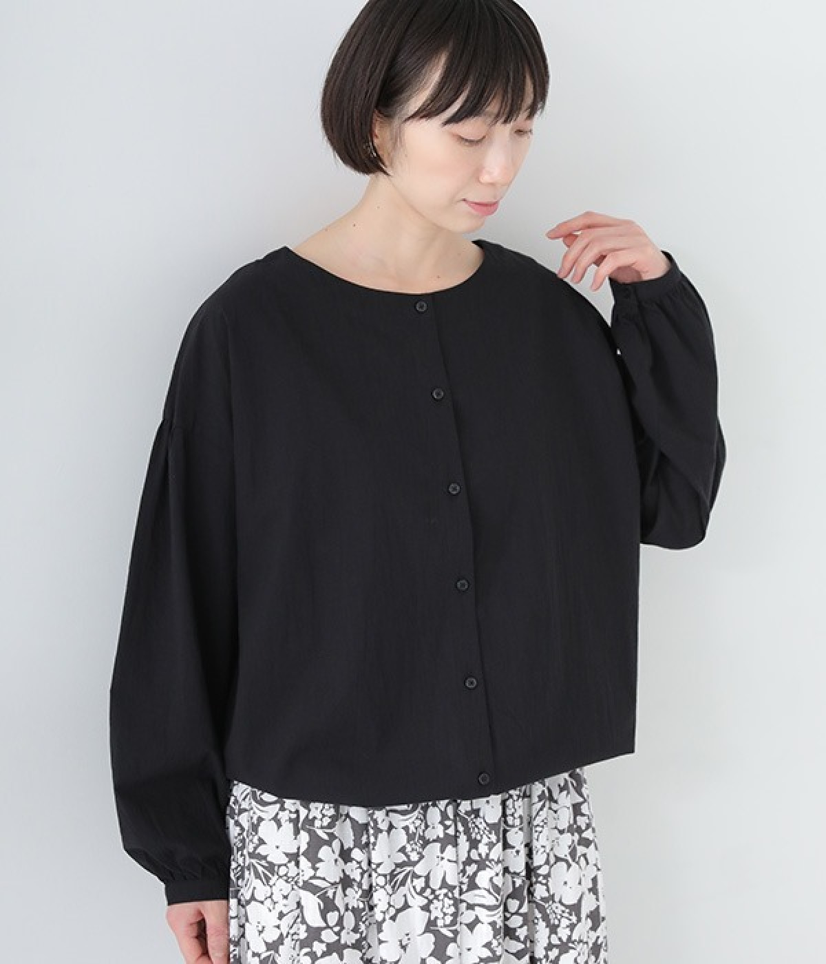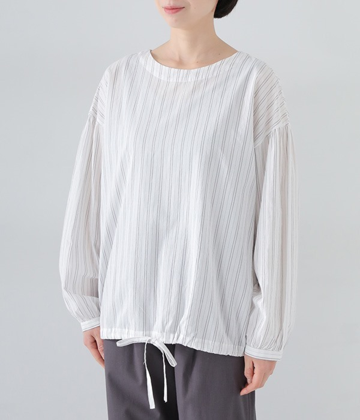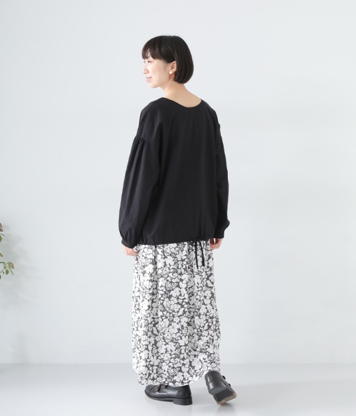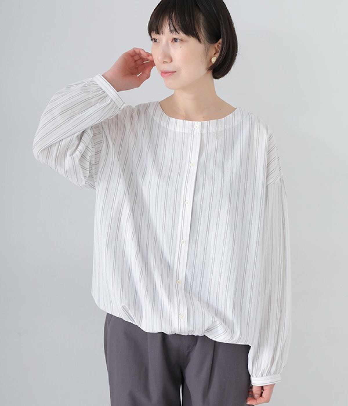 さらっとしたシャリ味を感じる、サンドウォッシュ加工をほどこしたプルオーバー。裾のドローストリングを絞ると、シルエットに丸みが出る自由なデザインで飽きが来ません。さらに前後でも着られるため、羽織りとして着たいときにはボタン側を前にすることも可能。ギャザーを入れたぽわん袖は、着るだけで二の腕をカバーするのも◎。気分に応じて印象の変化が狙える、アレンジ力の高さが自慢の一枚です。