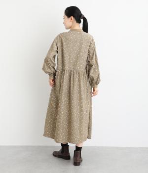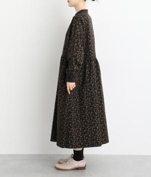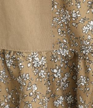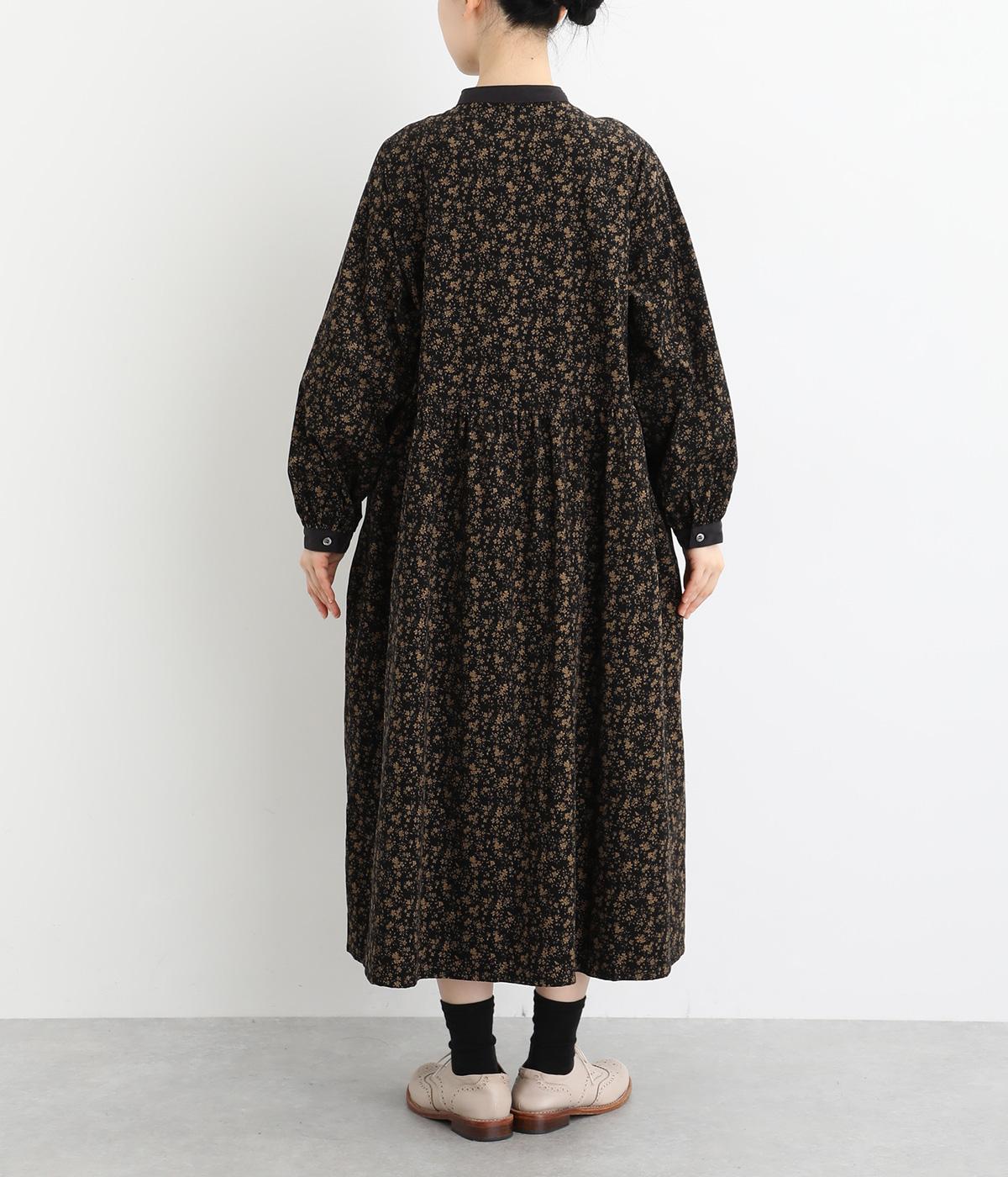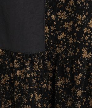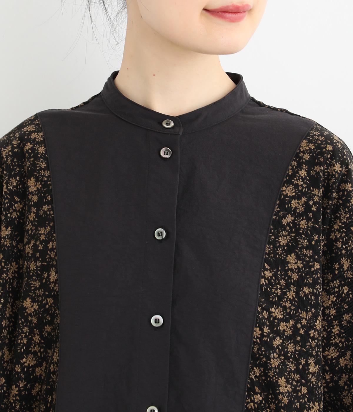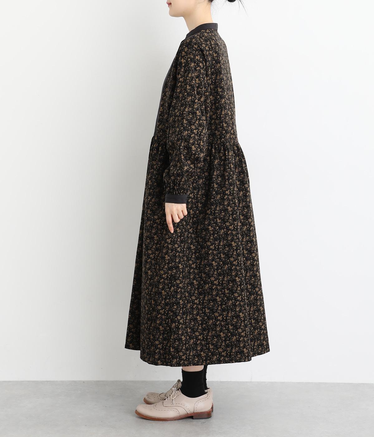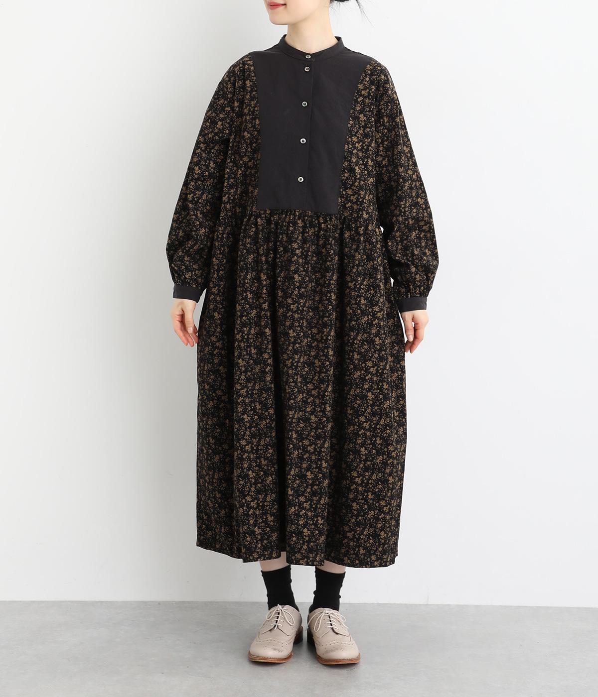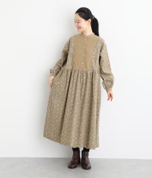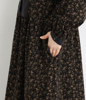 肌にやさしくなじんでくれるコットンコーデュロイ。胸元のシャツ部分の別布はナイロンを使用しています。あたたかみのある質感の生地に花柄プリントを施し、上品に仕上げました。
