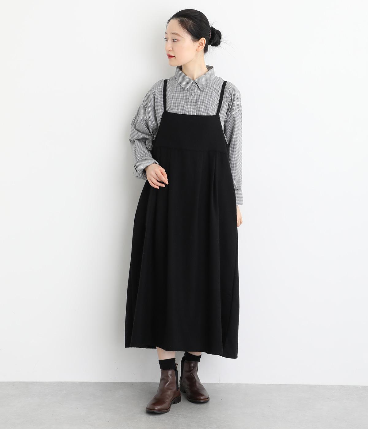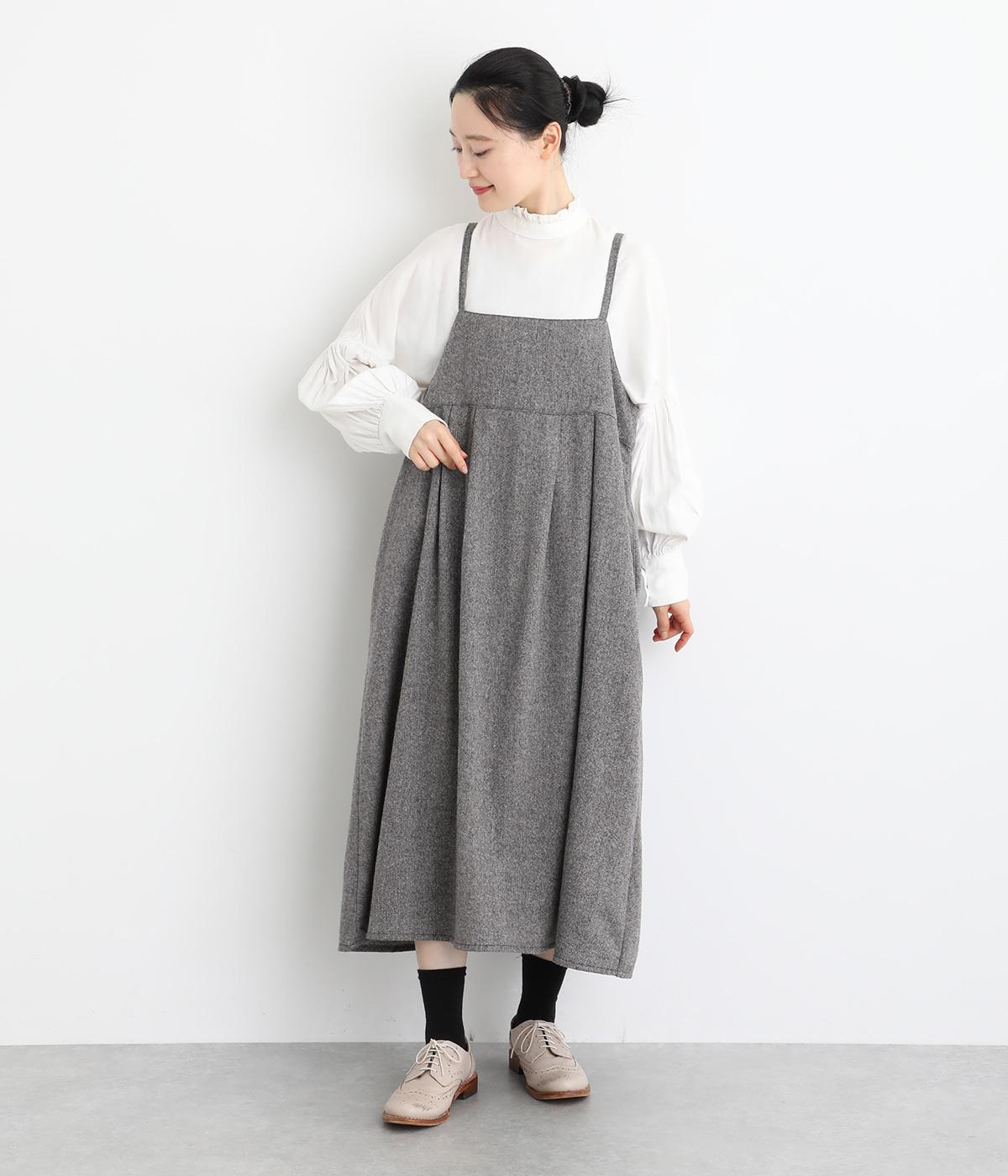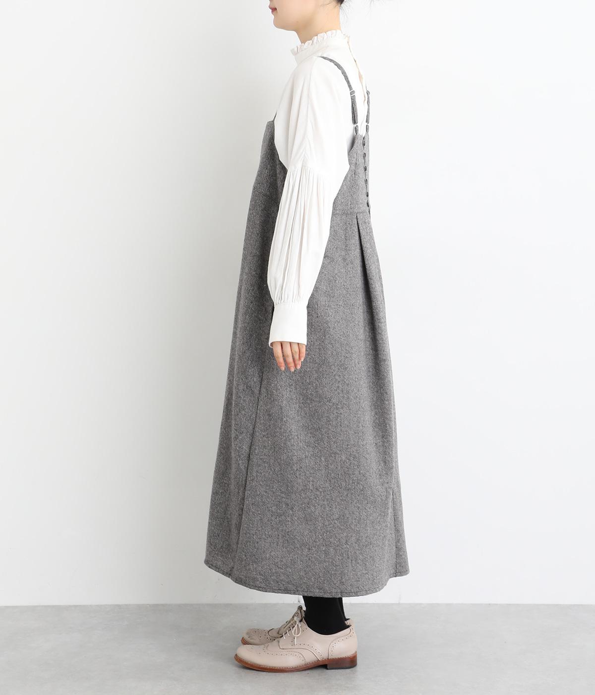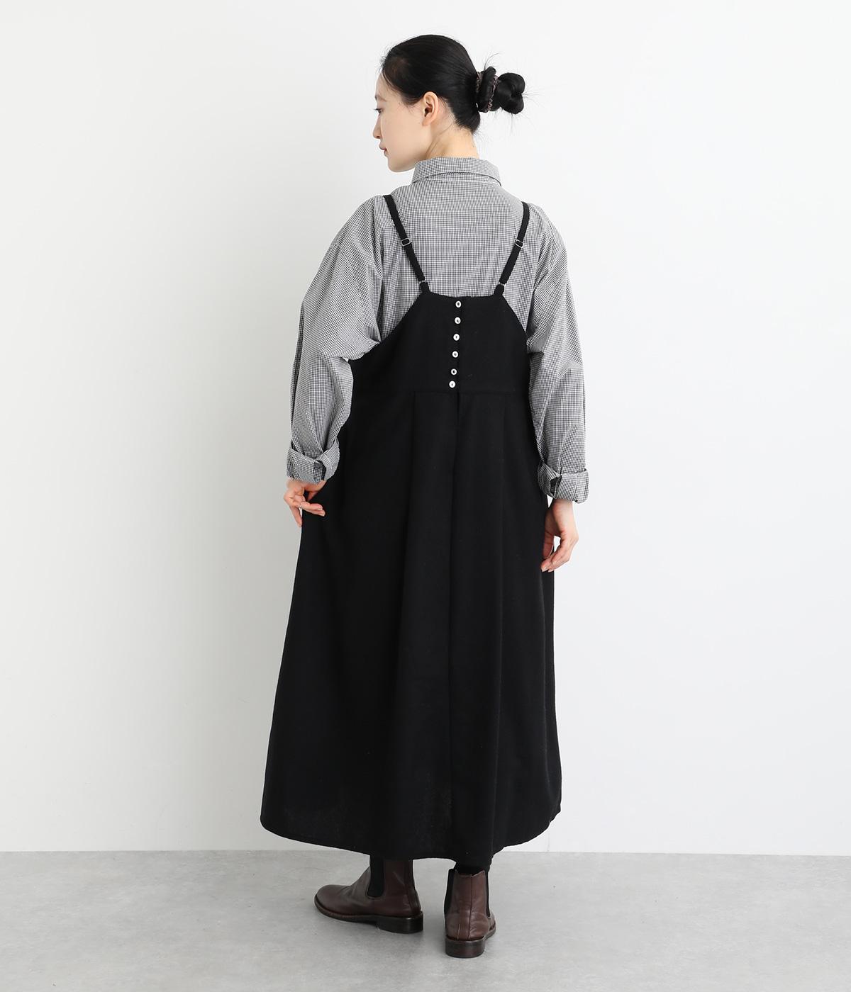 ほっこりしたあたたかい雰囲気を醸し出すウール素材のキャミワンピース。シンプルなデザインなので、合わせるインナーやシューズを選ばず、多種多様なコーディネートが可能。背中側のボタンがアクセントになり、こなれた雰囲気を演出します。