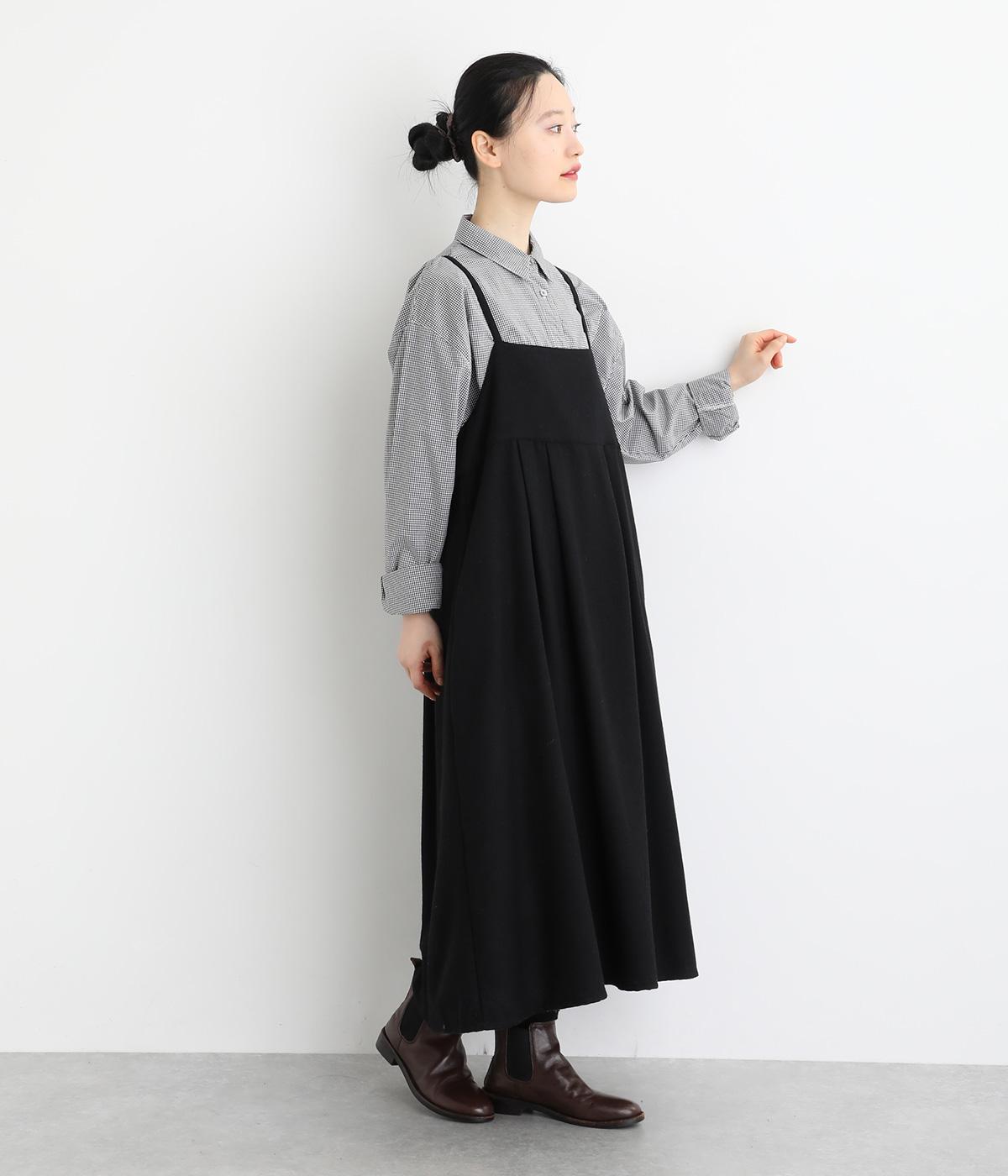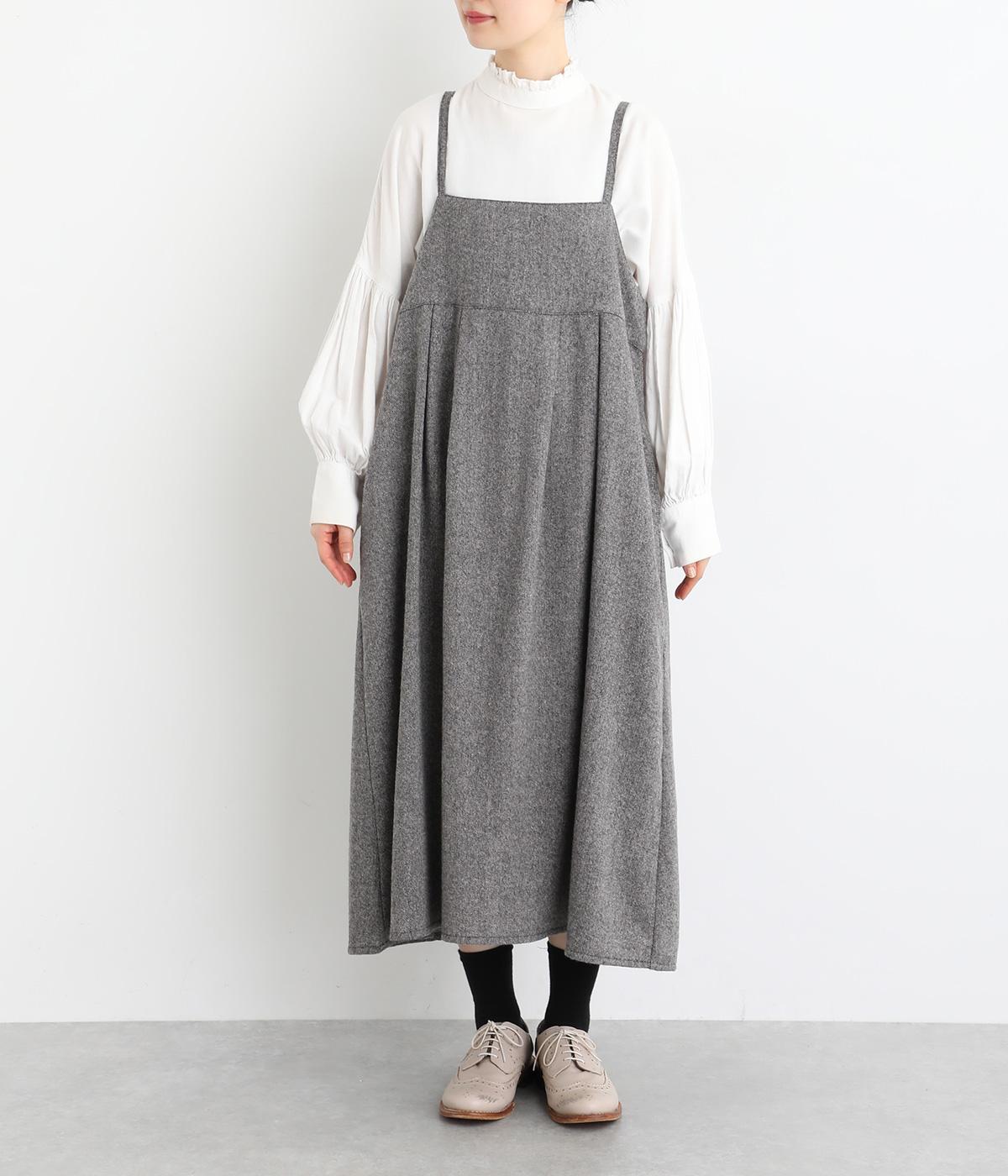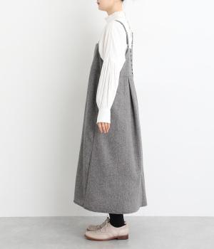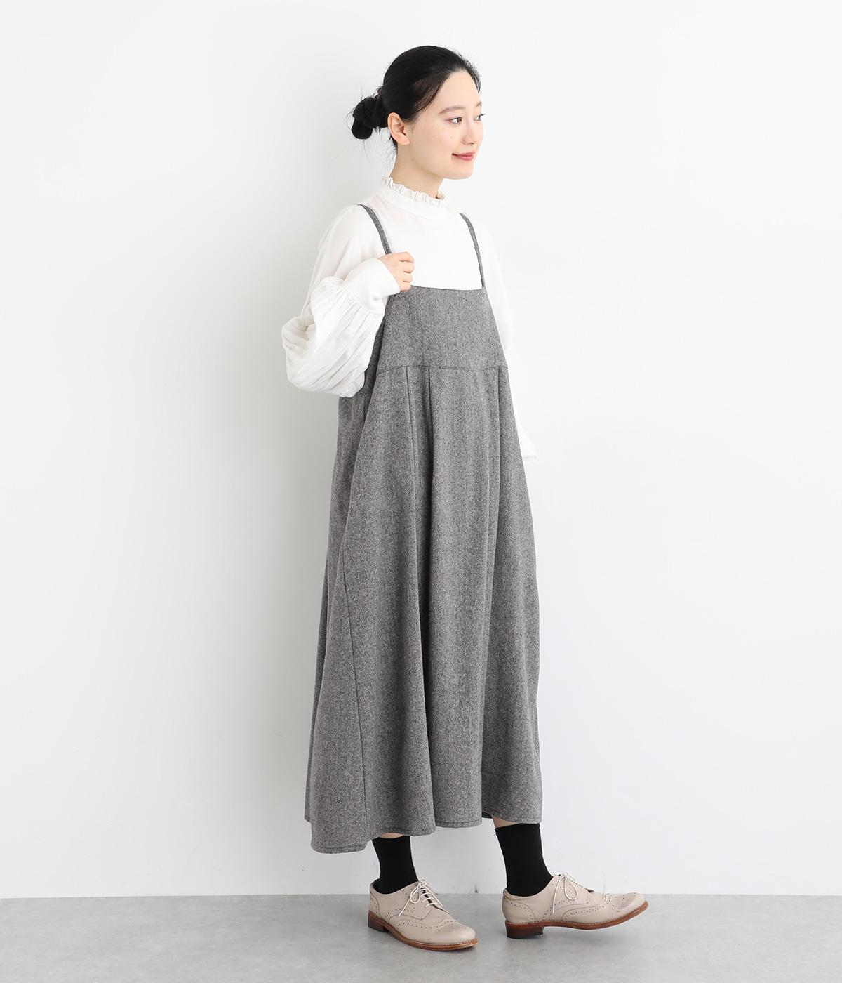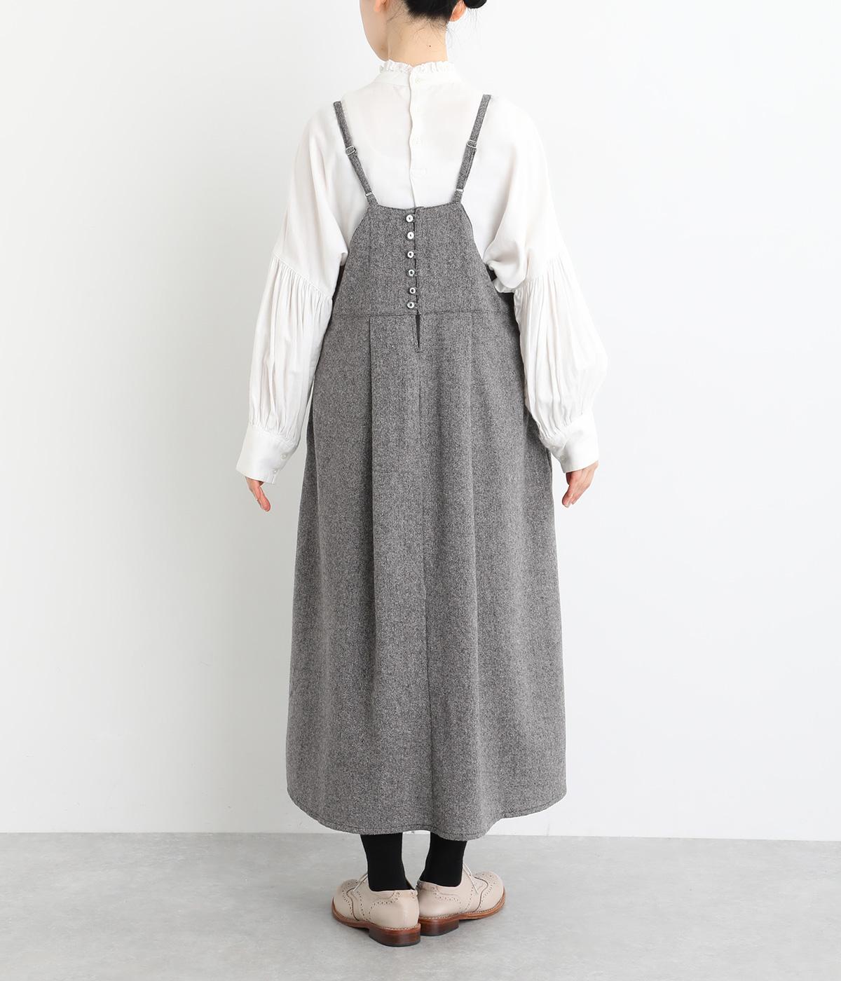 ほっこりしたあたたかい雰囲気を醸し出すウール素材のキャミワンピース。シンプルなデザインなので、合わせるインナーやシューズを選ばず、多種多様なコーディネートが可能。背中側のボタンがアクセントになり、こなれた雰囲気を演出します。