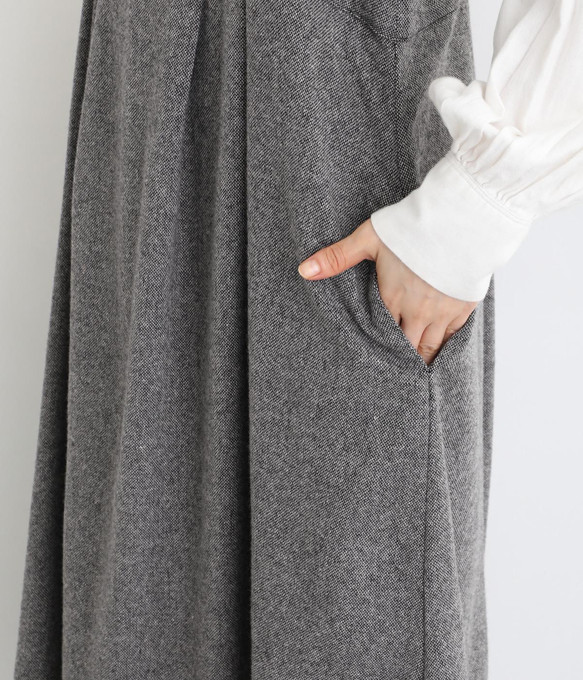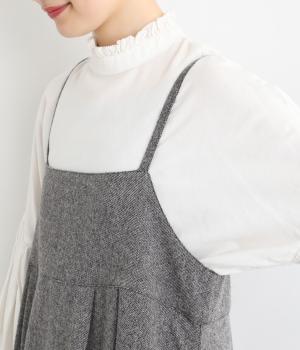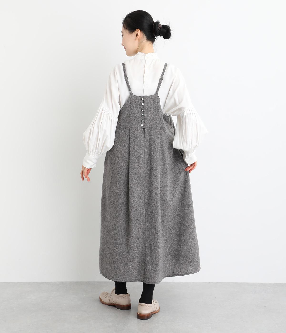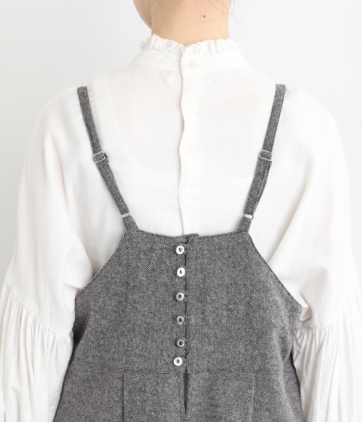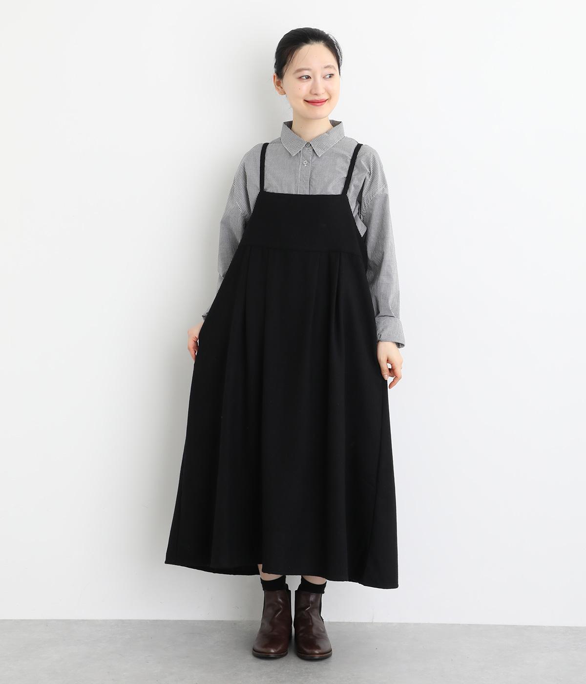ほっこりしたあたたかい雰囲気を醸し出すウール素材のキャミワンピース。シンプルなデザインなので、合わせるインナーやシューズを選ばず、多種多様なコーディネートが可能。背中側のボタンがアクセントになり、こなれた雰囲気を演出します。