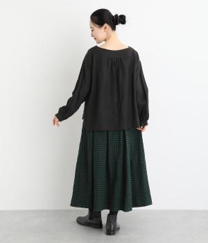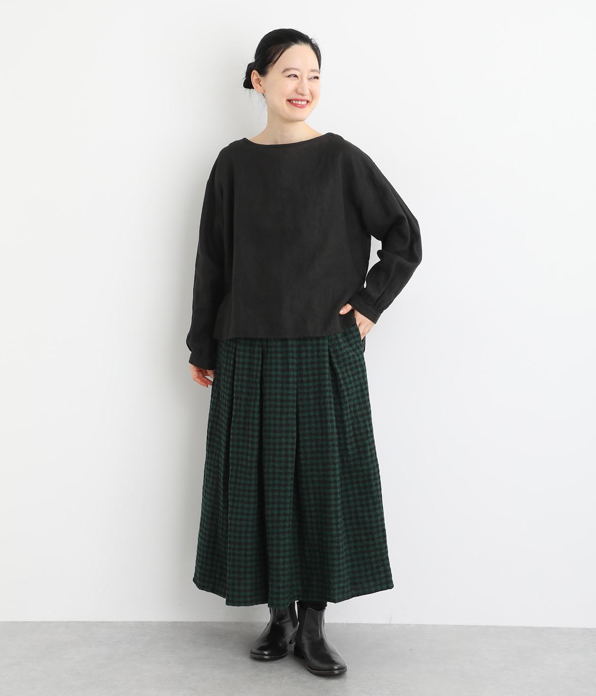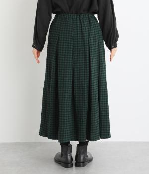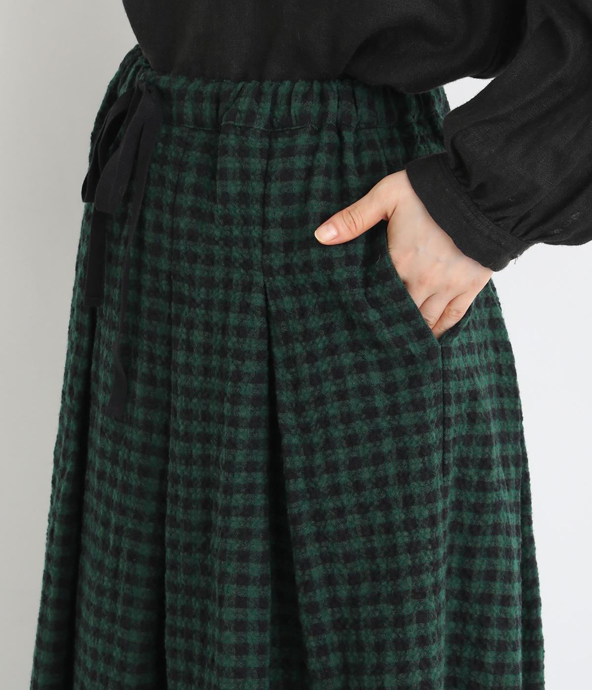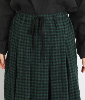 子どもっぽくなりすぎない深みのあるギンガムチェック柄が特徴のタックスカート。凹凸のある生地とタック入りのデザインで、全体を通して立体的なシルエットに仕上がっています。ウエストはイージーに着用できる一周ゴム。