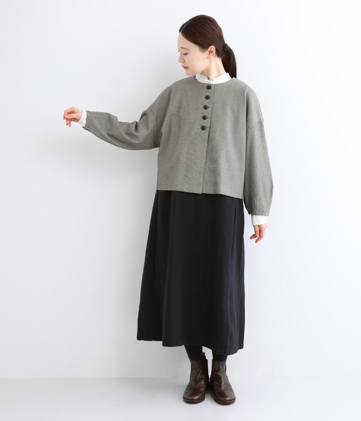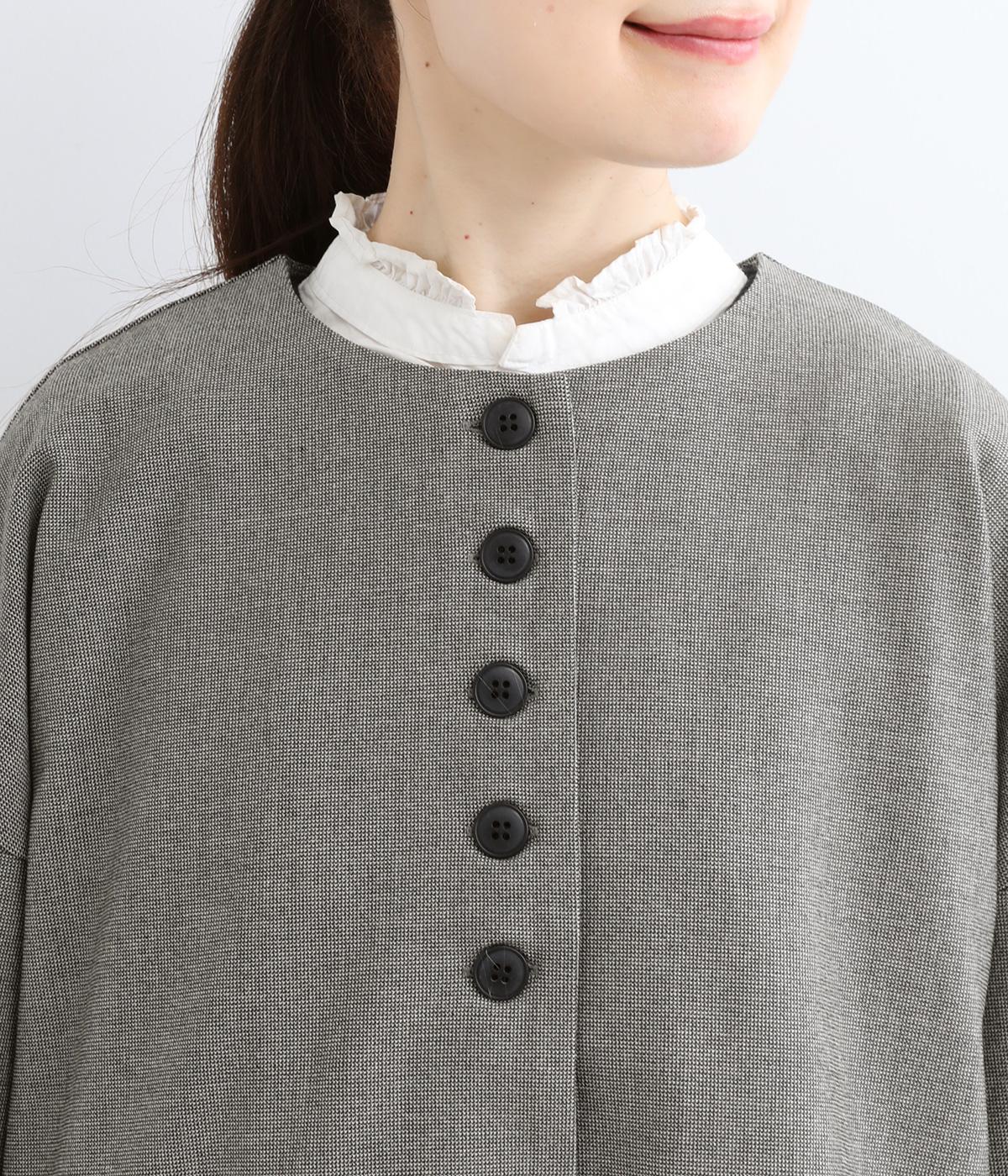 すっきりとしたクルーネックと袖口にダーツを入れてふくらみを持たせた袖のフォルムが上品なジャケット。後ろ裾にはタックを施して、後ろ姿のシルエットをすっきりと仕上げています。視線を上げて着こなしのバランスを整える、上半分に並べたフロントボタンもポイントです。