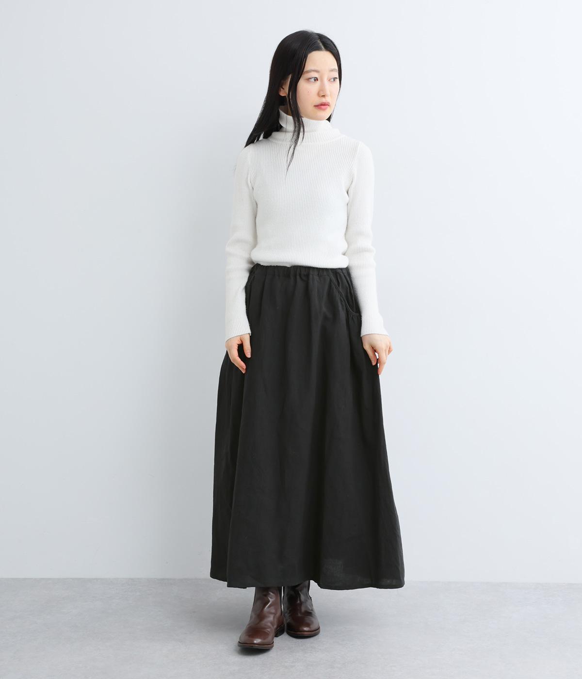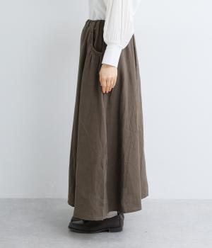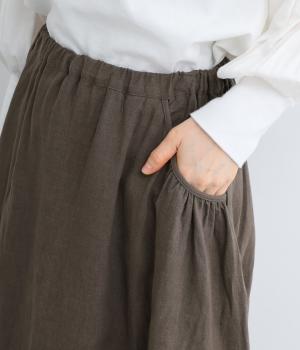 パイピングしたサイドポケットにギャザーをほどこしてニュアンスを持たせました。キレイめにもカジュアルにも着まわせる万能アイテムで、ロングシーズン楽しめます。ウエストは総ゴム使用で紐でサイズ調節が可能です。