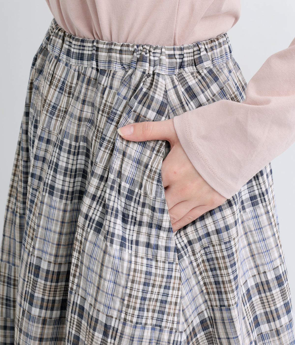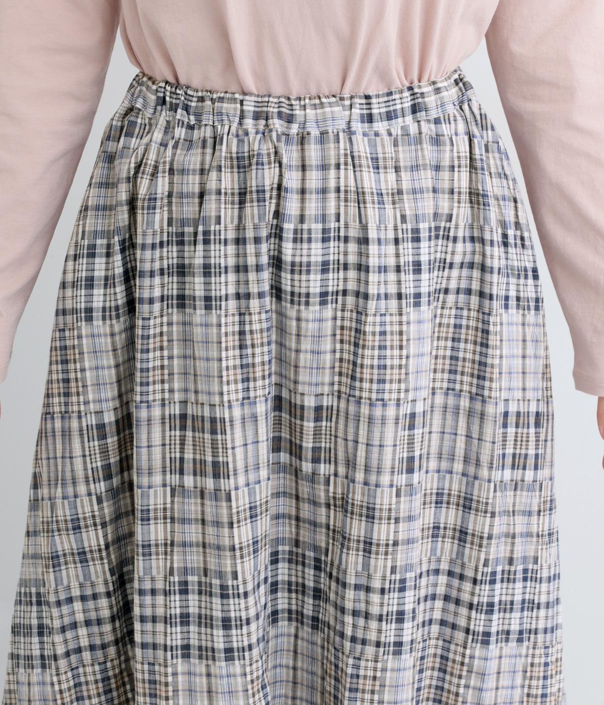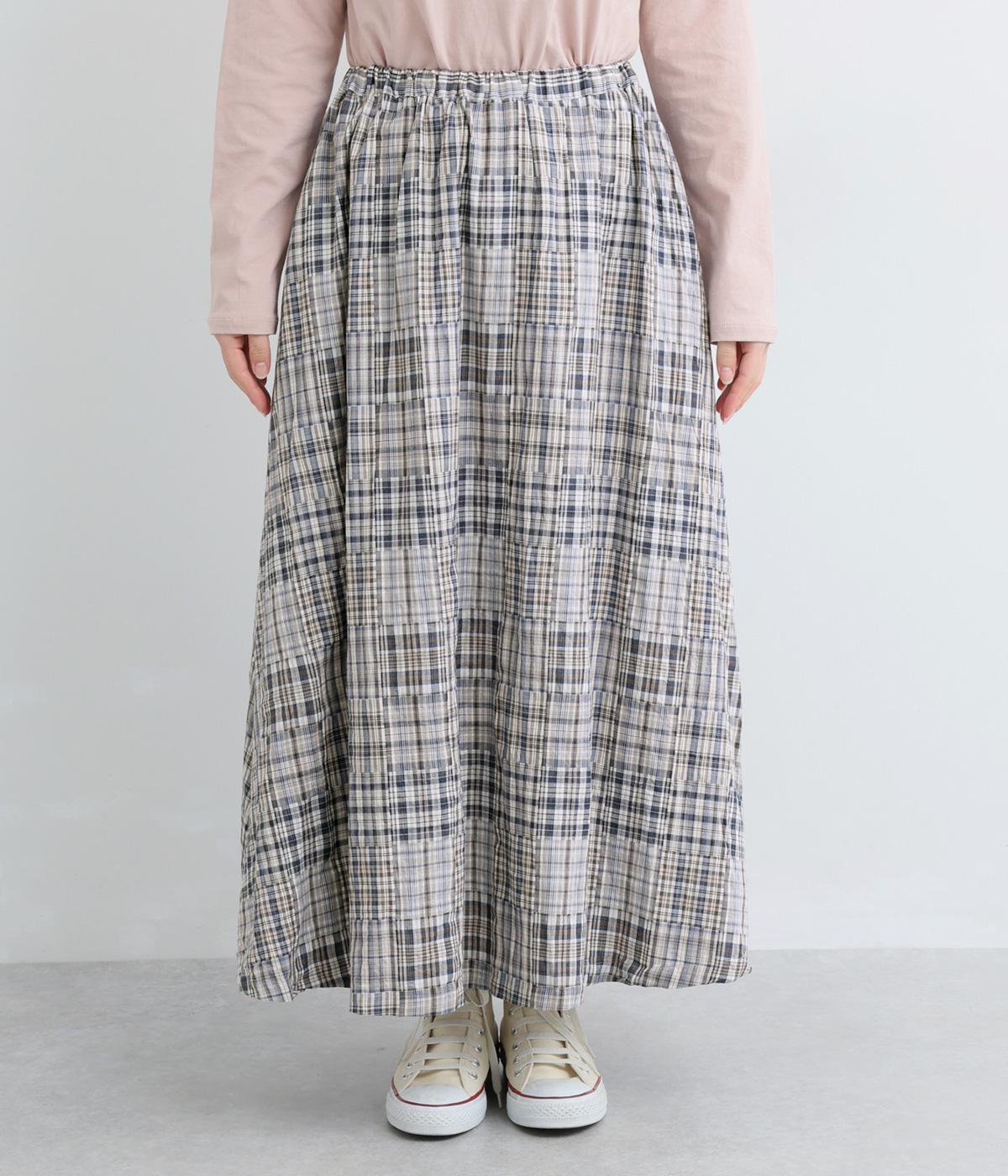 パッチワークの細かいチェック柄が目を引くギャザースカート。ふわりと揺れる軽やかさが魅力です。淡いトーンとナチュラルな風合いで優しい印象を与えてくれます。