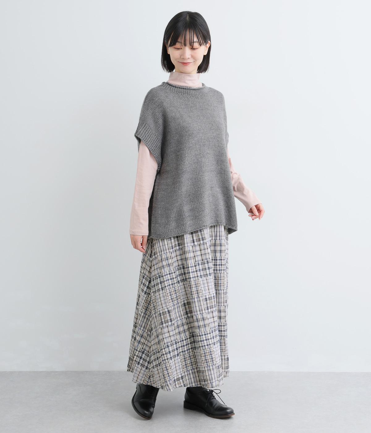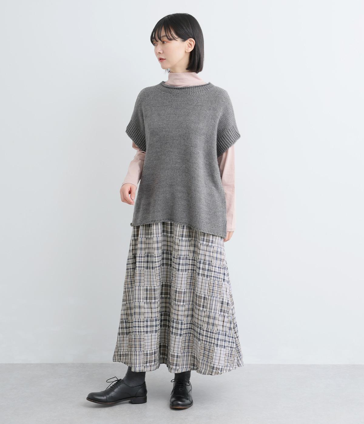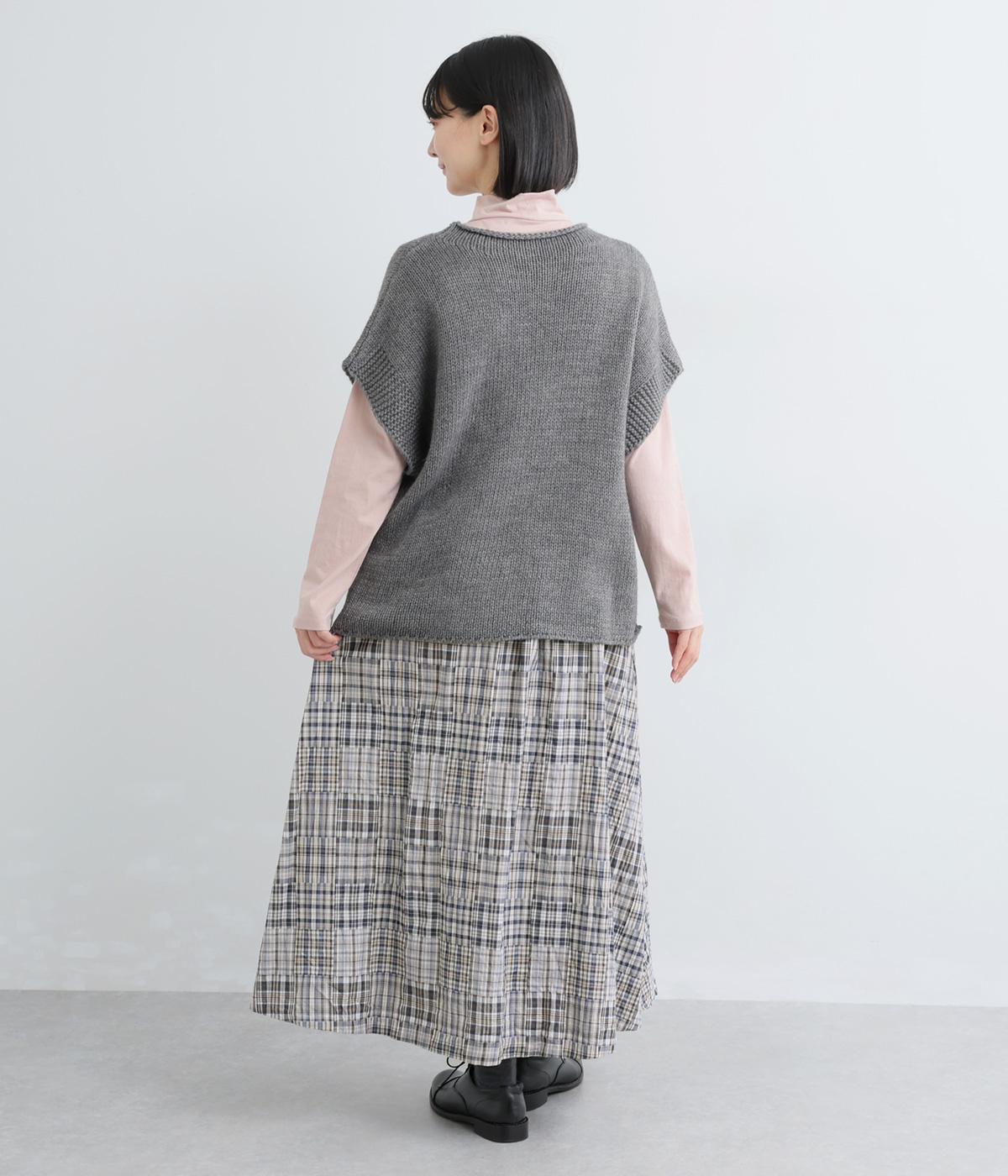 パッチワークの細かいチェック柄が目を引くギャザースカート。ふわりと揺れる軽やかさが魅力です。淡いトーンとナチュラルな風合いで優しい印象を与えてくれます。