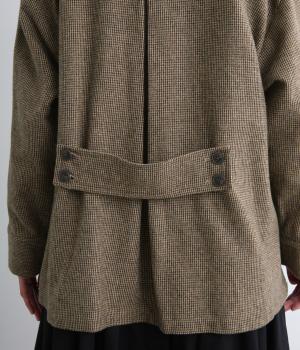 中にニットなど厚手のアイテムも着こめる、ゆったりサイズのコートです。首元のボタンの開閉具合で、雰囲気を変えた着こなしができます。後ろ姿も印象的に仕上げてくれるタブがポイントに。