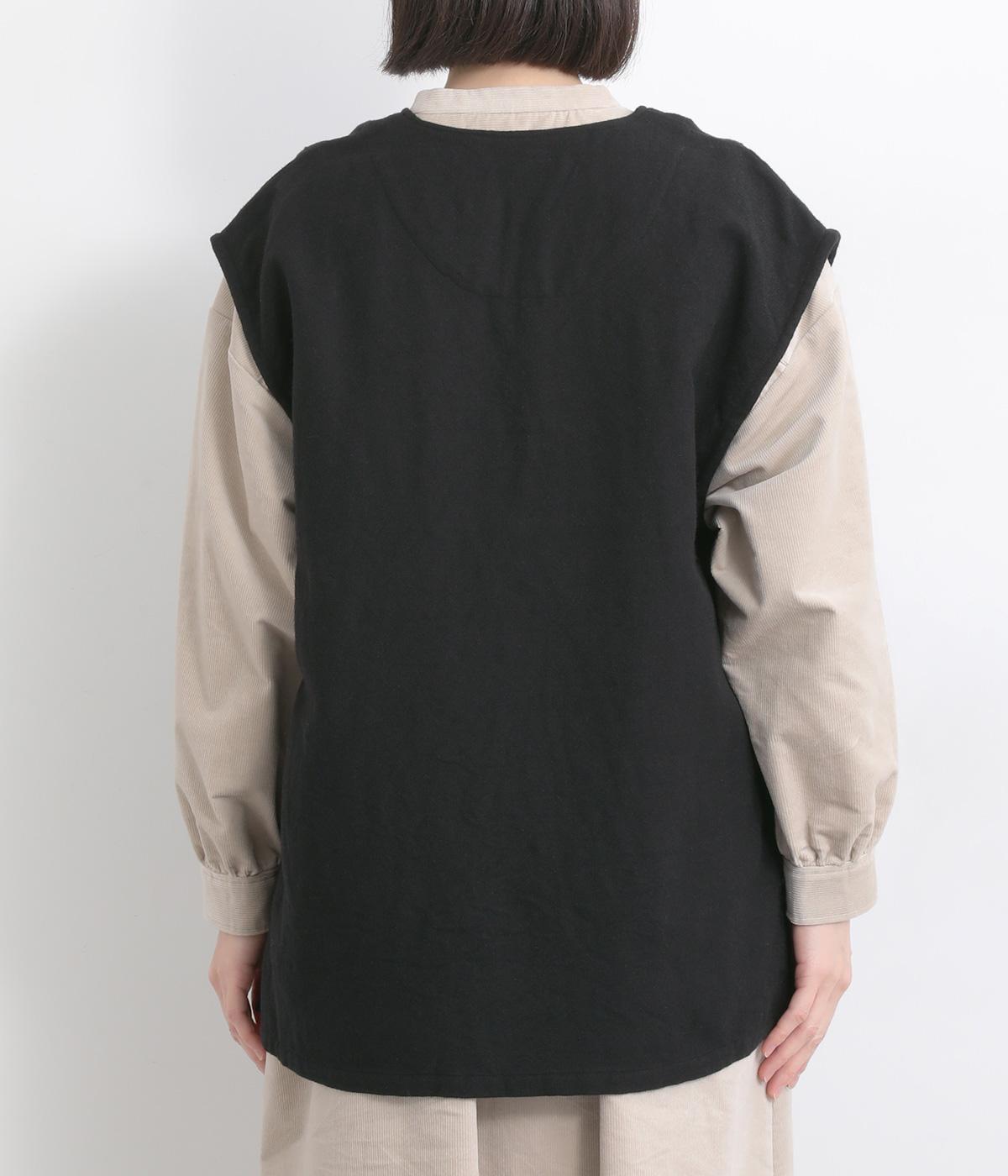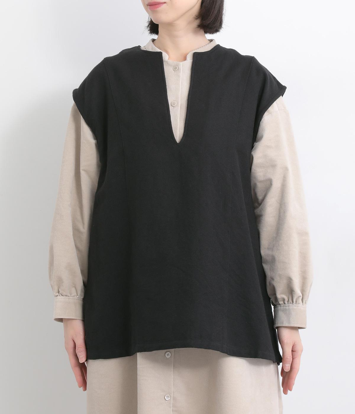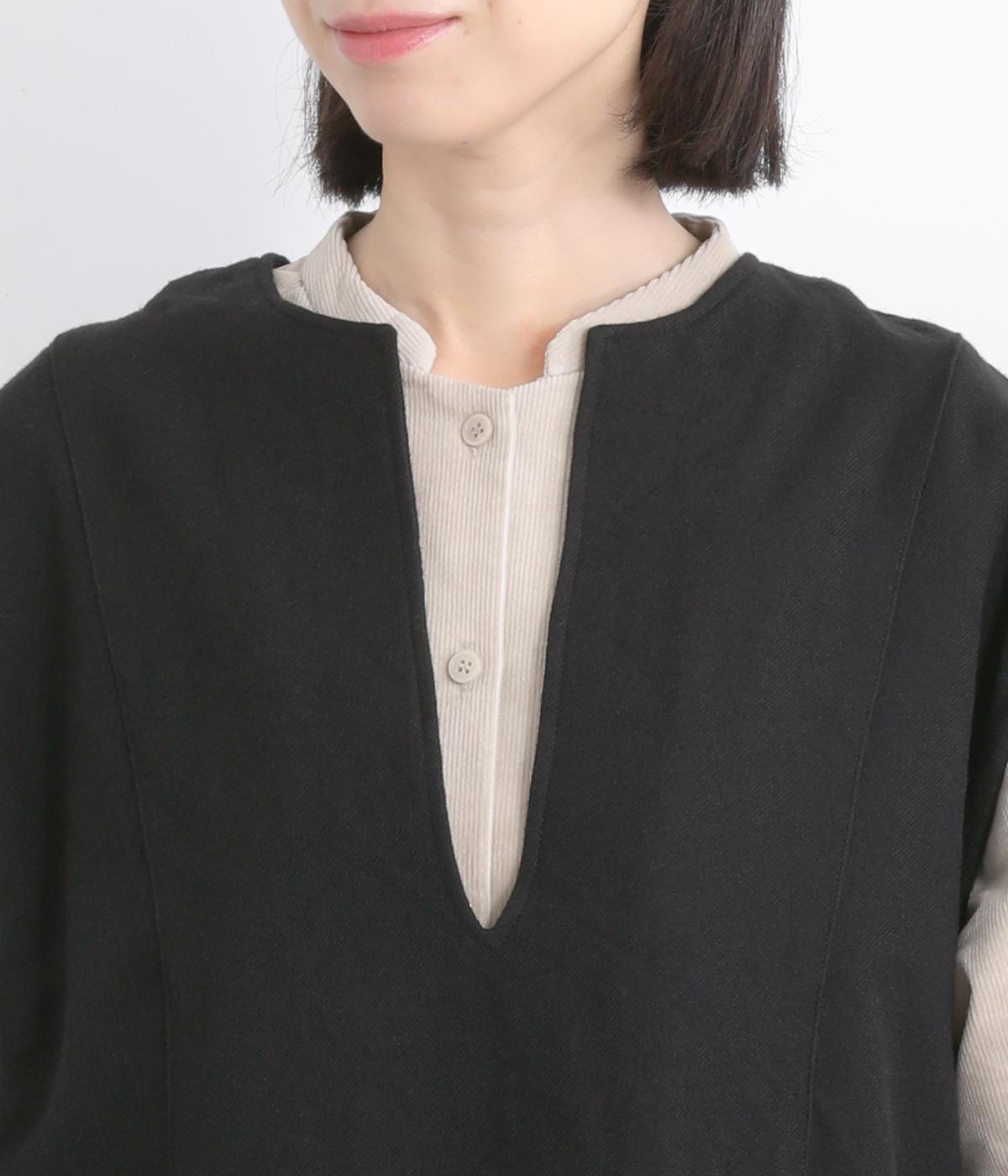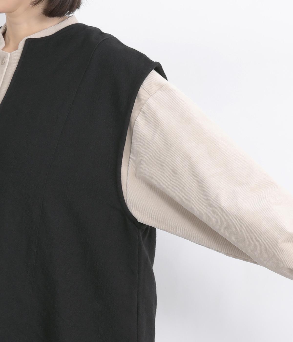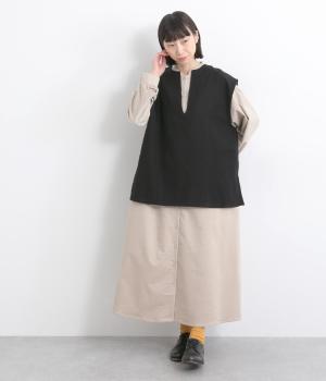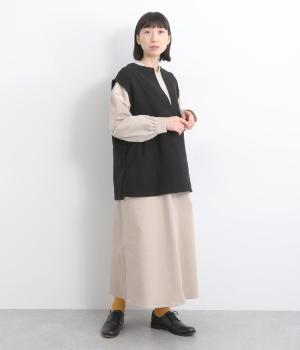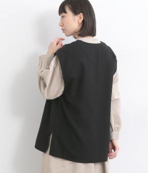 ややフレアになった、ゆったりシルエットのベストです。サイドスリット入りでワンピースなど分量のあるアイテムとも合わせやすく、さまざまなスタイリングにプラスできます。深いキーネックもポイントで、顔まわりに適度な抜け感を。