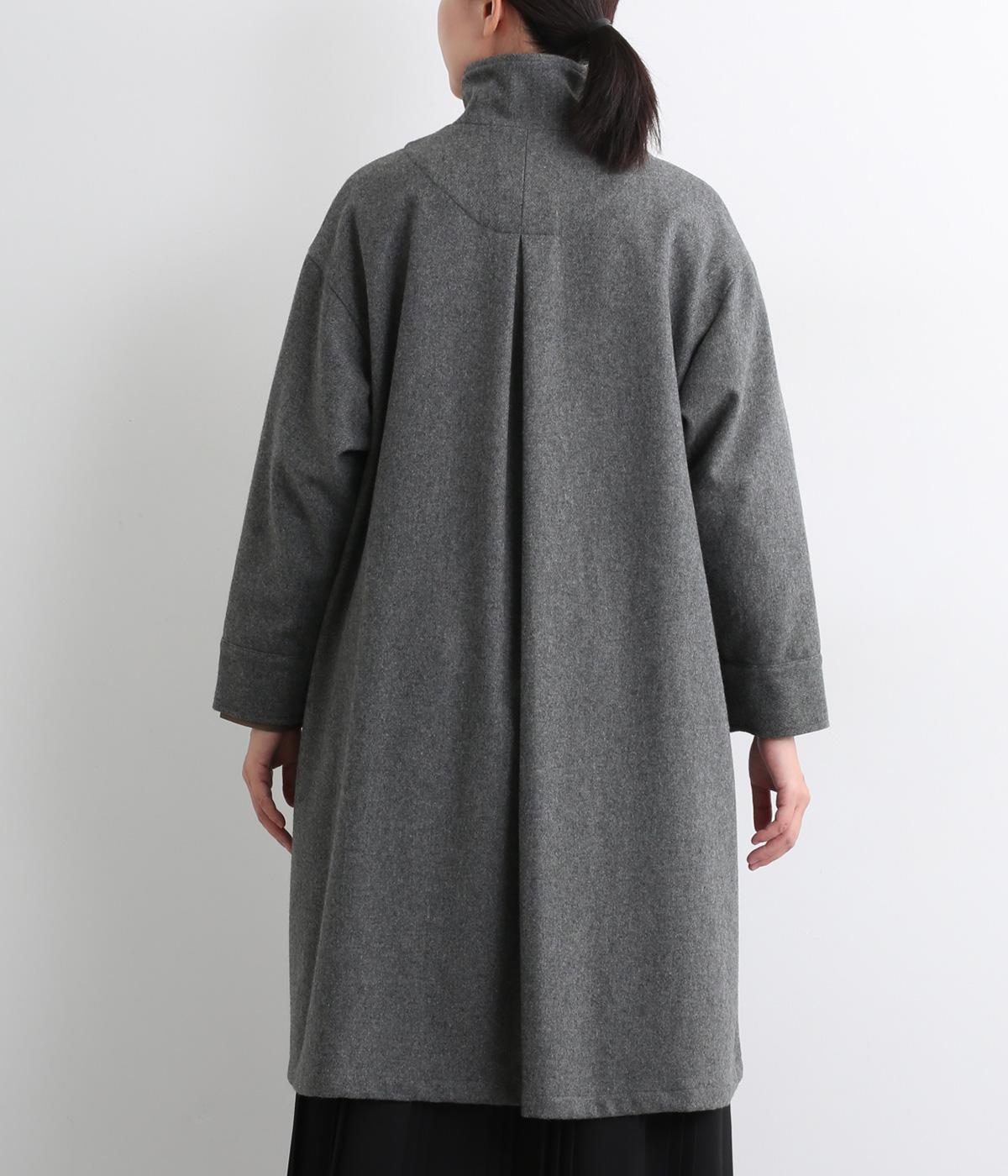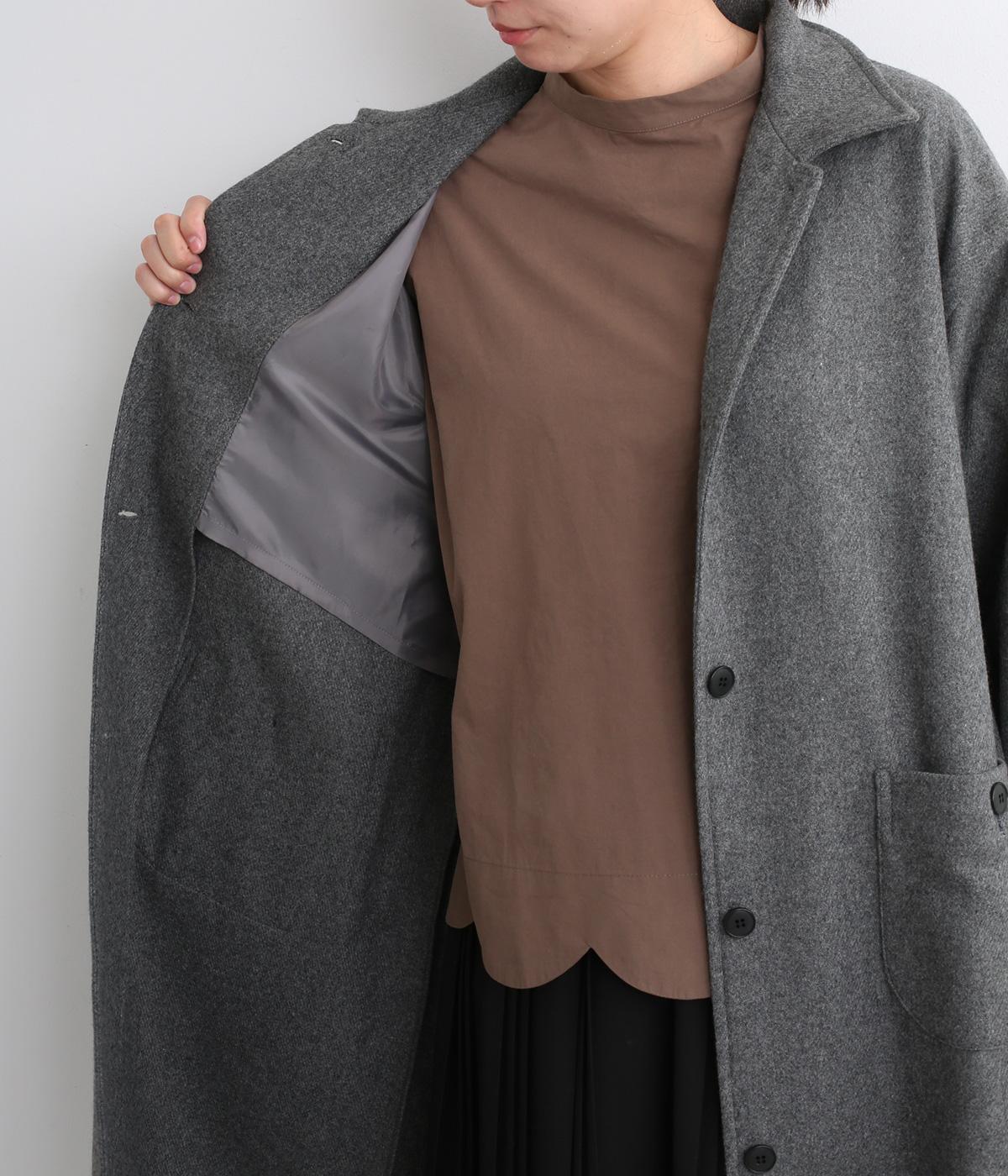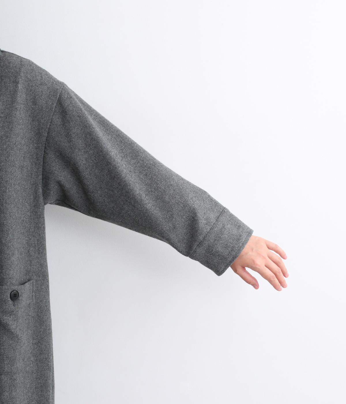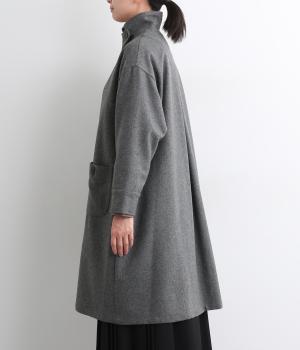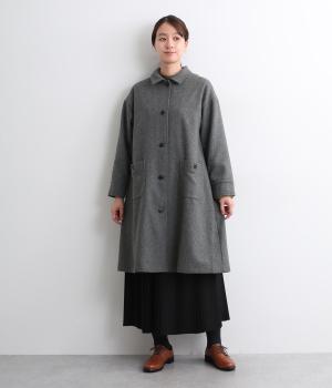 軽やかなのにあたたかいウールフラノで仕立てたロングコート。後ろにタック入りで、綺麗に広がるAラインを描きます。襟タブつきでスタンドカラーにすることもでき、雰囲気が変わるのも◎。厚手のニットなども着込めるので、真冬まで活躍します。