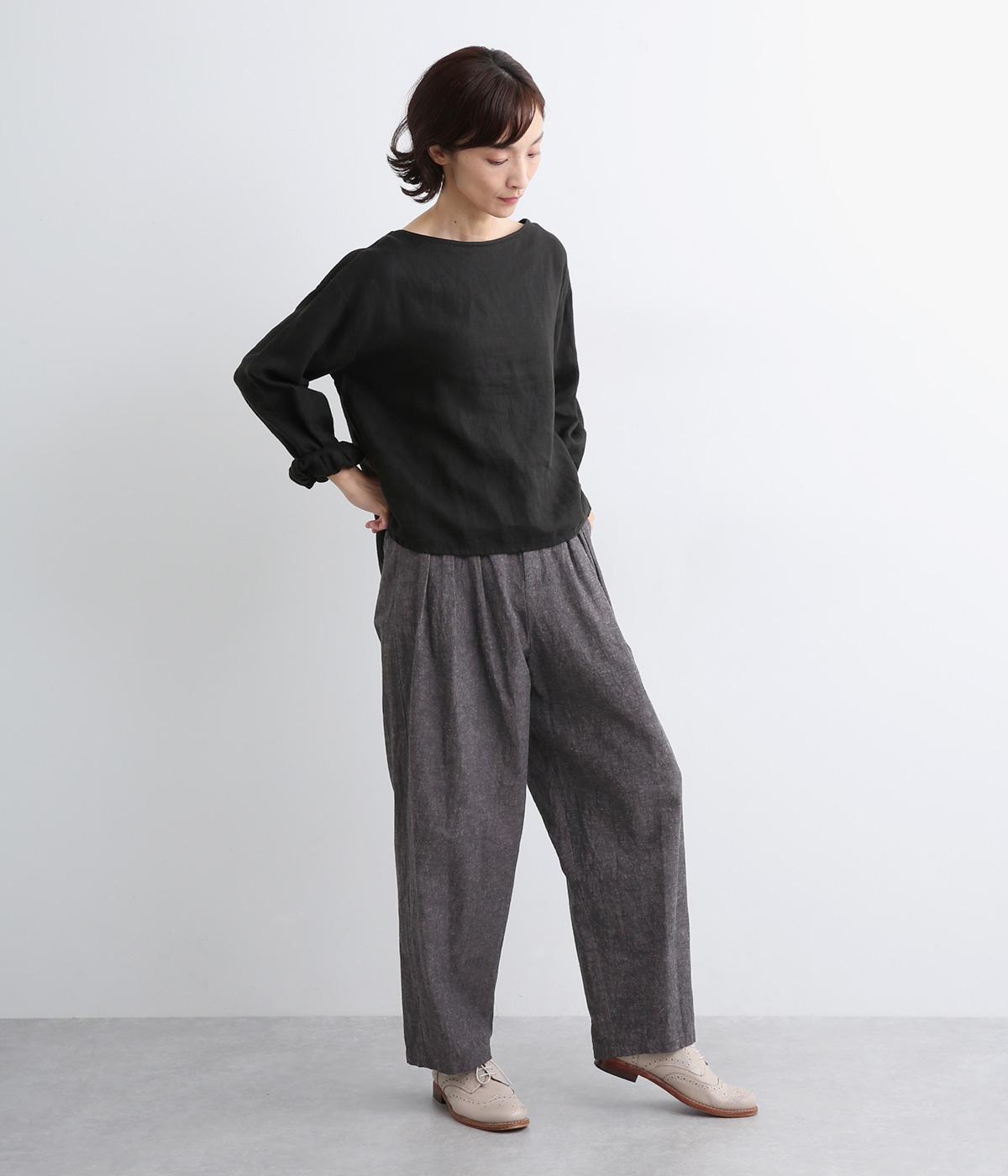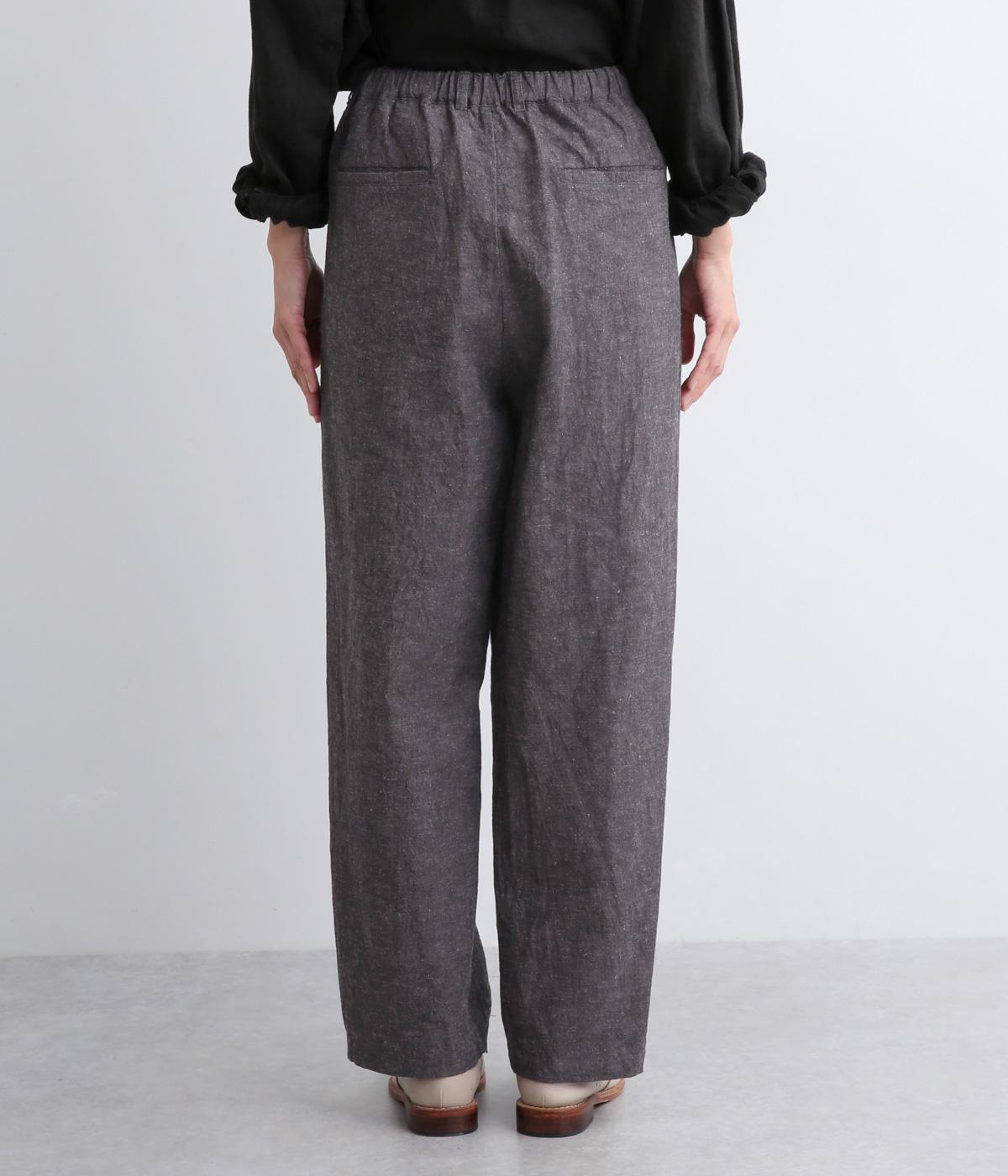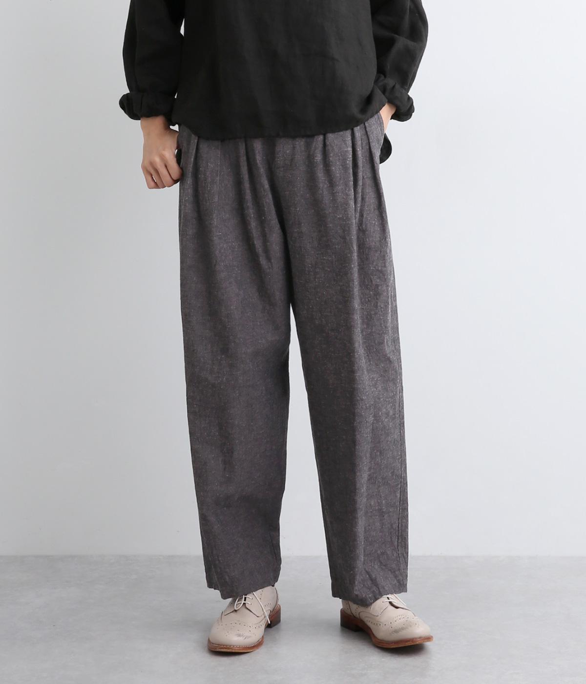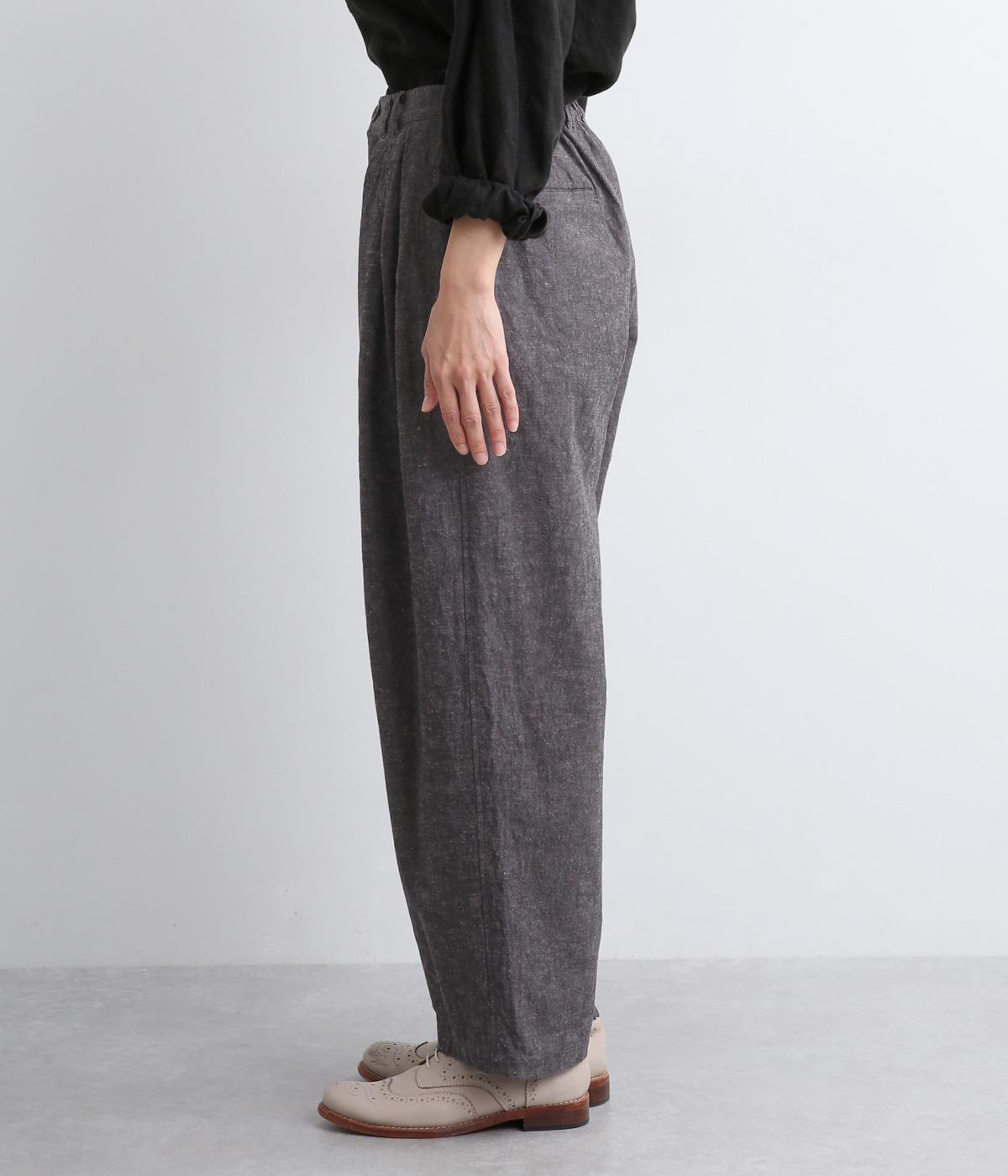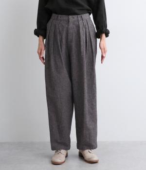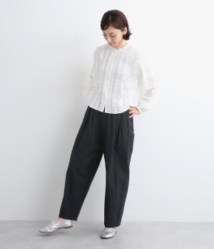 パリッとした生地感がシルエットをきれいに描くタックパンツ。素材感がいいのでラフな着こなしもさまになり、トップスインもおすすめ。前ファスナーで脱ぎはきしやすく、後ろゴム入りでフィット感もグッド。ループつきでベルトマークもたのしめます。