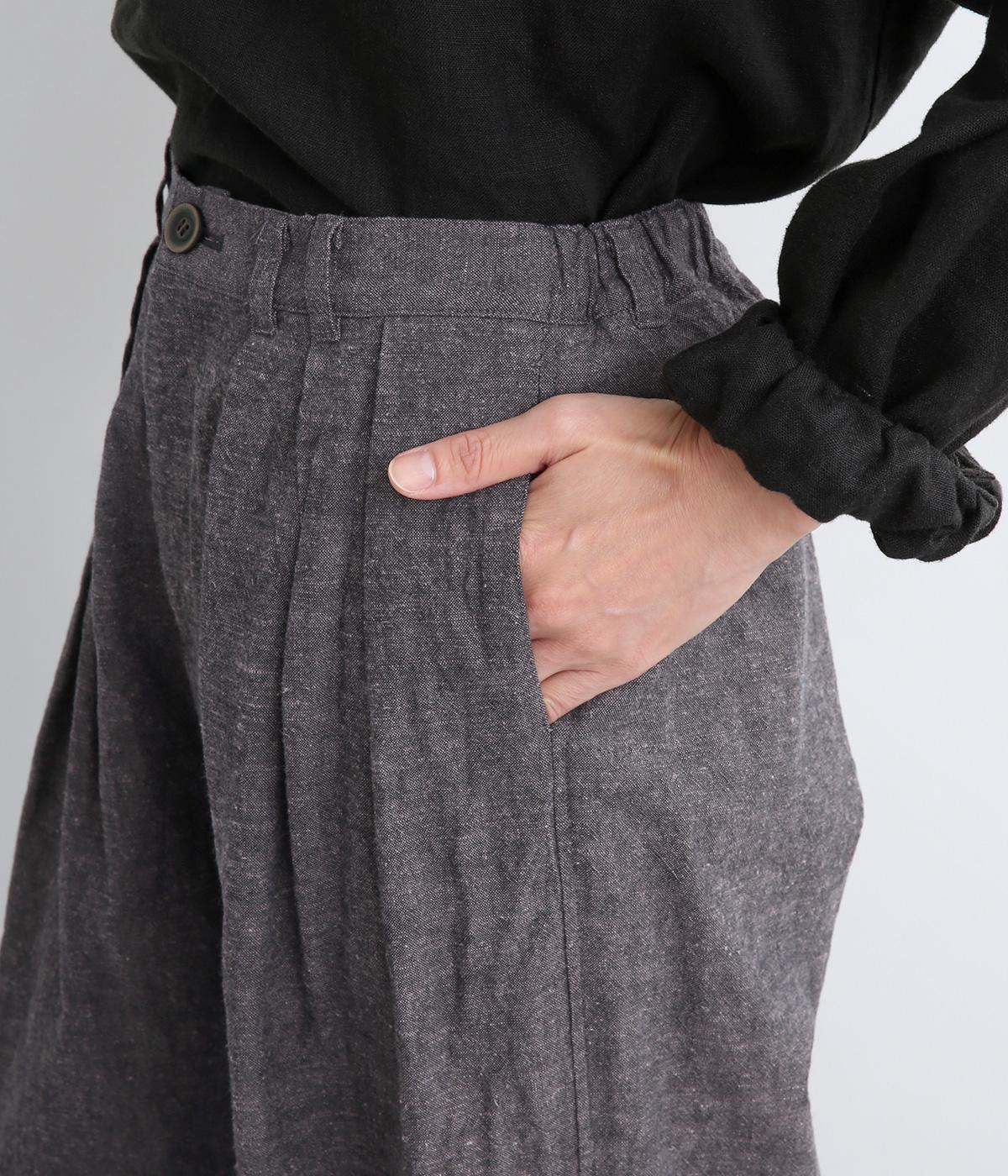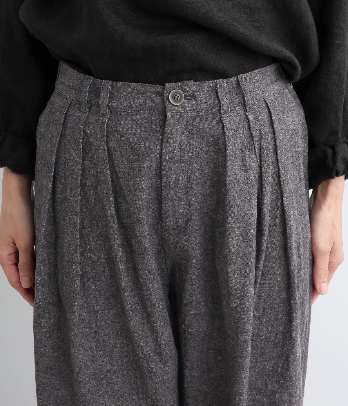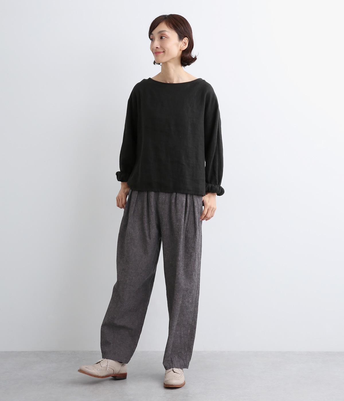 パリッとした生地感がシルエットをきれいに描くタックパンツ。素材感がいいのでラフな着こなしもさまになり、トップスインもおすすめ。前ファスナーで脱ぎはきしやすく、後ろゴム入りでフィット感もグッド。ループつきでベルトマークもたのしめます。