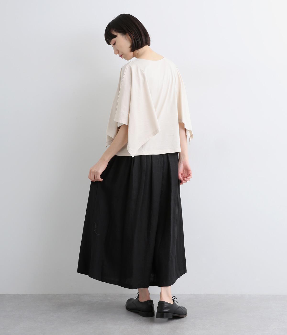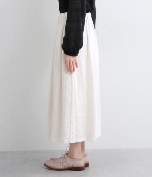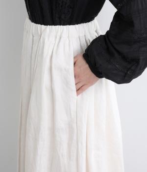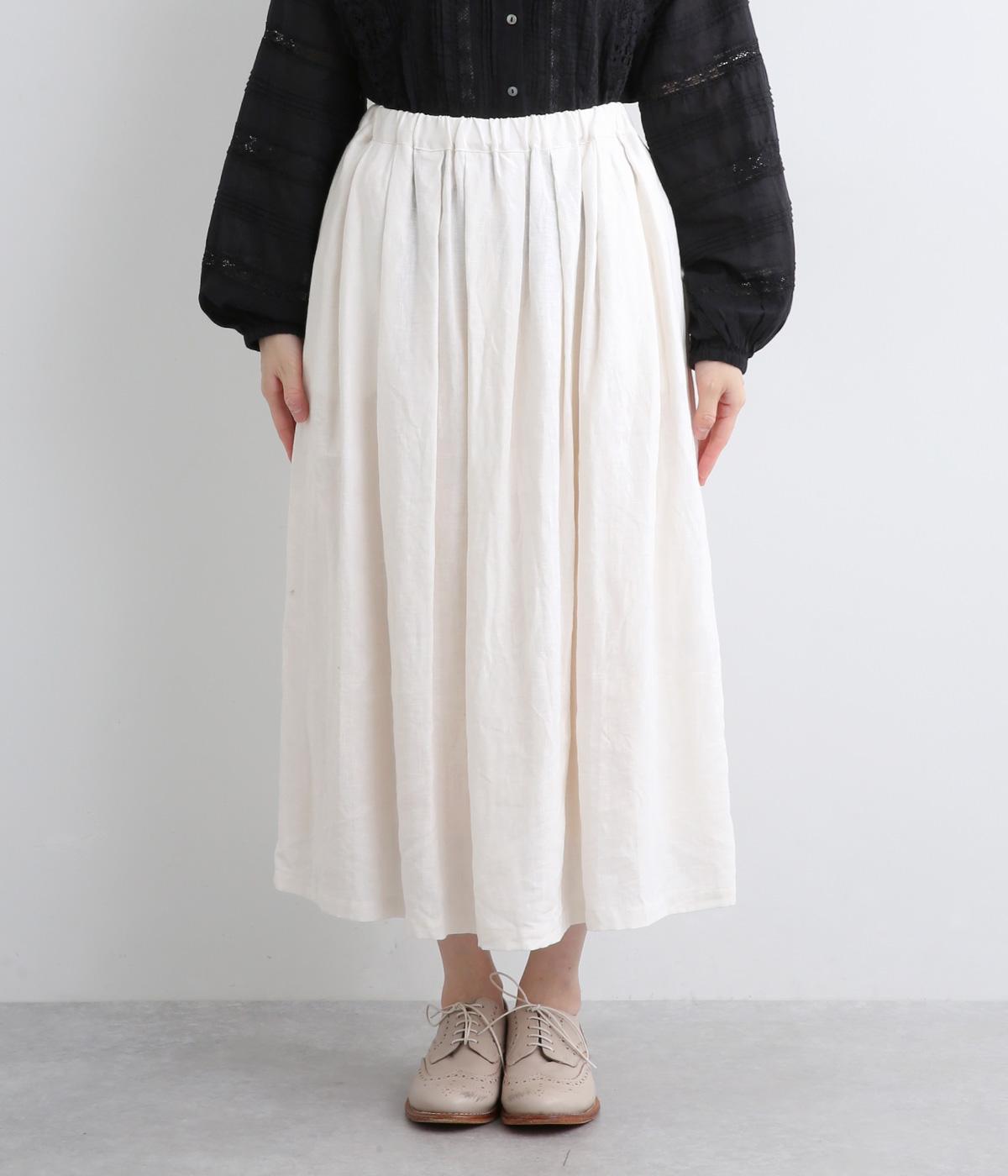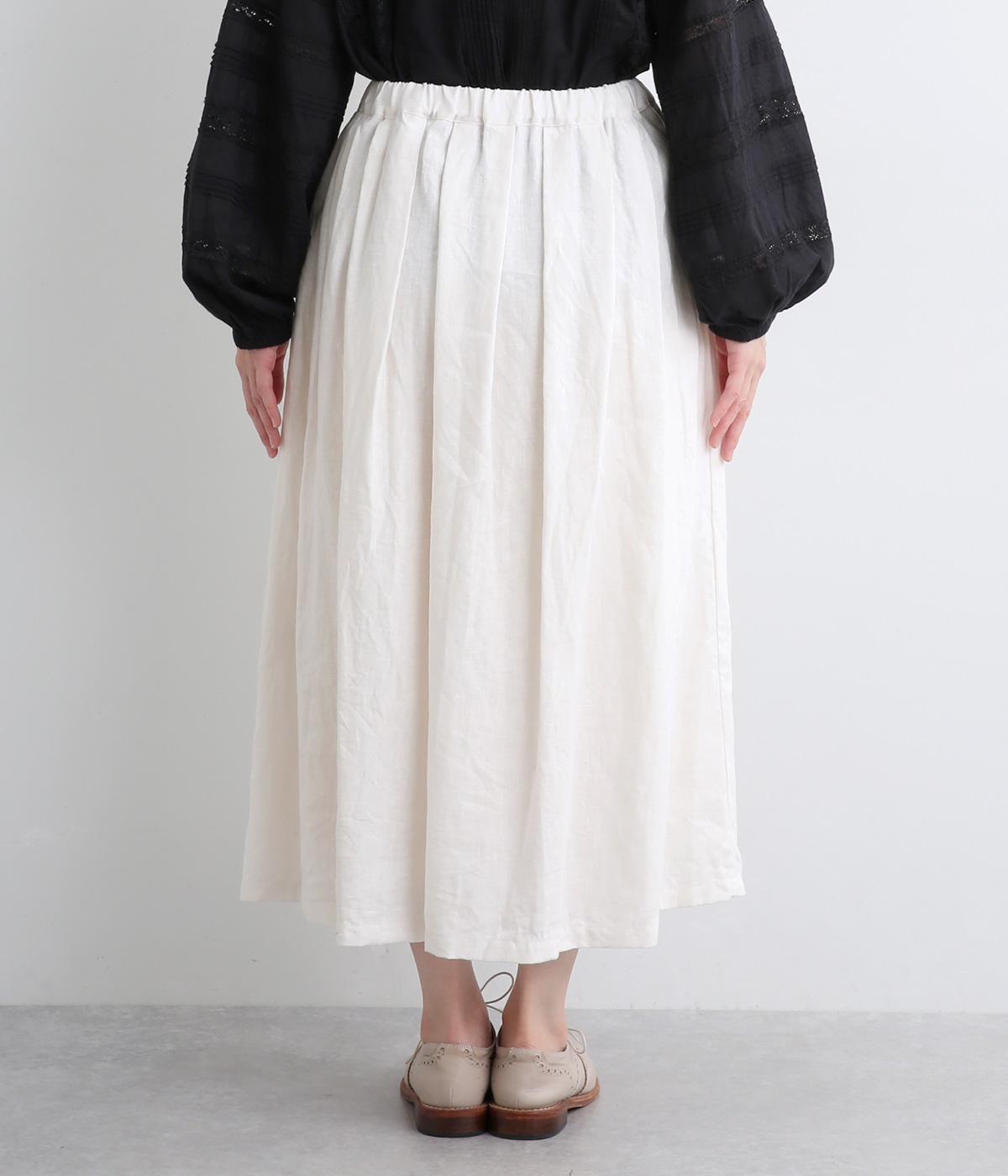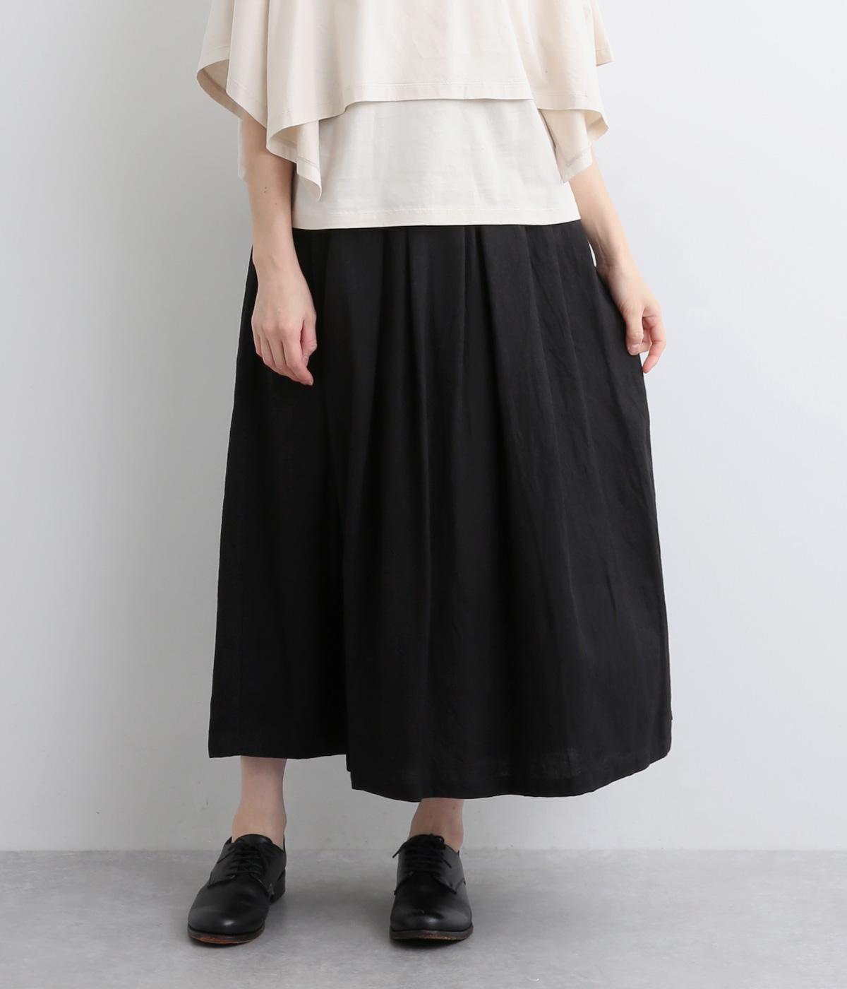 タックを寄せたフレアスカートは自然なドレープ感が品のいい印象に。落ち感もあってすっきりとスタイリングしやすく、ナチュラルな素材感で雰囲気良く着こなせます。シューズ合わせがたのしめる丈感もグッド。ウエストは総ゴム&内紐のイージー仕様です。