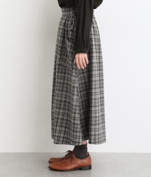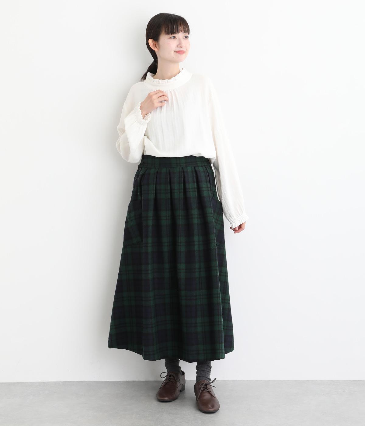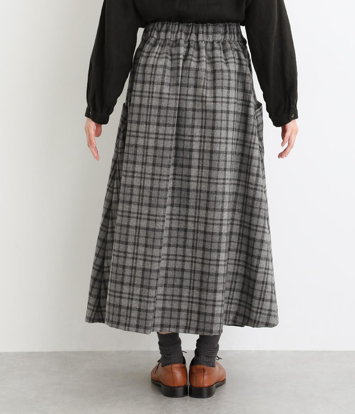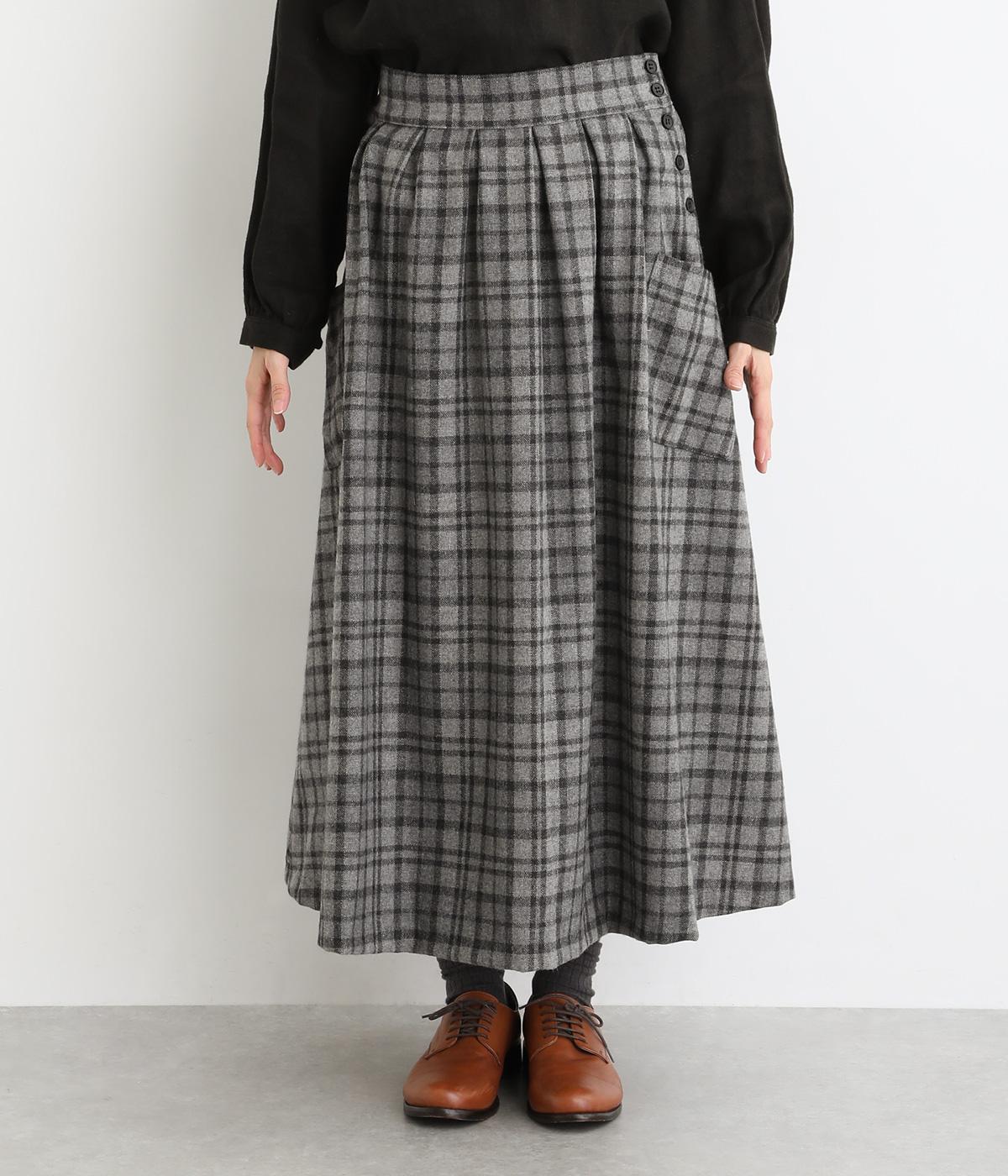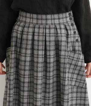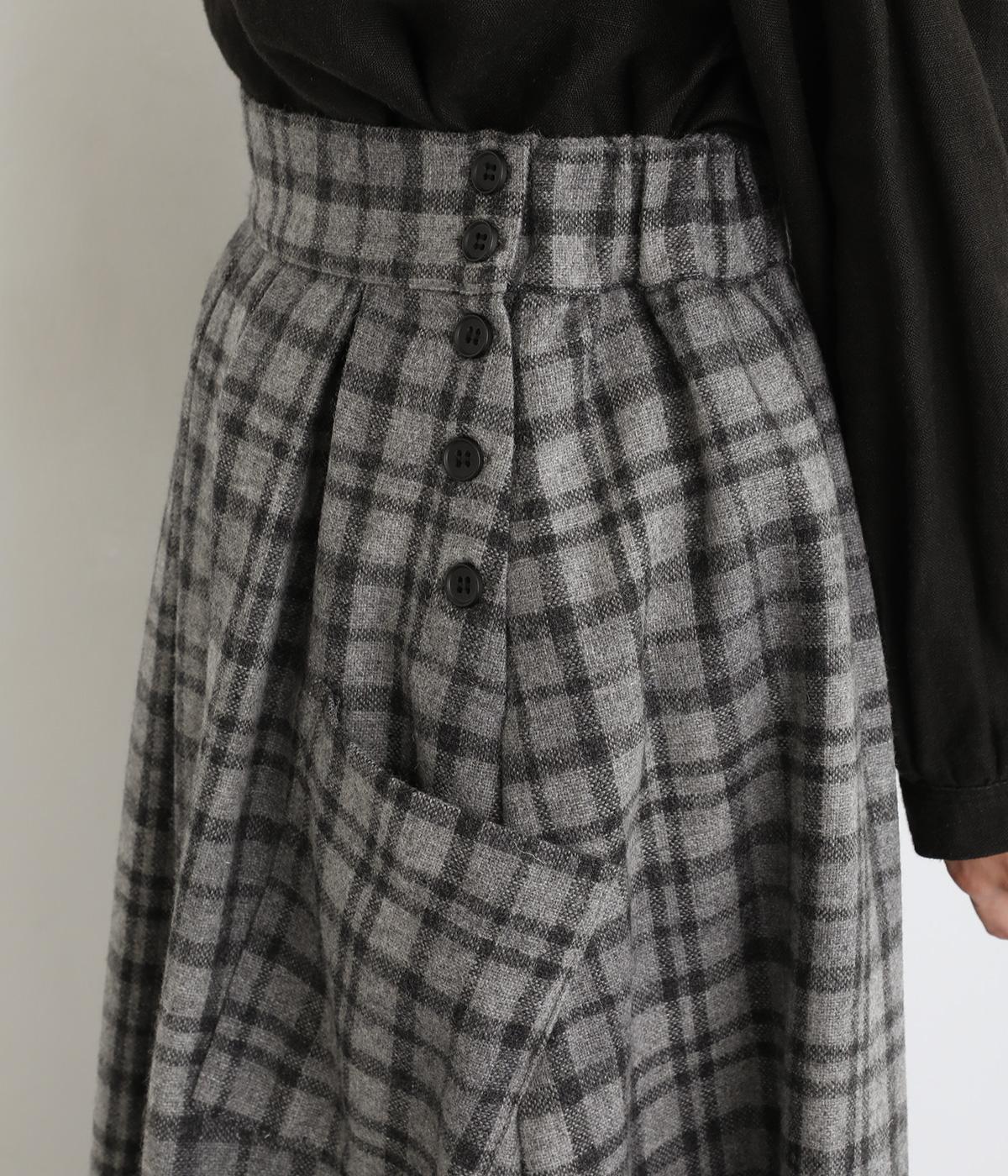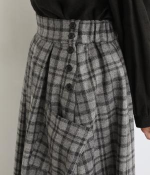 サイドボタン開きがクラシカルな印象のスカート。うしろにはゴムを入れ安心の穿き心地です。上品な広がりでスタイリングに華やかさを添えます。チェックの向きに変化をつけたポケットがさりげないアクセントです。
