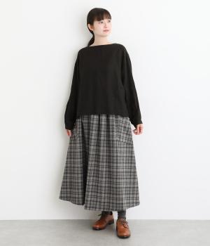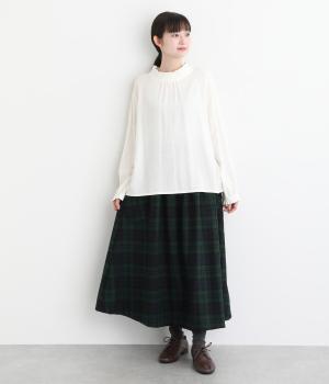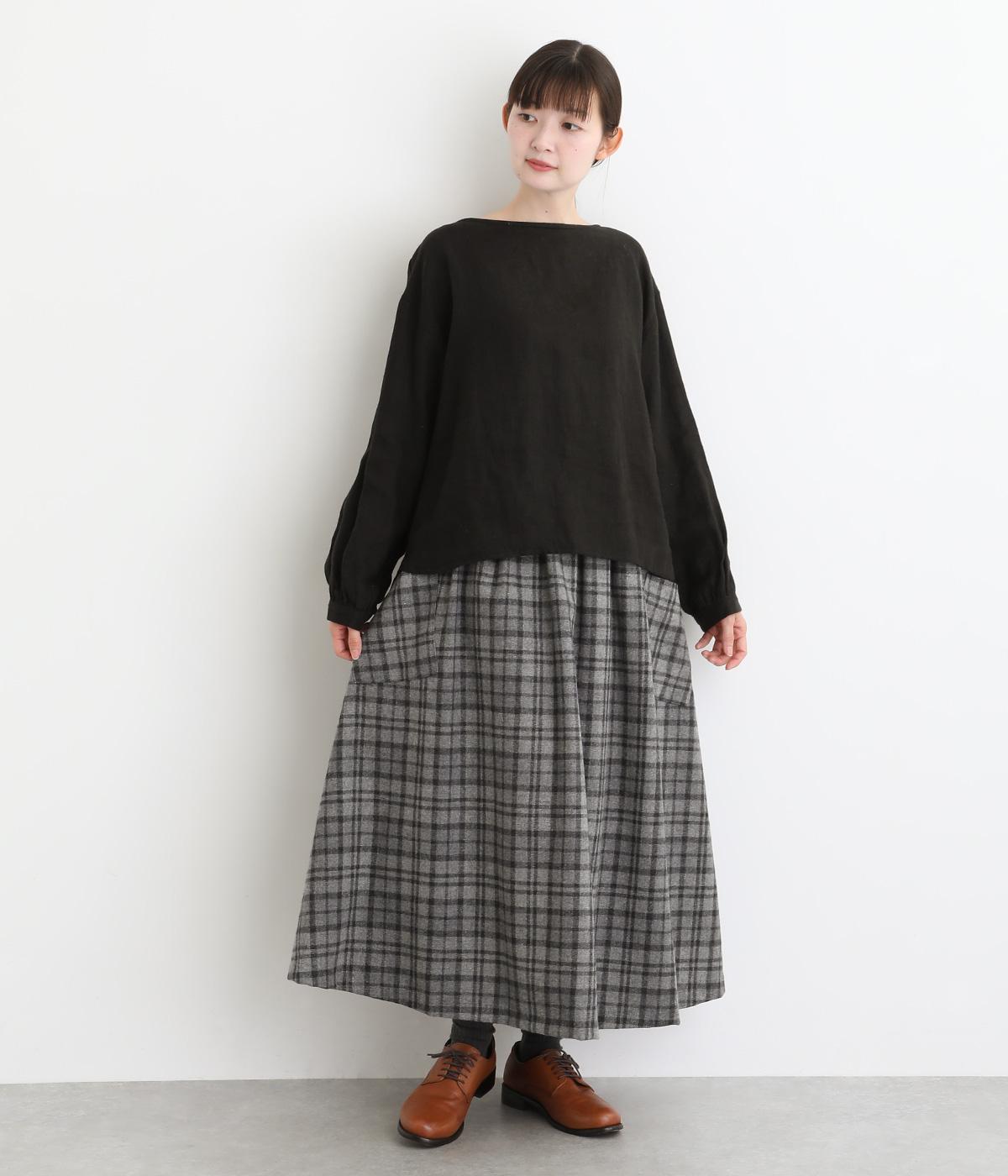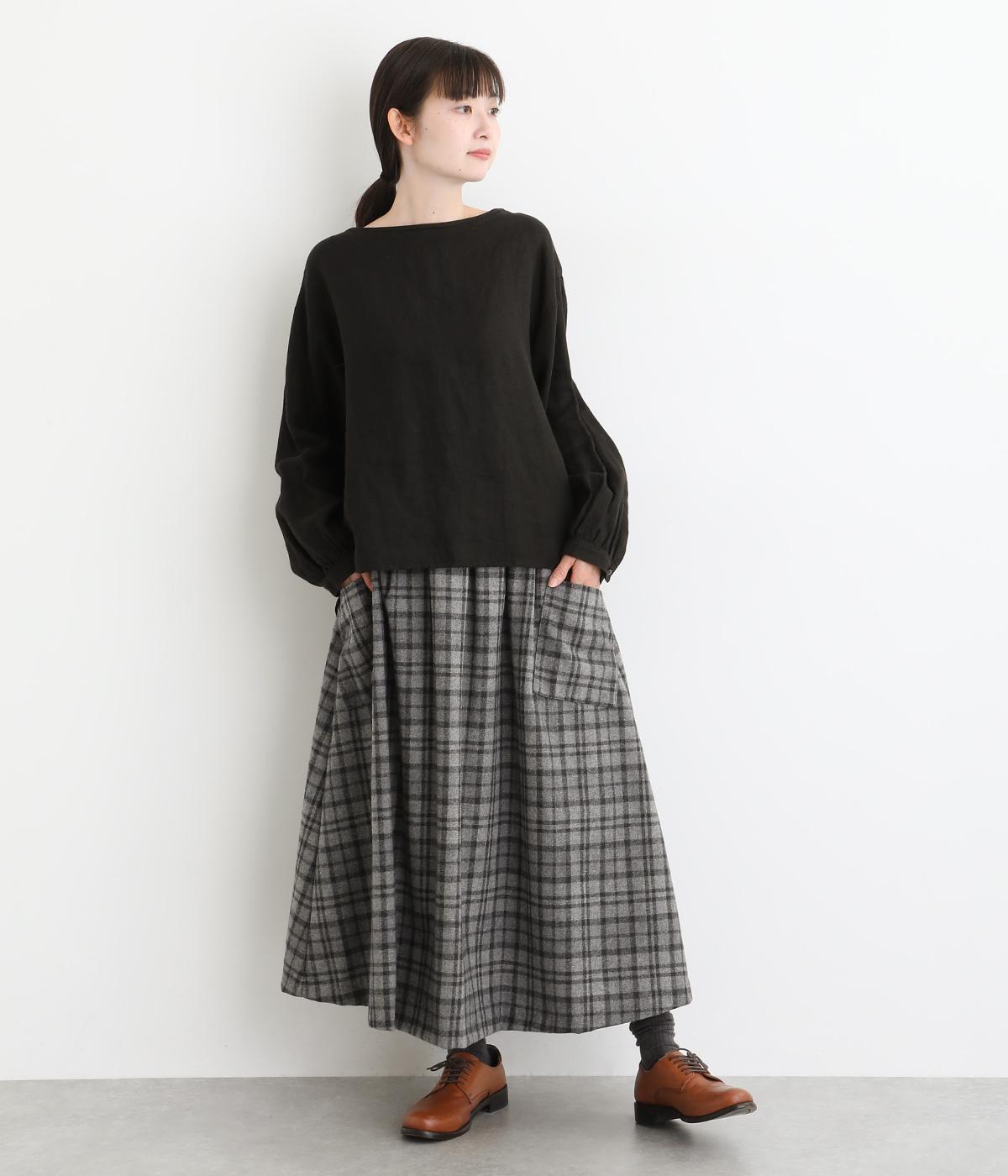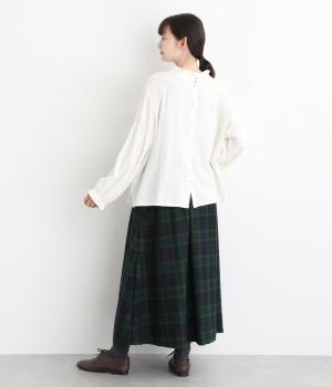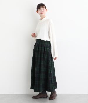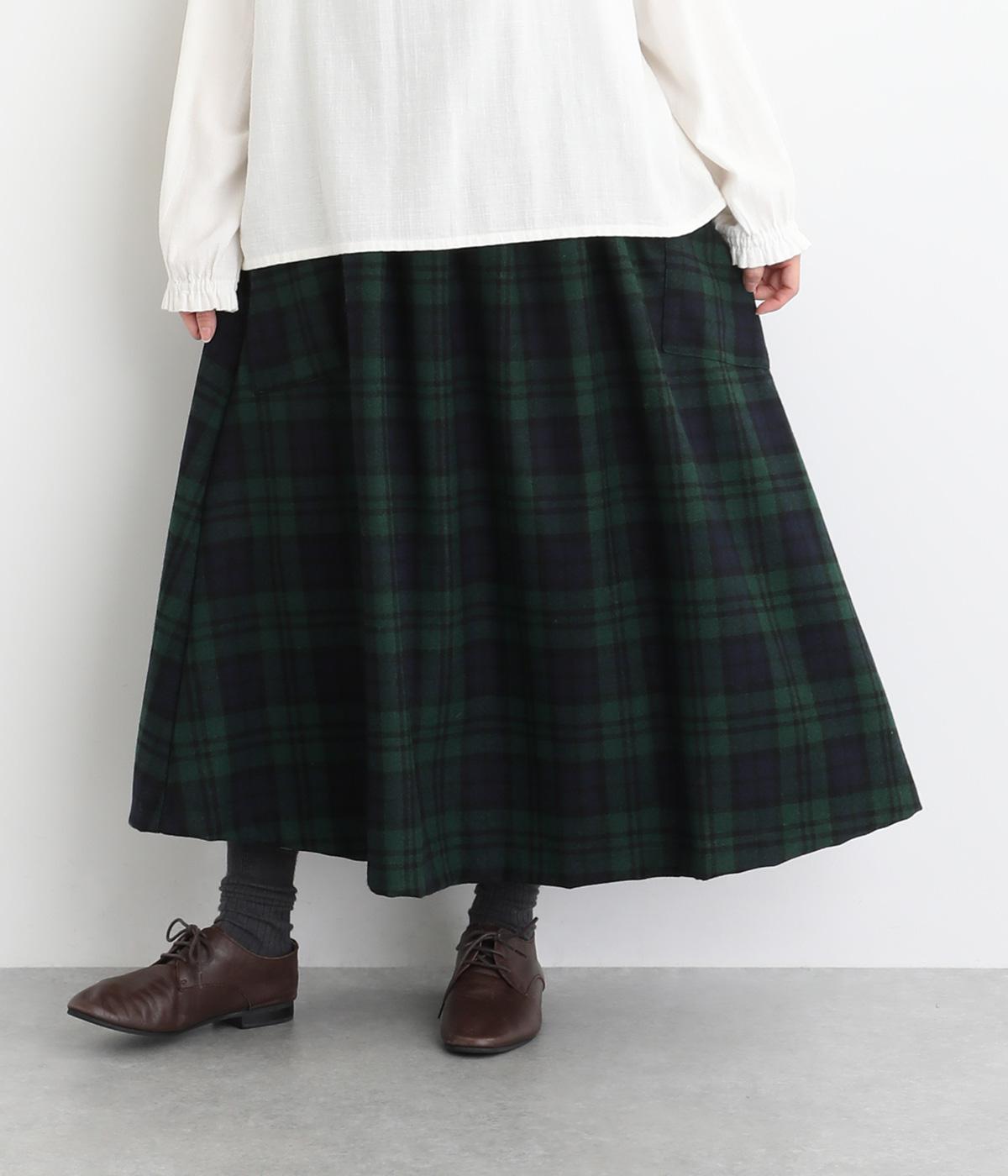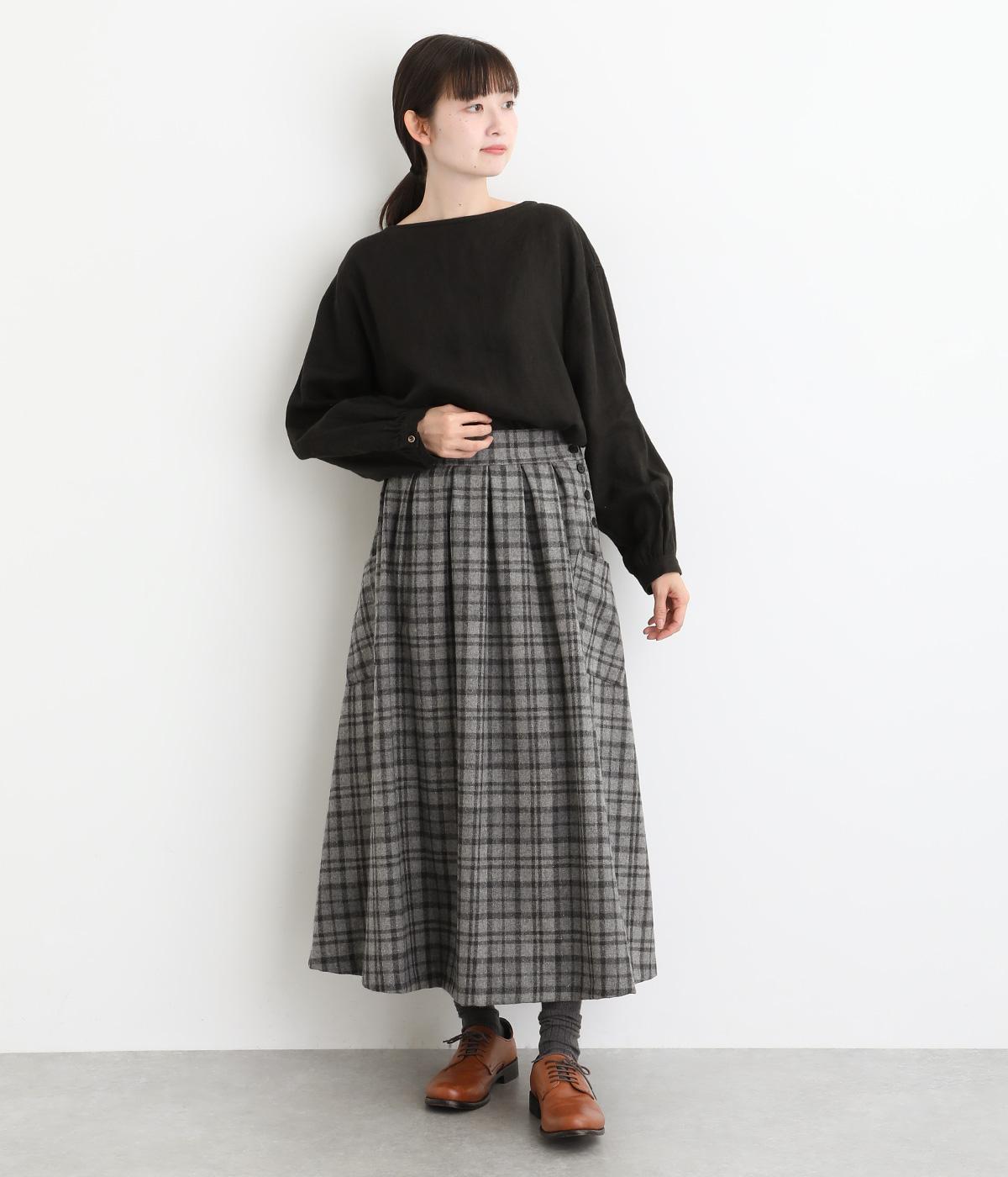 サイドボタン開きがクラシカルな印象のスカート。うしろにはゴムを入れ安心の穿き心地です。上品な広がりでスタイリングに華やかさを添えます。チェックの向きに変化をつけたポケットがさりげないアクセントです。