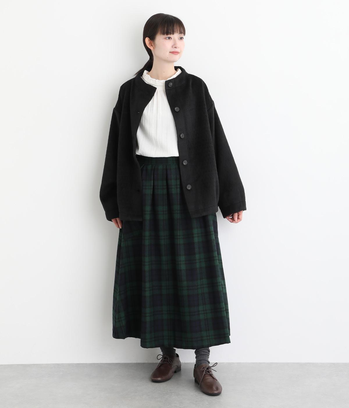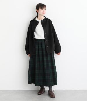 ウールにポリエステルなどをミックスして存在感がありながらも軽やかな生地に仕立てました。あたたかみのある起毛感が秋冬にぴったりの素材感です。