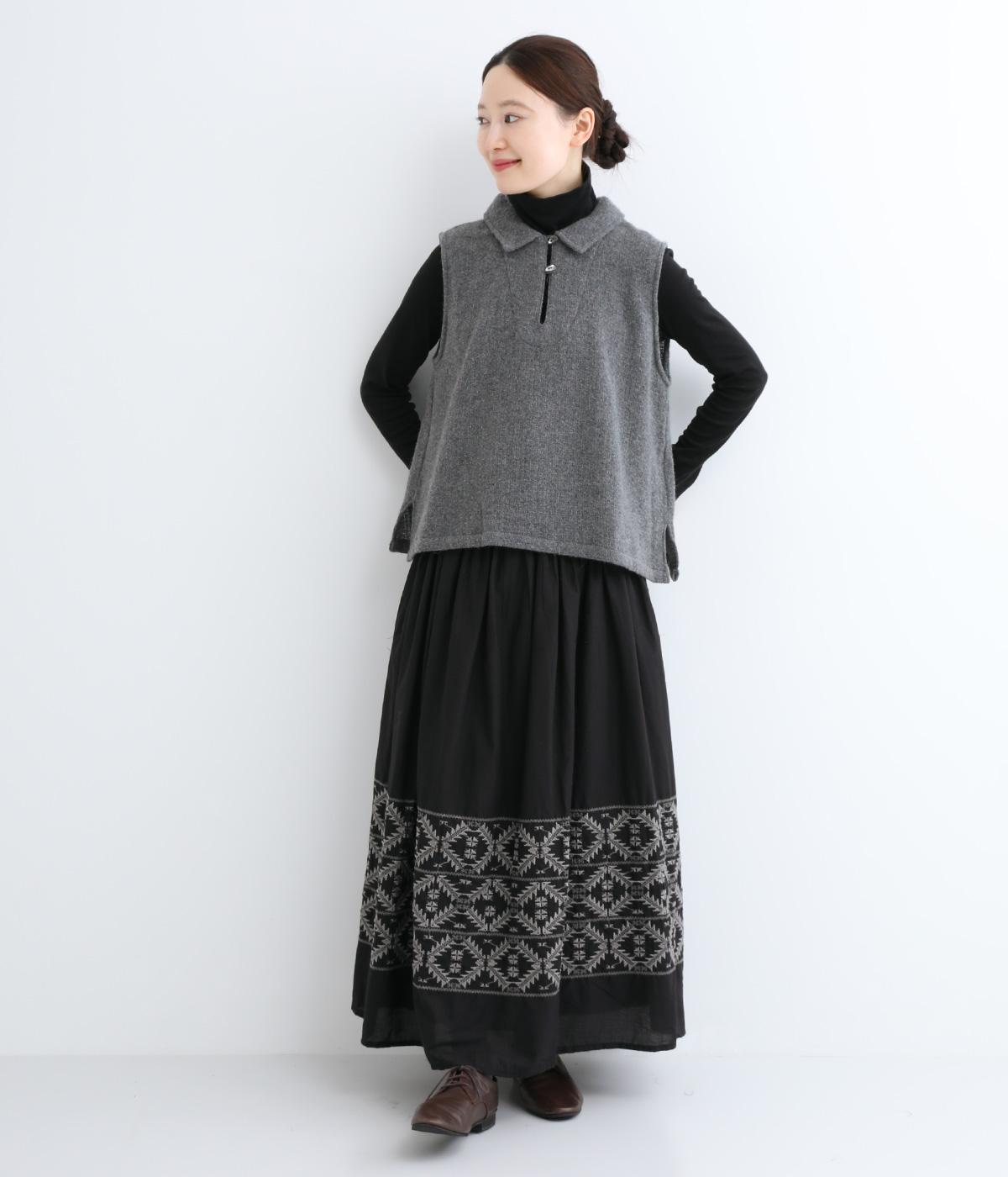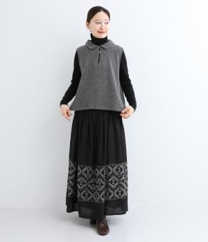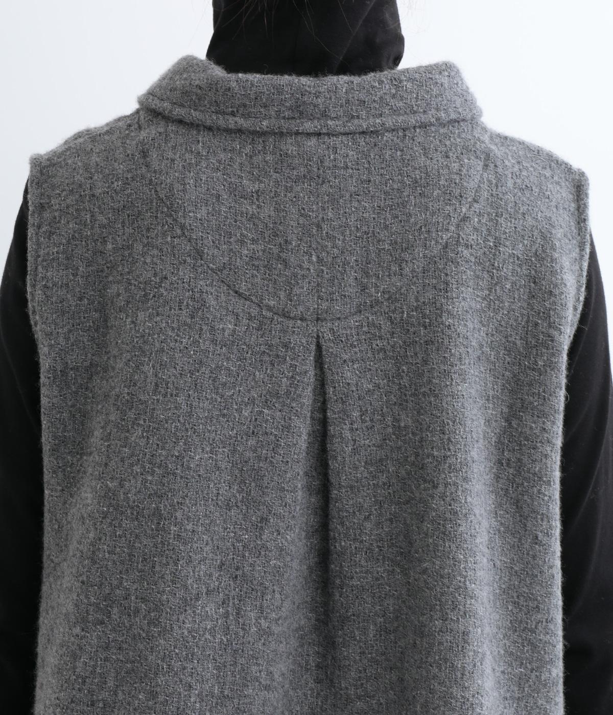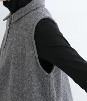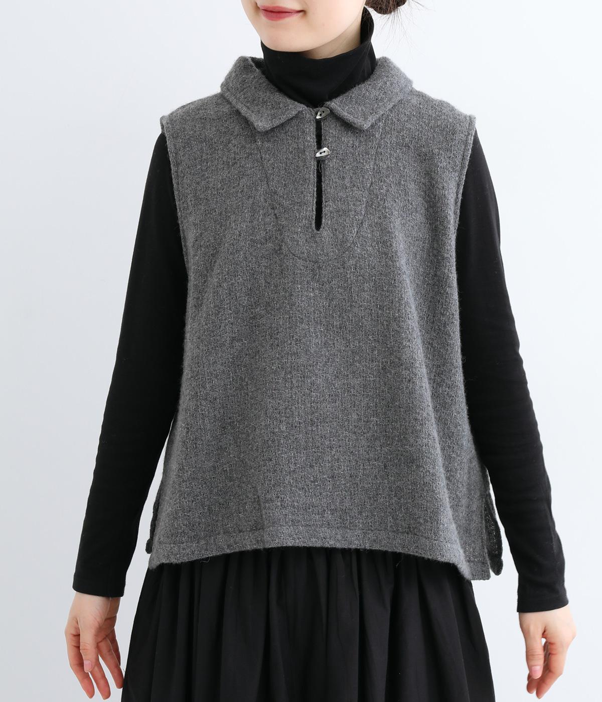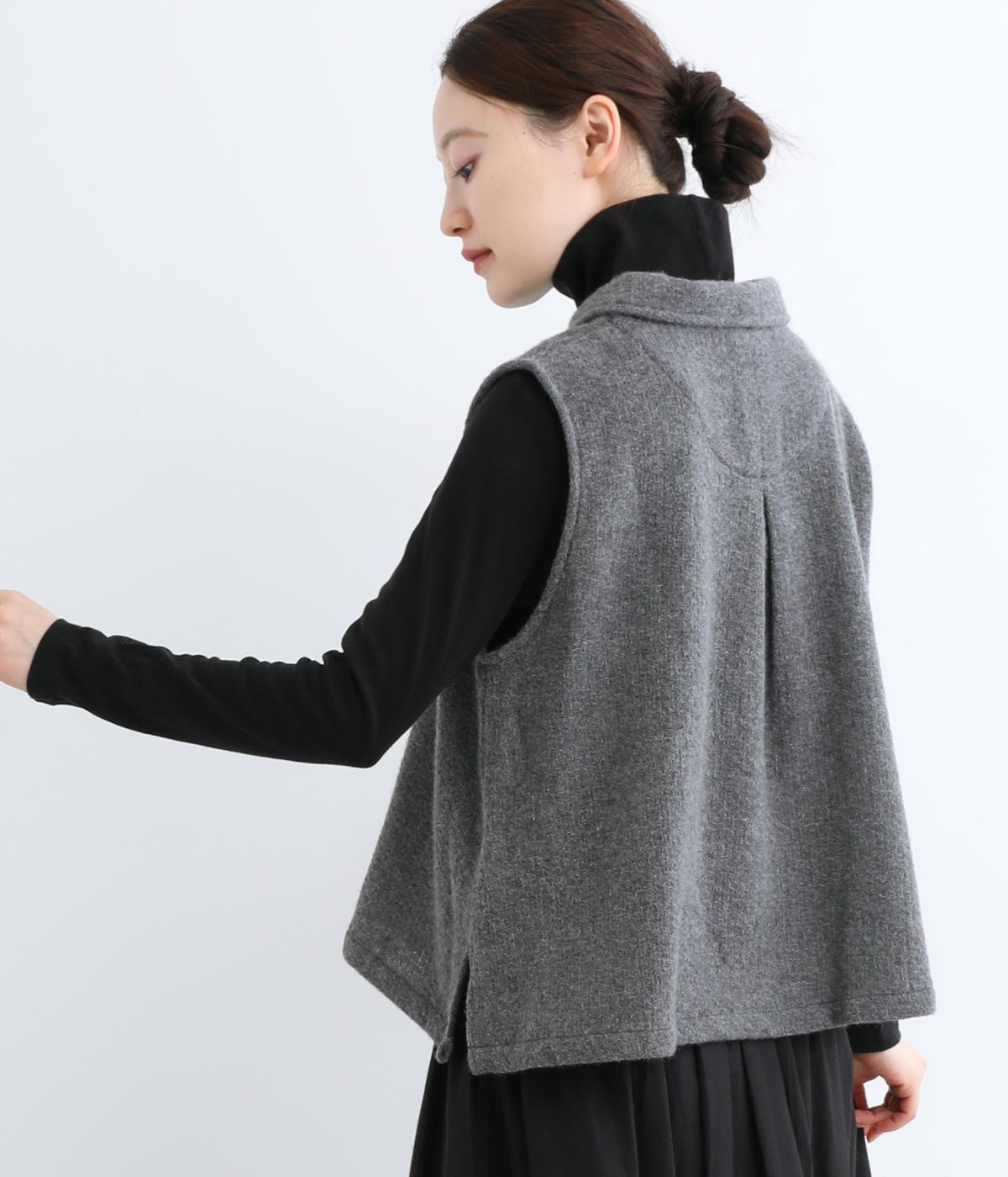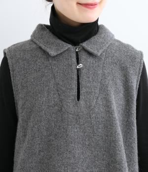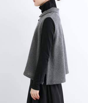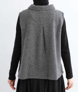 生地の上品な風合いときちんと感のある襟が着こなしにクラス感を与えるベスト。フロントには2つの変形ボタンを配してアクセントにしています。後ろヨーク下にタックを入れて身頃にゆとりをプラス。抜け感のある裾のサイドスリットが横姿を美しく演出します。