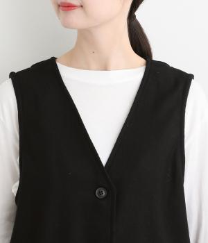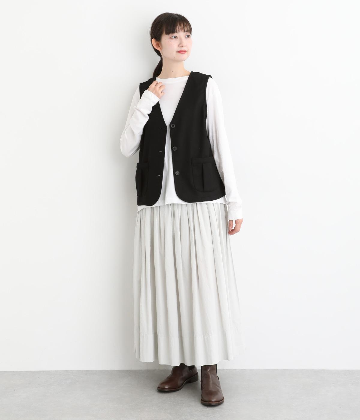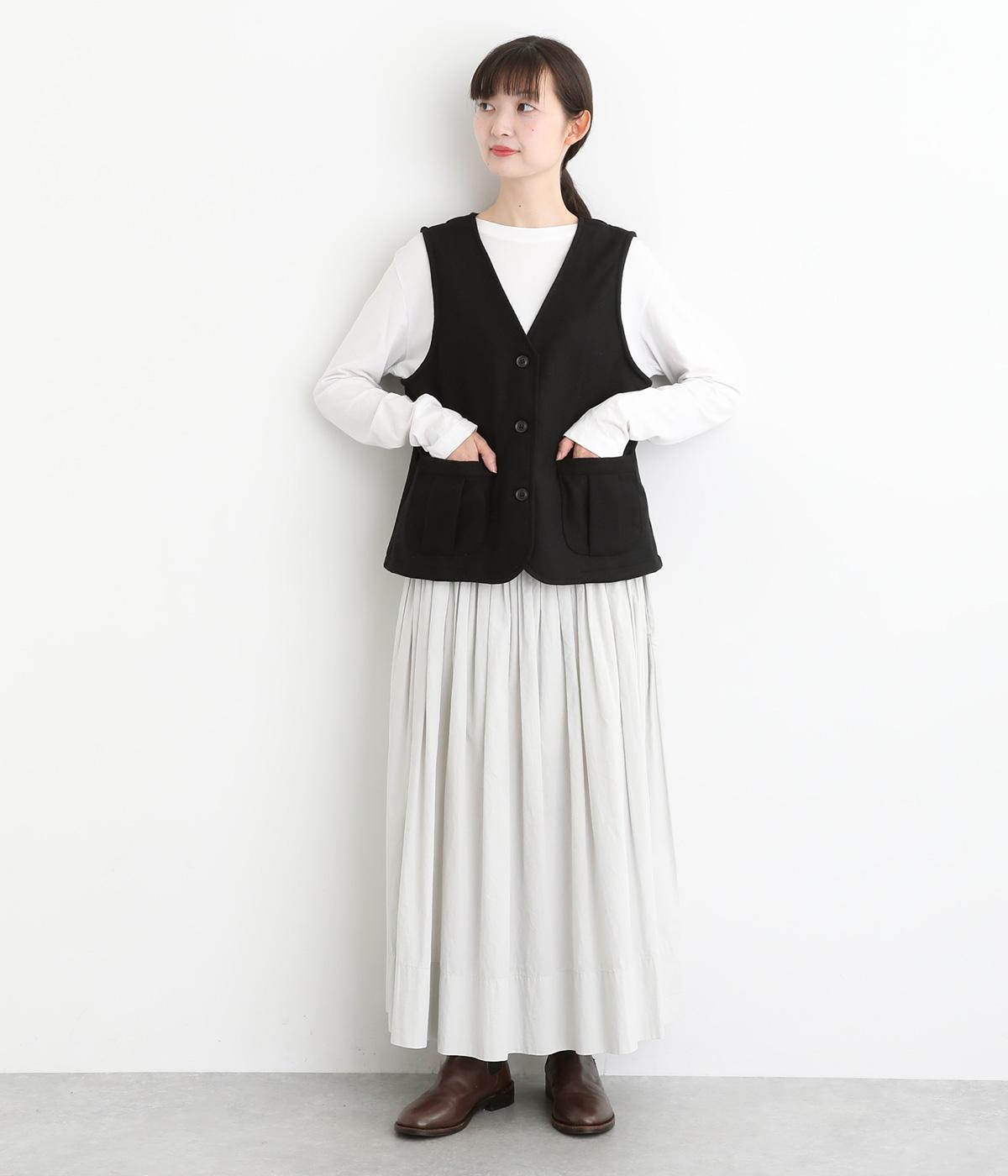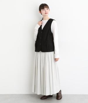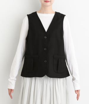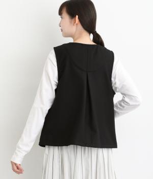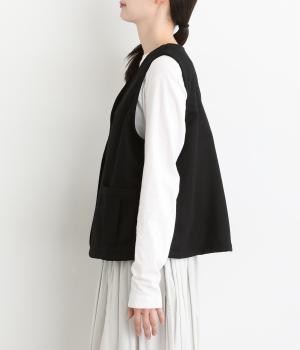 プリーツをほどこしたパッチポケットがデザインポイントのV開きベスト。背中にタックをほどこしてシルエットにゆとりを持たせました。マニッシュにもフェミニンにもなじむ着まわし力の高いアイテムです。