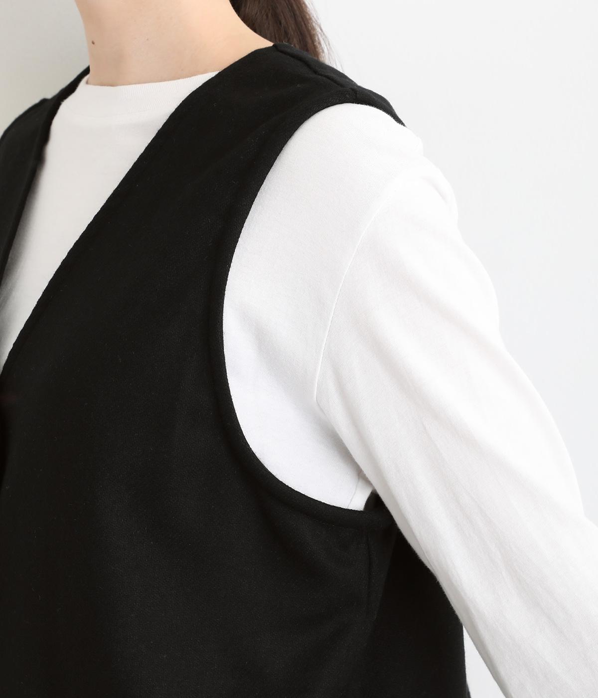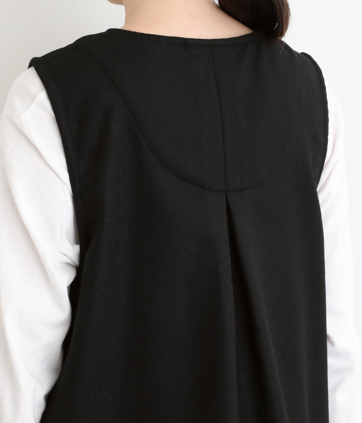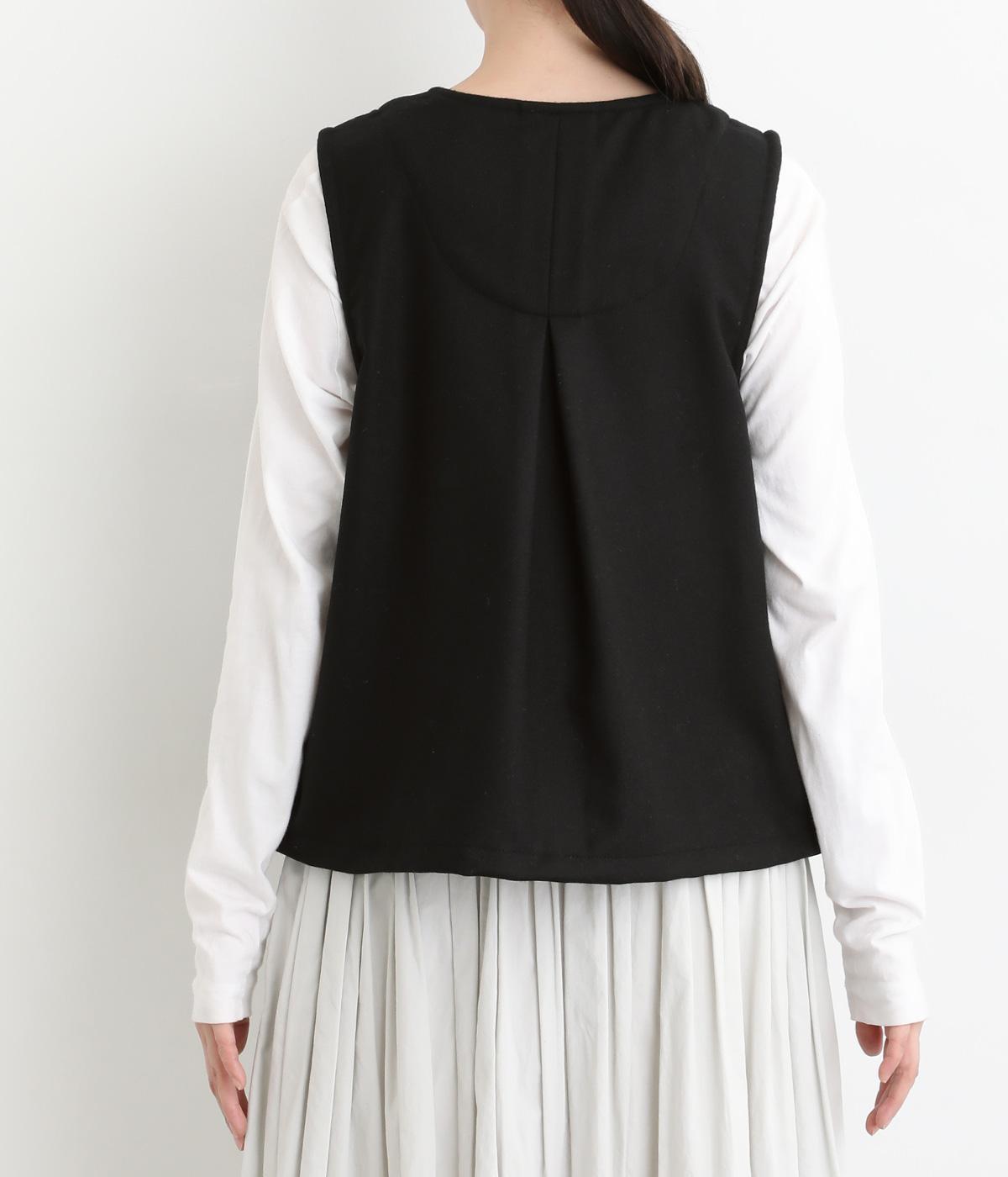 プリーツをほどこしたパッチポケットがデザインポイントのV開きベスト。背中にタックをほどこしてシルエットにゆとりを持たせました。マニッシュにもフェミニンにもなじむ着まわし力の高いアイテムです。