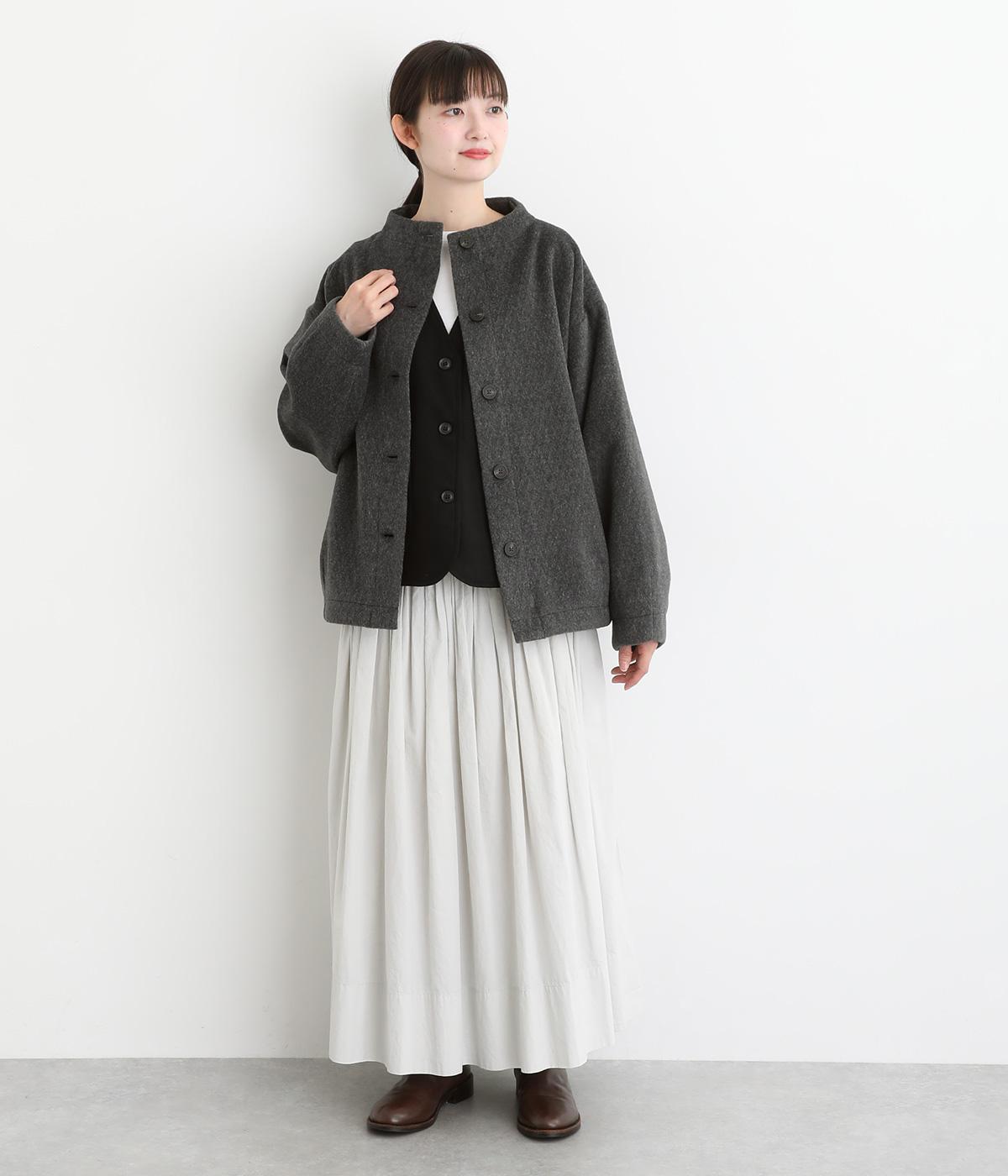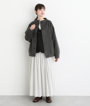 ドライな質感できちんと見えするミックス素材の生地を使用しました。品のあるハリがシルエットをきれいに保ちます。やわらかな着心地でインナーと重ねやすく仕立てました。