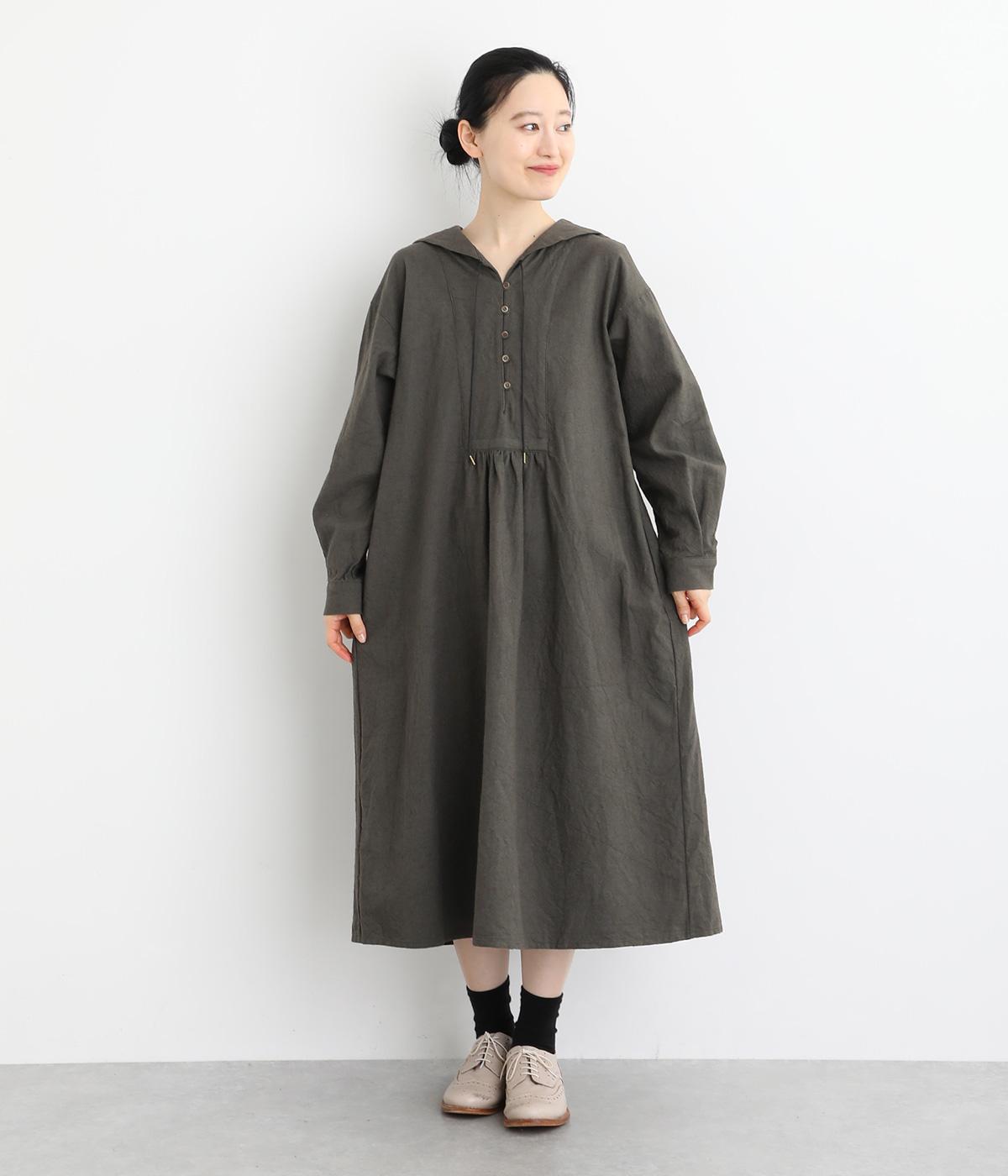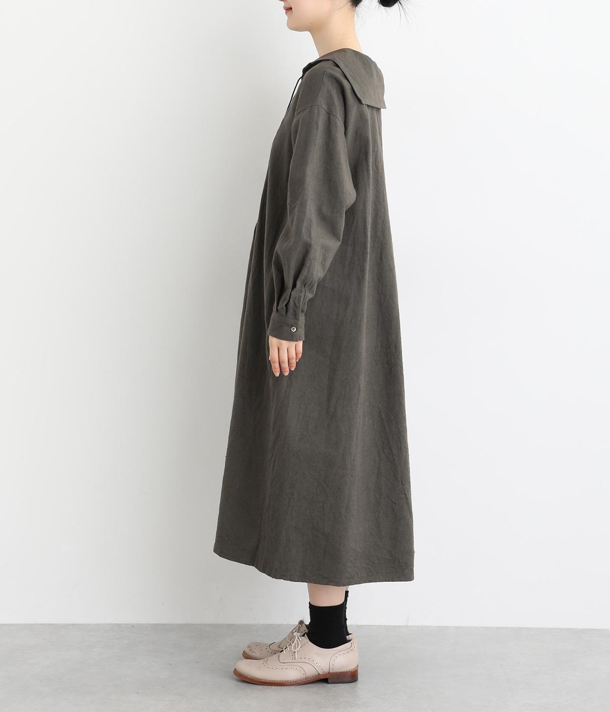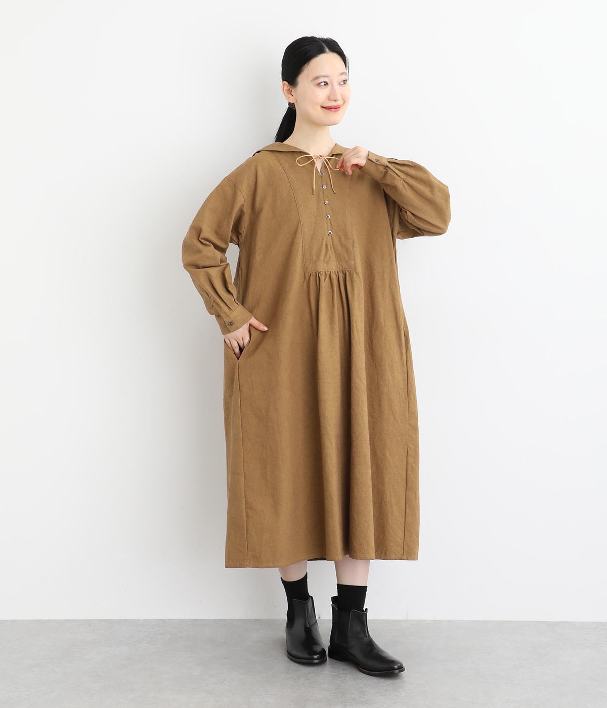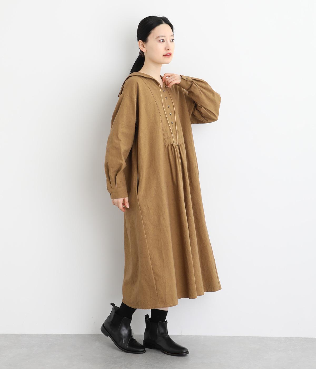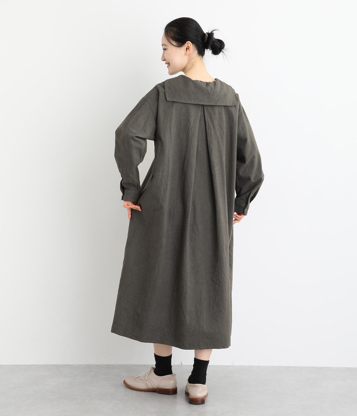 ぬくもりを感じさせ、洗いざらしのような自然なシワやハリのある見た目がハイセンスな印象を与えるタックワンピース。愛らしくてクラシックなセーラー襟がアクセントになっています。ソックスやシューズのテイストを変えることで、コーディネートの幅が広がります。