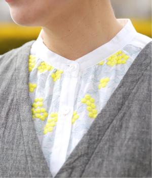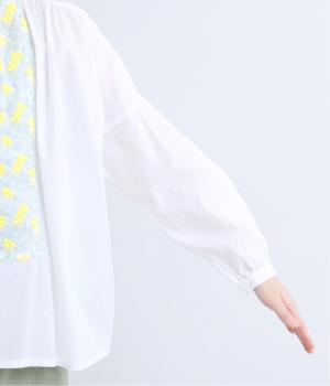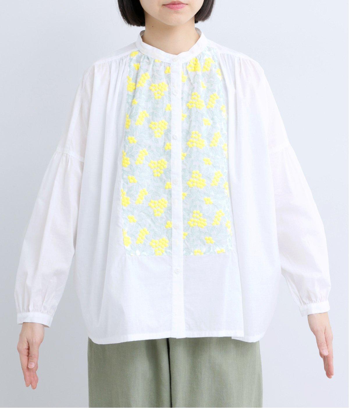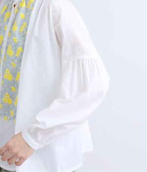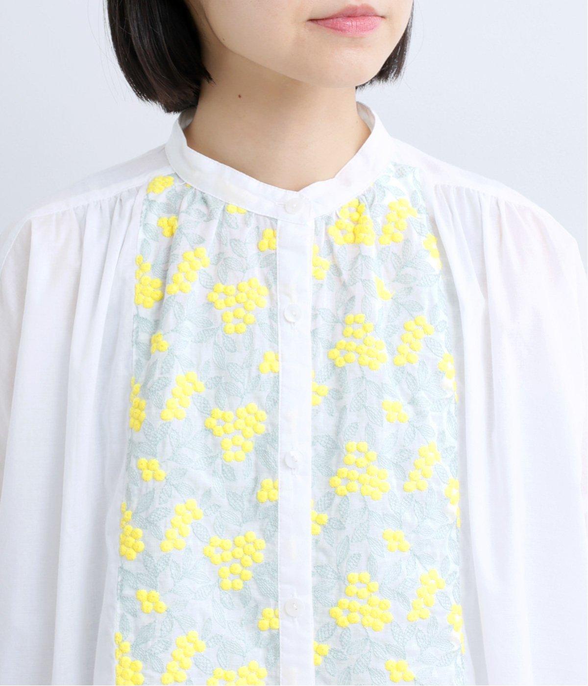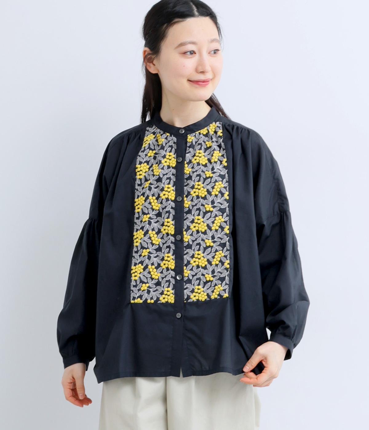 ぷっくりと立体感のあるミモザ刺しゅうが目を引くブラウスです。かわいらしさもありつつ、配色で甘さをおさえ、大人の雰囲気に仕上げました。身頃と袖にほどこしたギャザーが、ふんわりとした立体的なシルエットを演出。シンプルなボトムスと合わせるだけで、華やかさのあるコーディネートが完成します。