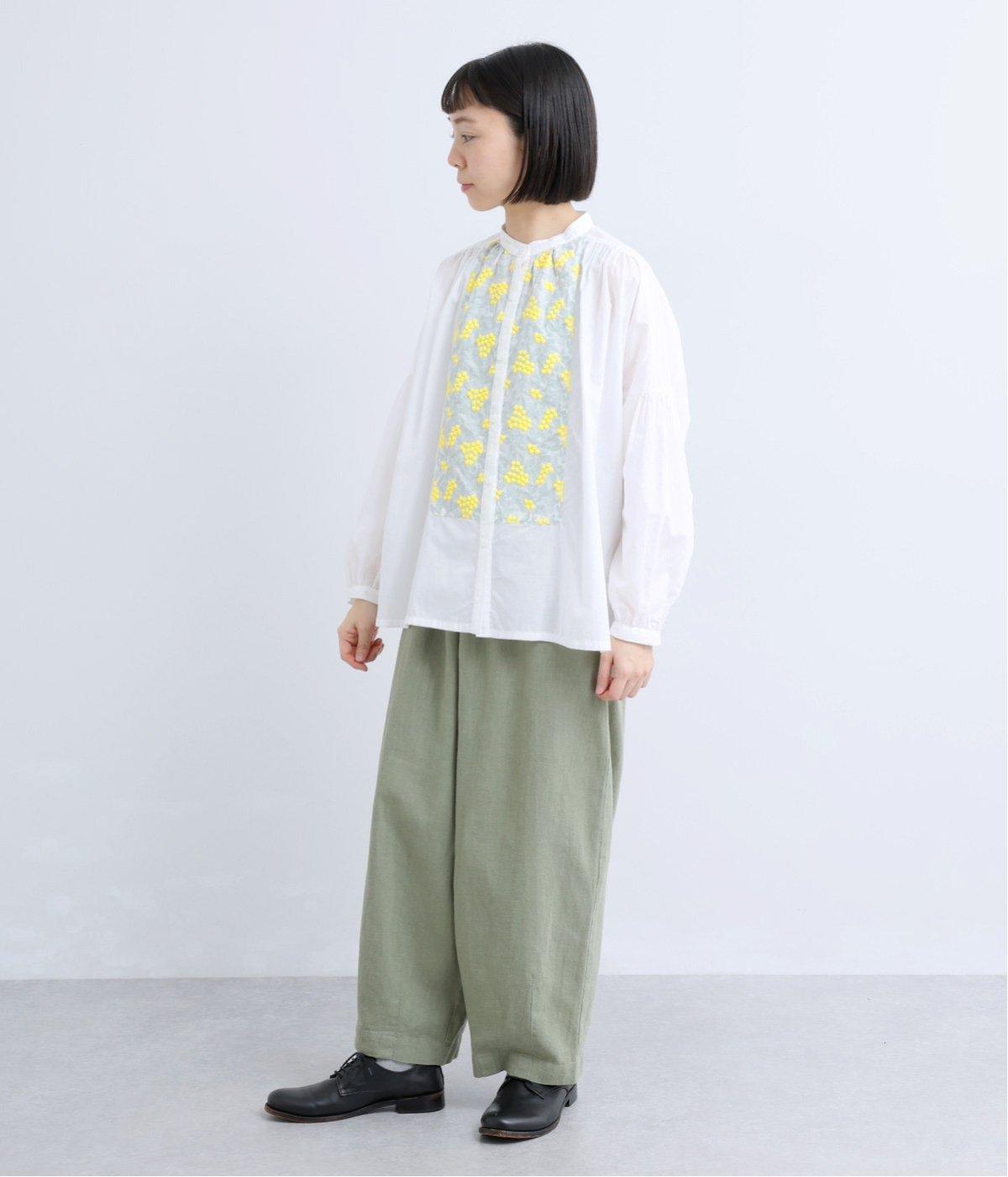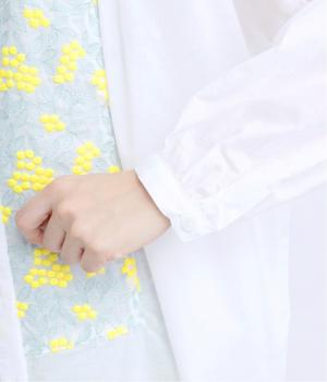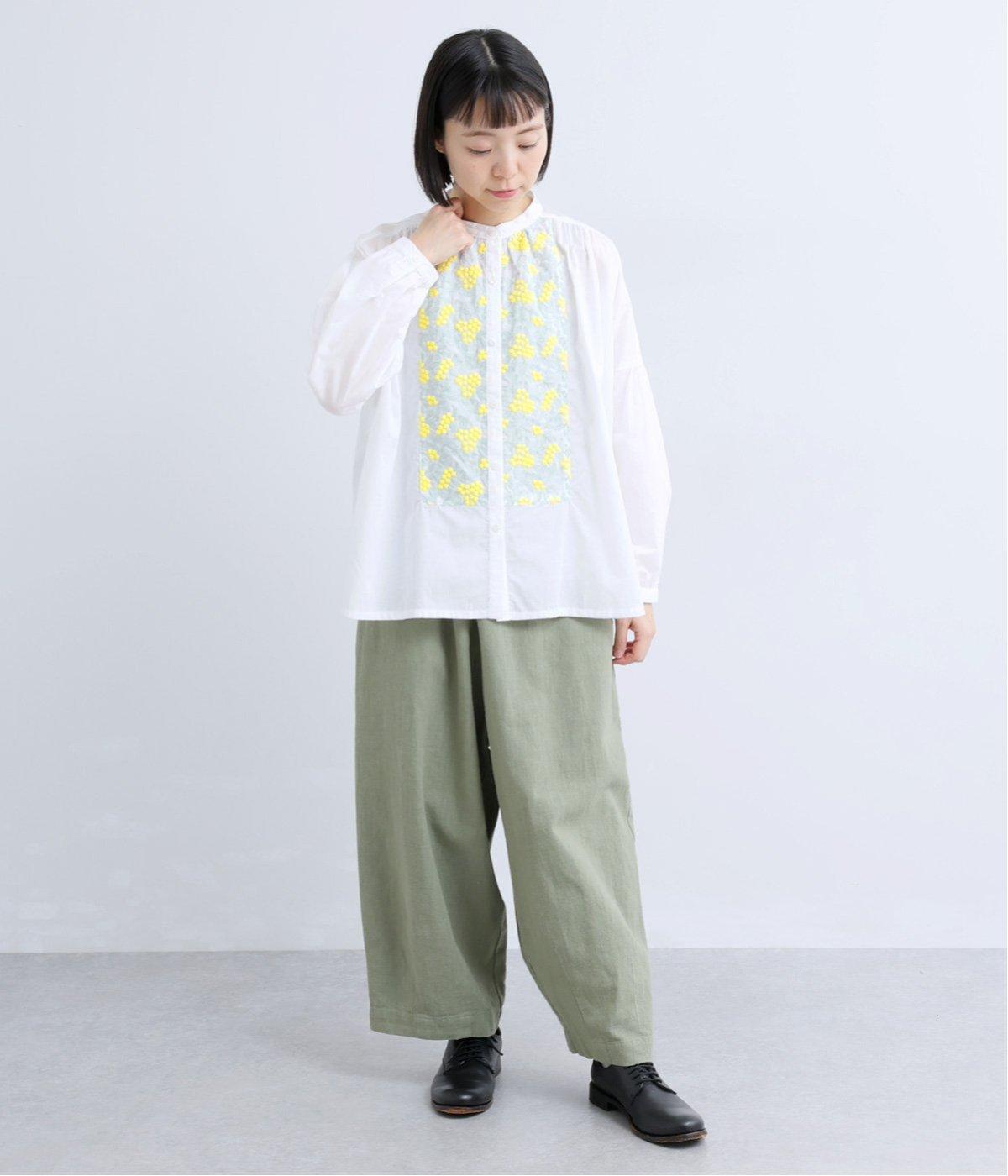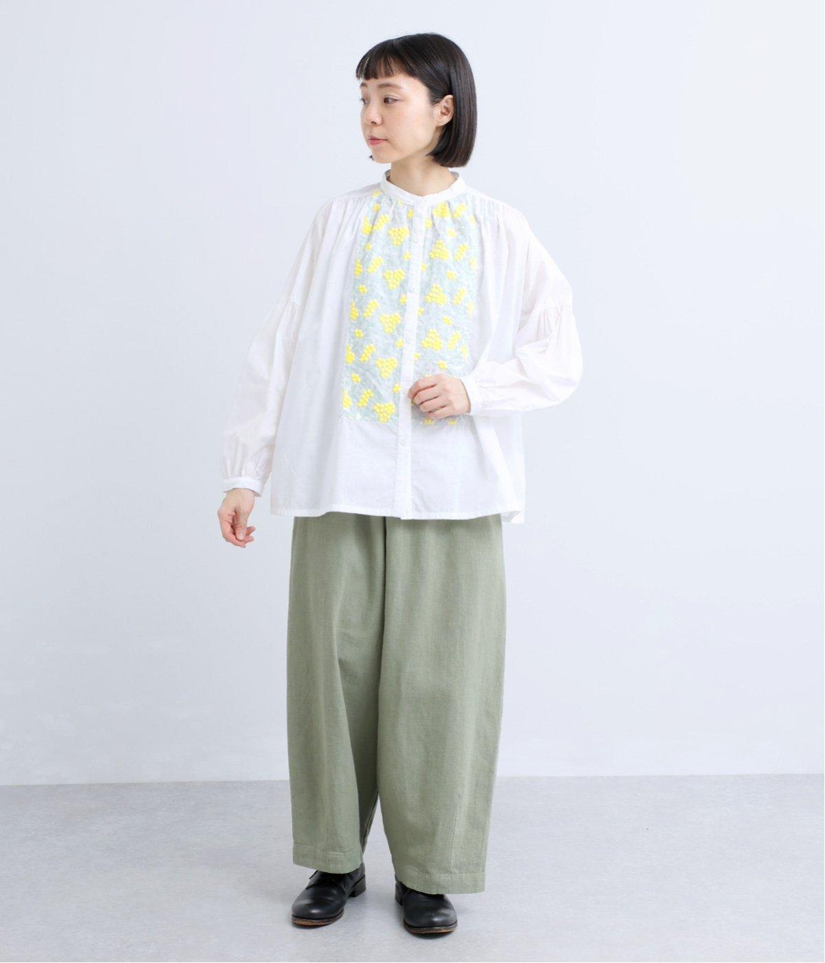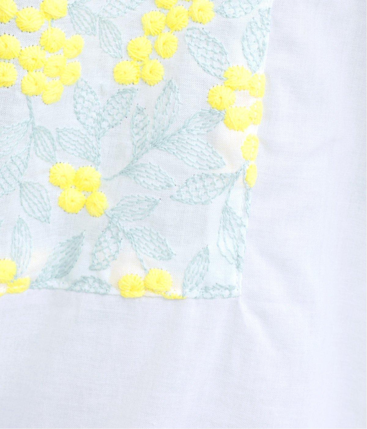 ぷっくりと立体感のあるミモザ刺しゅうが目を引くブラウスです。かわいらしさもありつつ、配色で甘さをおさえ、大人の雰囲気に仕上げました。身頃と袖にほどこしたギャザーが、ふんわりとした立体的なシルエットを演出。シンプルなボトムスと合わせるだけで、華やかさのあるコーディネートが完成します。