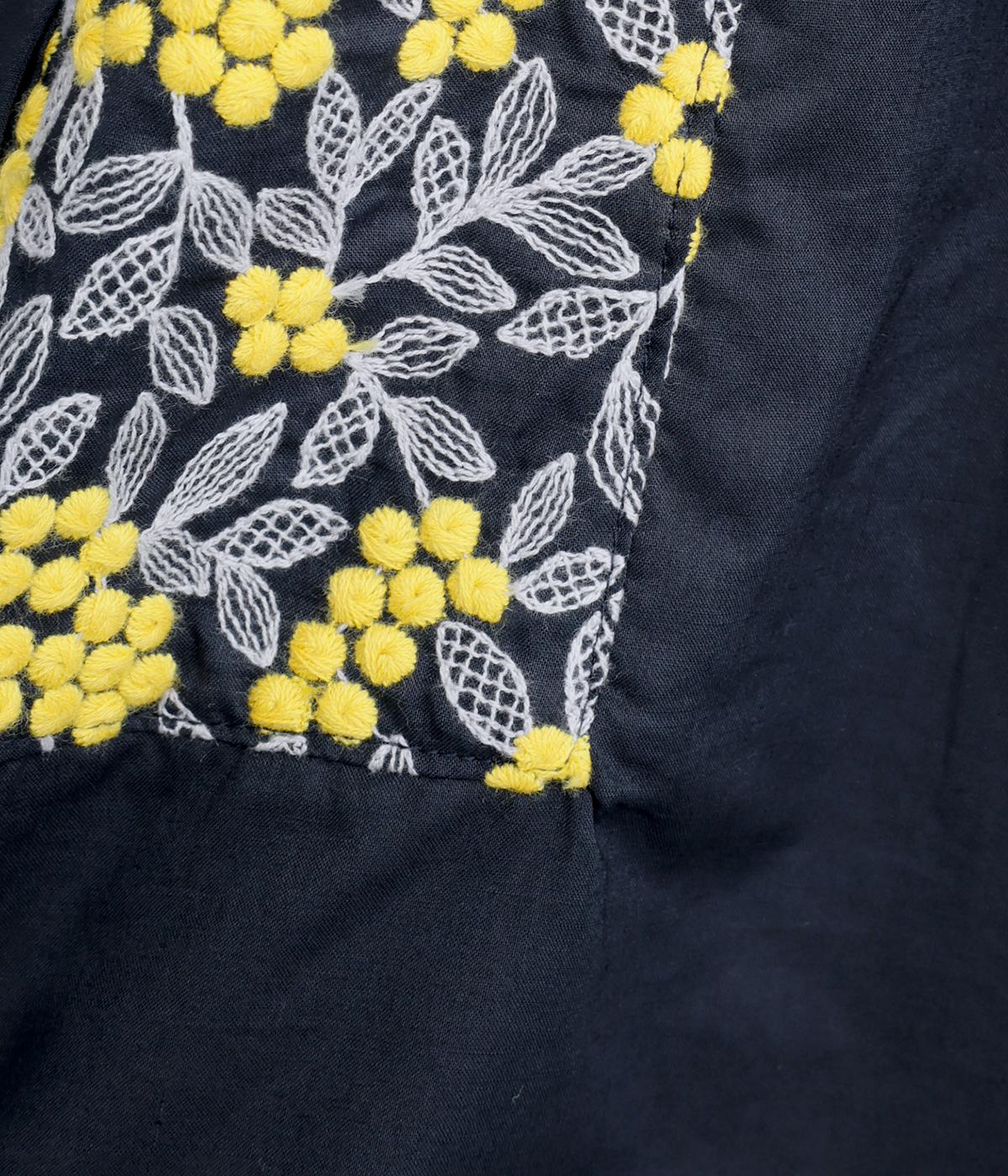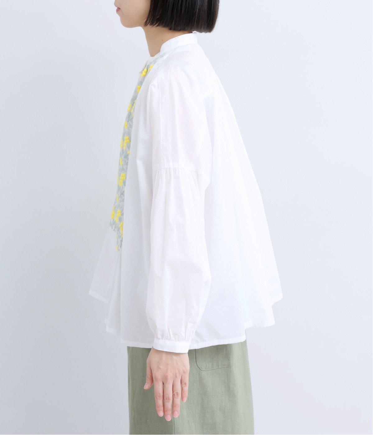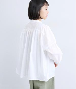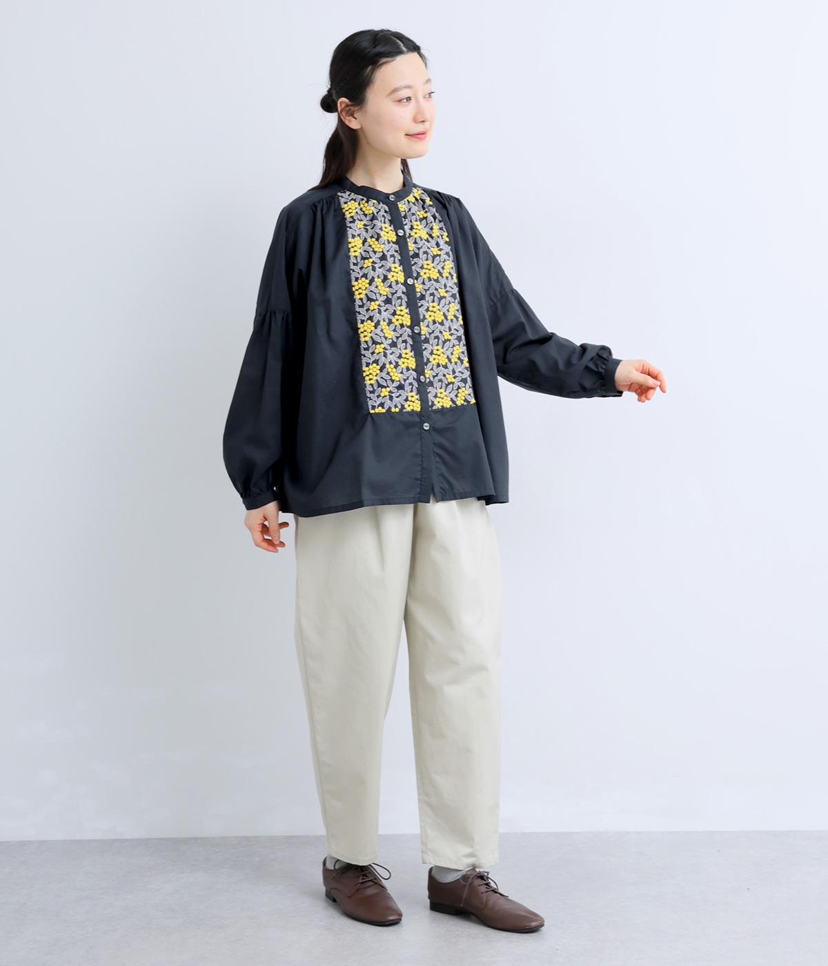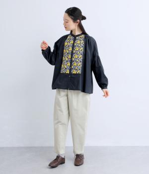 ぷっくりと立体感のあるミモザ刺しゅうが目を引くブラウスです。かわいらしさもありつつ、配色で甘さをおさえ、大人の雰囲気に仕上げました。身頃と袖にほどこしたギャザーが、ふんわりとした立体的なシルエットを演出。シンプルなボトムスと合わせるだけで、華やかさのあるコーディネートが完成します。