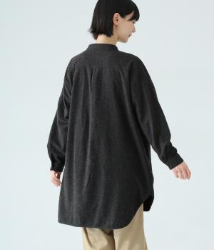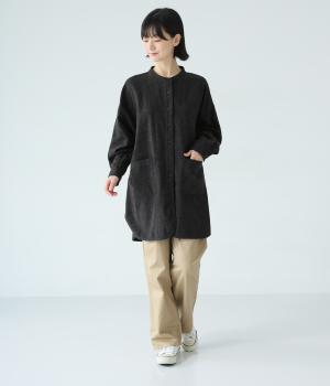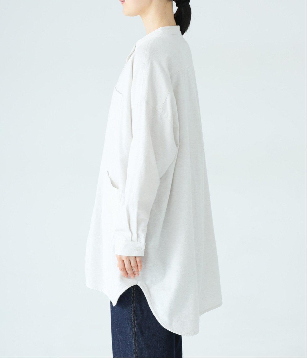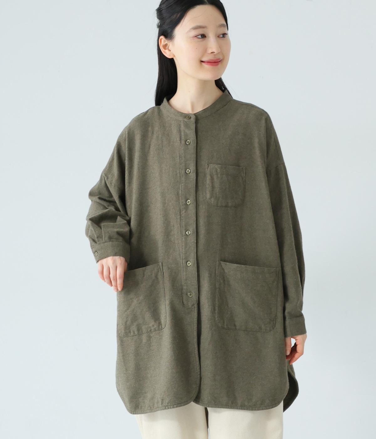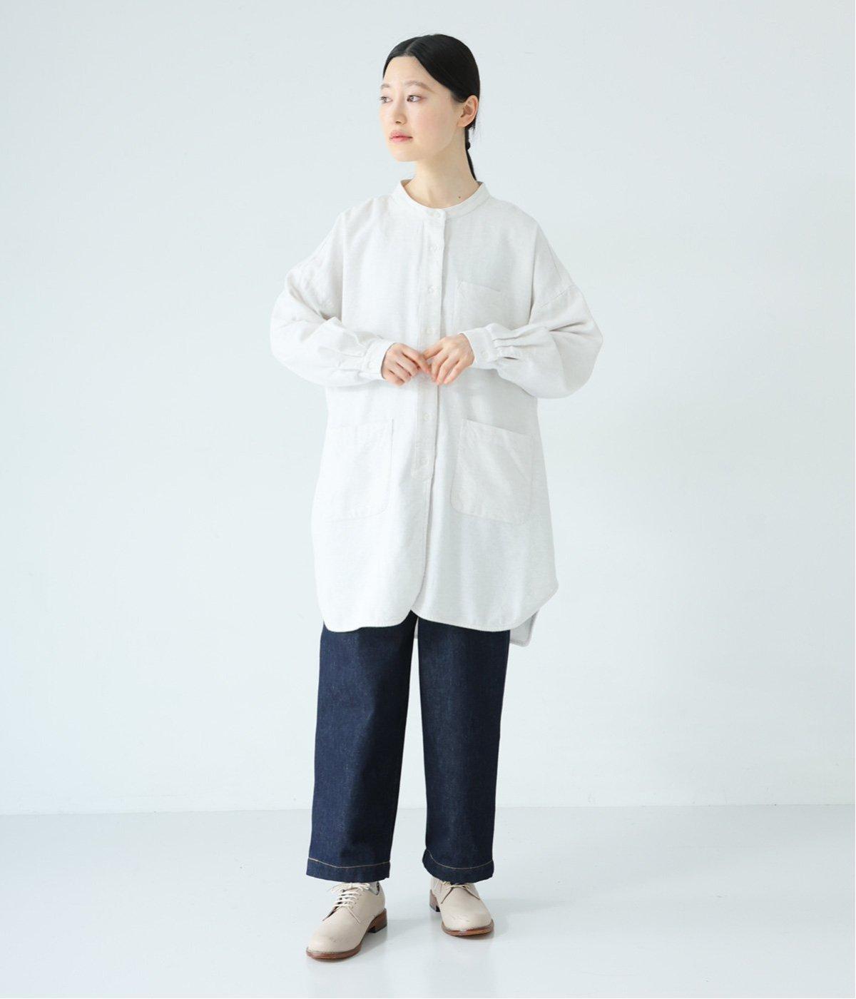 リラクシーなシルエットときちんと感のあるバンドカラーが特徴のアトリエシャツ。お尻をすっぽりと隠す安心感のある着丈が魅力です。フロントにはワーク感ただよう3つのパッチポケットを配置。タックを入れてふっくらとさせた袖のフォルムにも注目です。