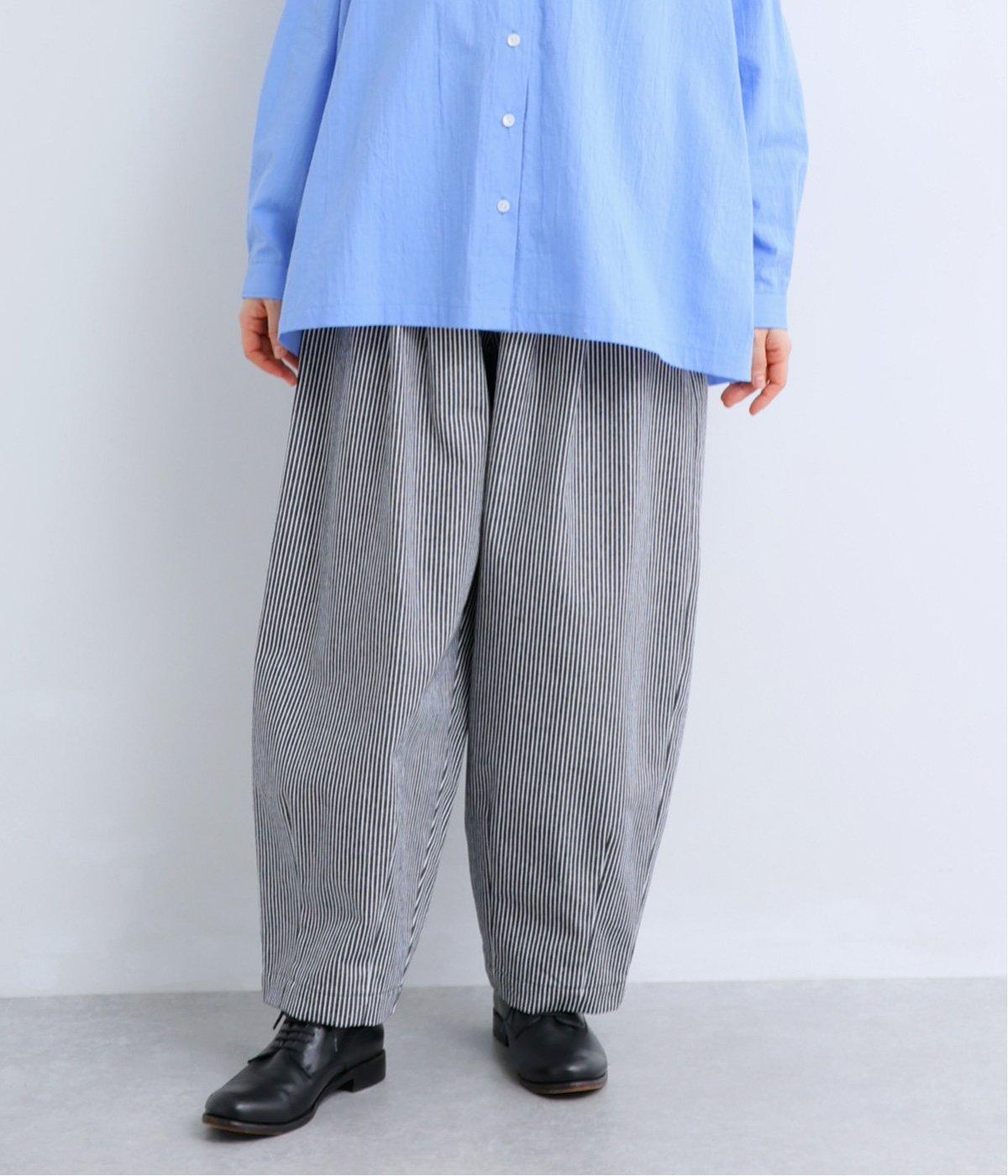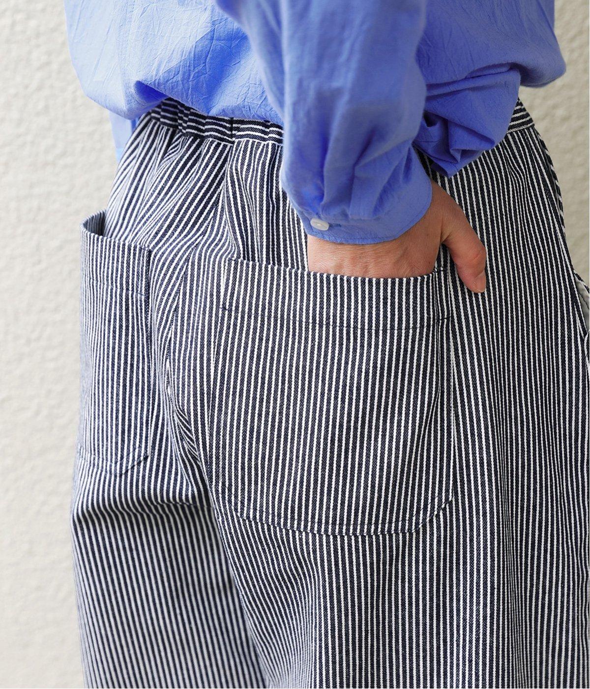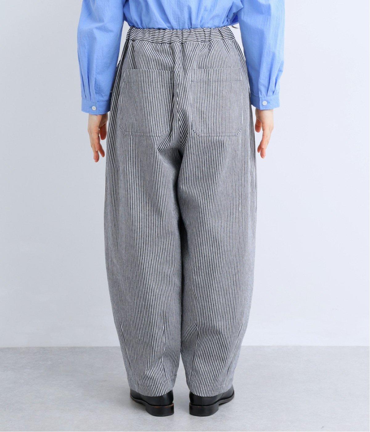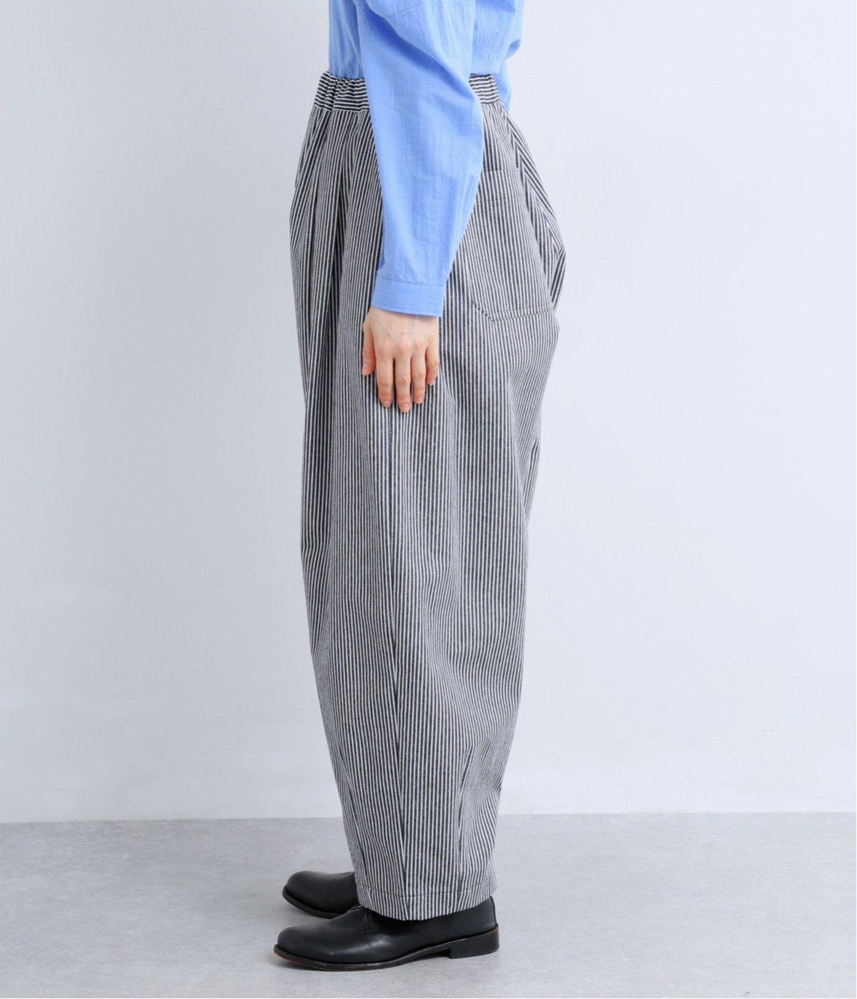ヒッコリーストライプが印象的な一枚。タックをほどこすことで腰まわりにゆとりを持たせ、リラックス感のあるはき心地に仕上げました。裾にはダーツを入れ、全体のシルエットを引き締めつつ立体感をプラス。ウエストはぐるりとゴム仕様で、締めつけ感が少なく快適です。