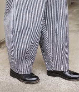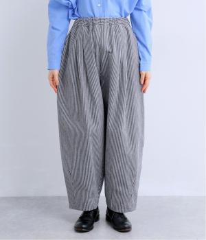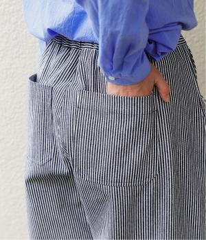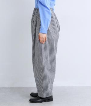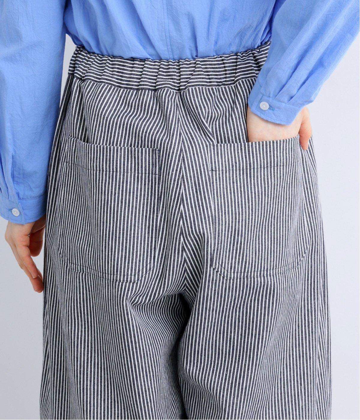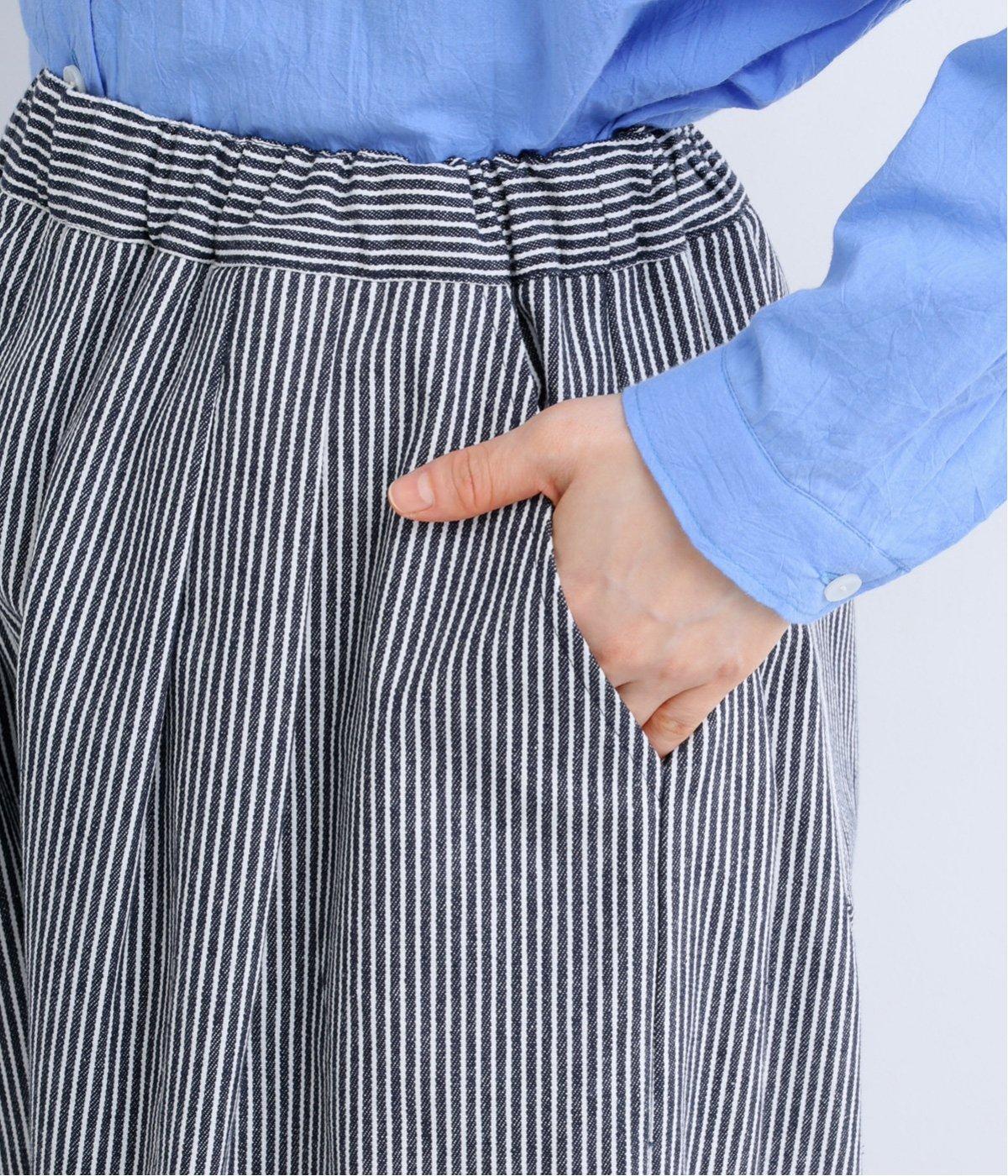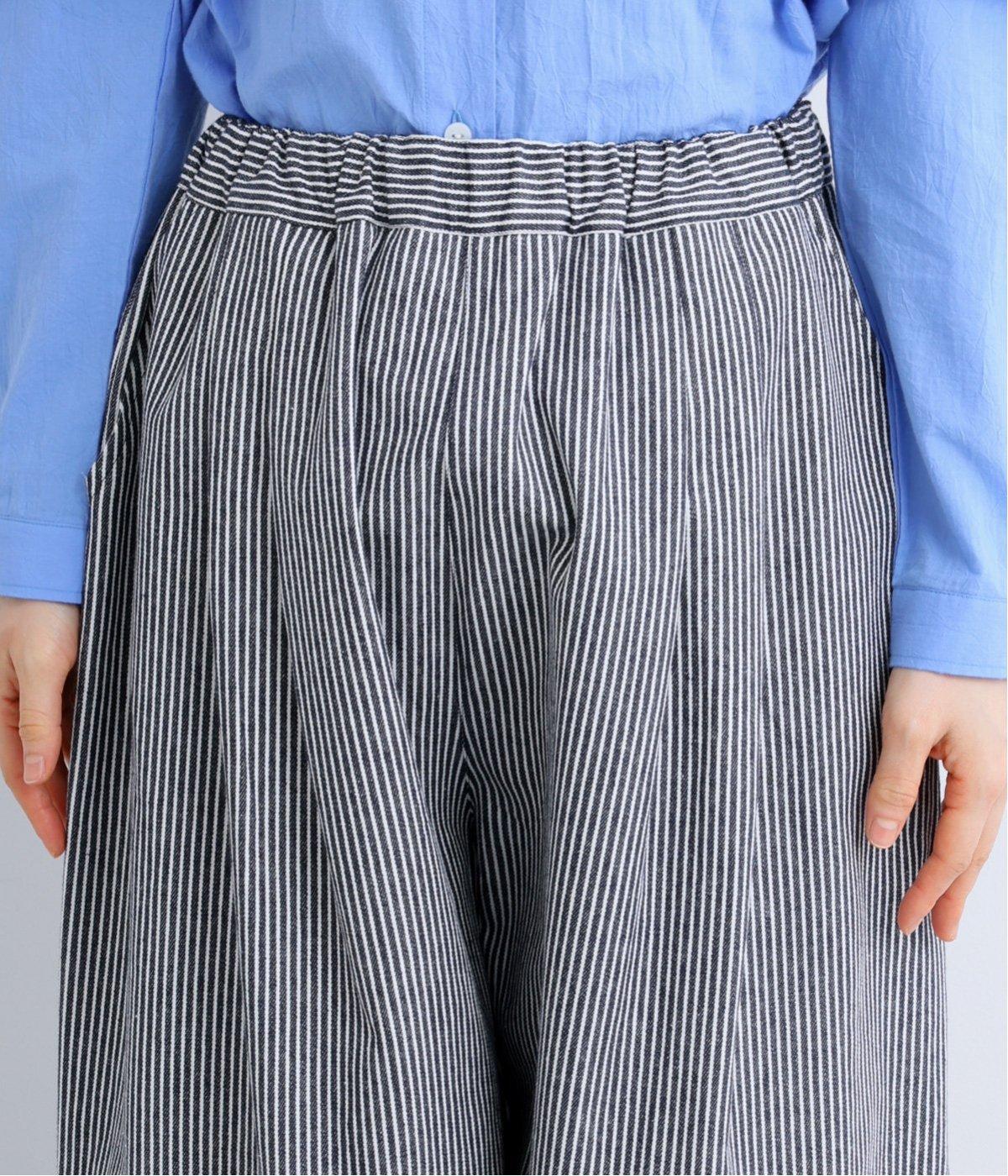 ヒッコリーストライプが印象的な一枚。タックをほどこすことで腰まわりにゆとりを持たせ、リラックス感のあるはき心地に仕上げました。裾にはダーツを入れ、全体のシルエットを引き締めつつ立体感をプラス。ウエストはぐるりとゴム仕様で、締めつけ感が少なく快適です。
