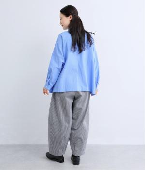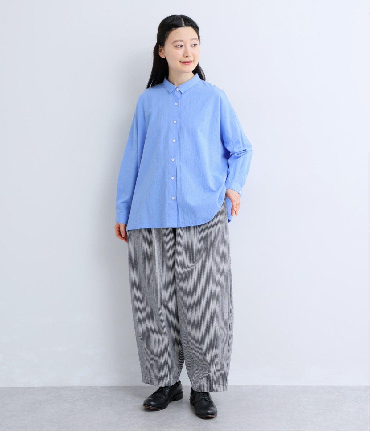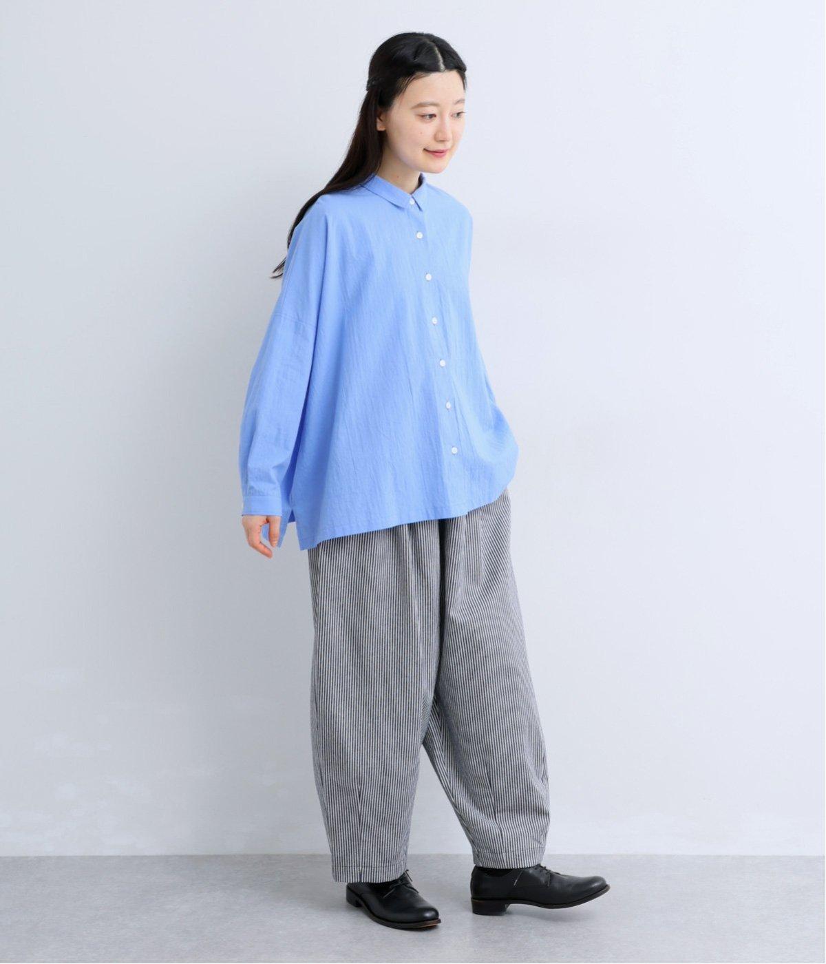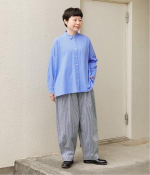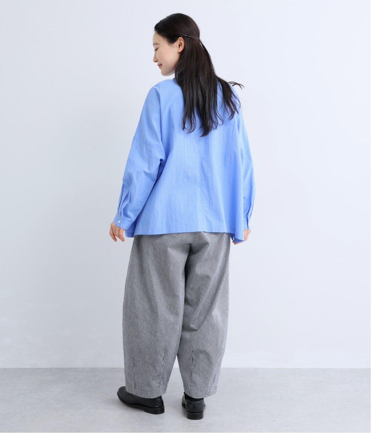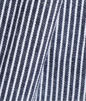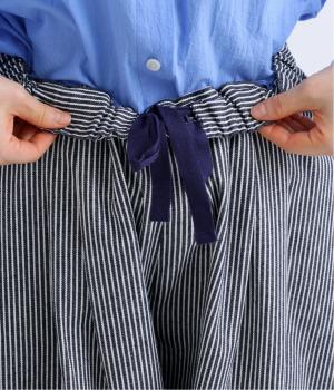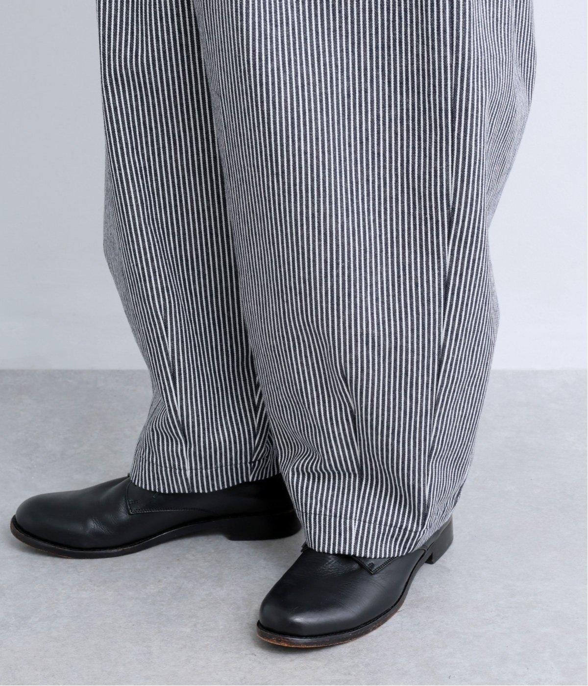 ヒッコリーストライプが印象的な一枚。タックをほどこすことで腰まわりにゆとりを持たせ、リラックス感のあるはき心地に仕上げました。裾にはダーツを入れ、全体のシルエットを引き締めつつ立体感をプラス。ウエストはぐるりとゴム仕様で、締めつけ感が少なく快適です。